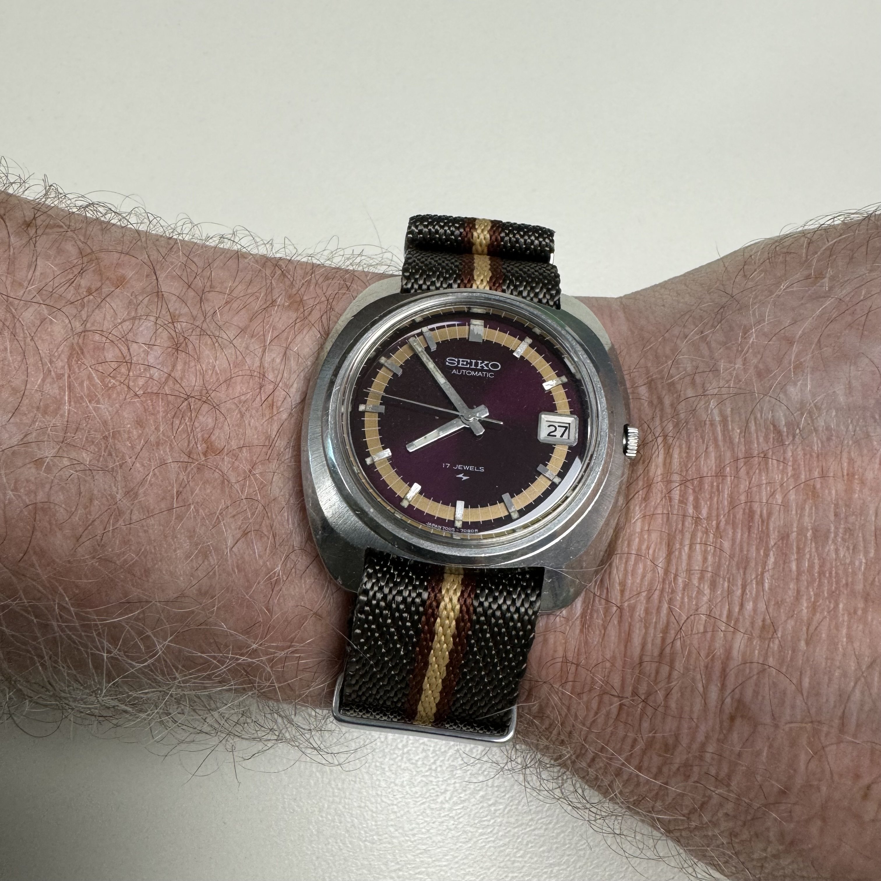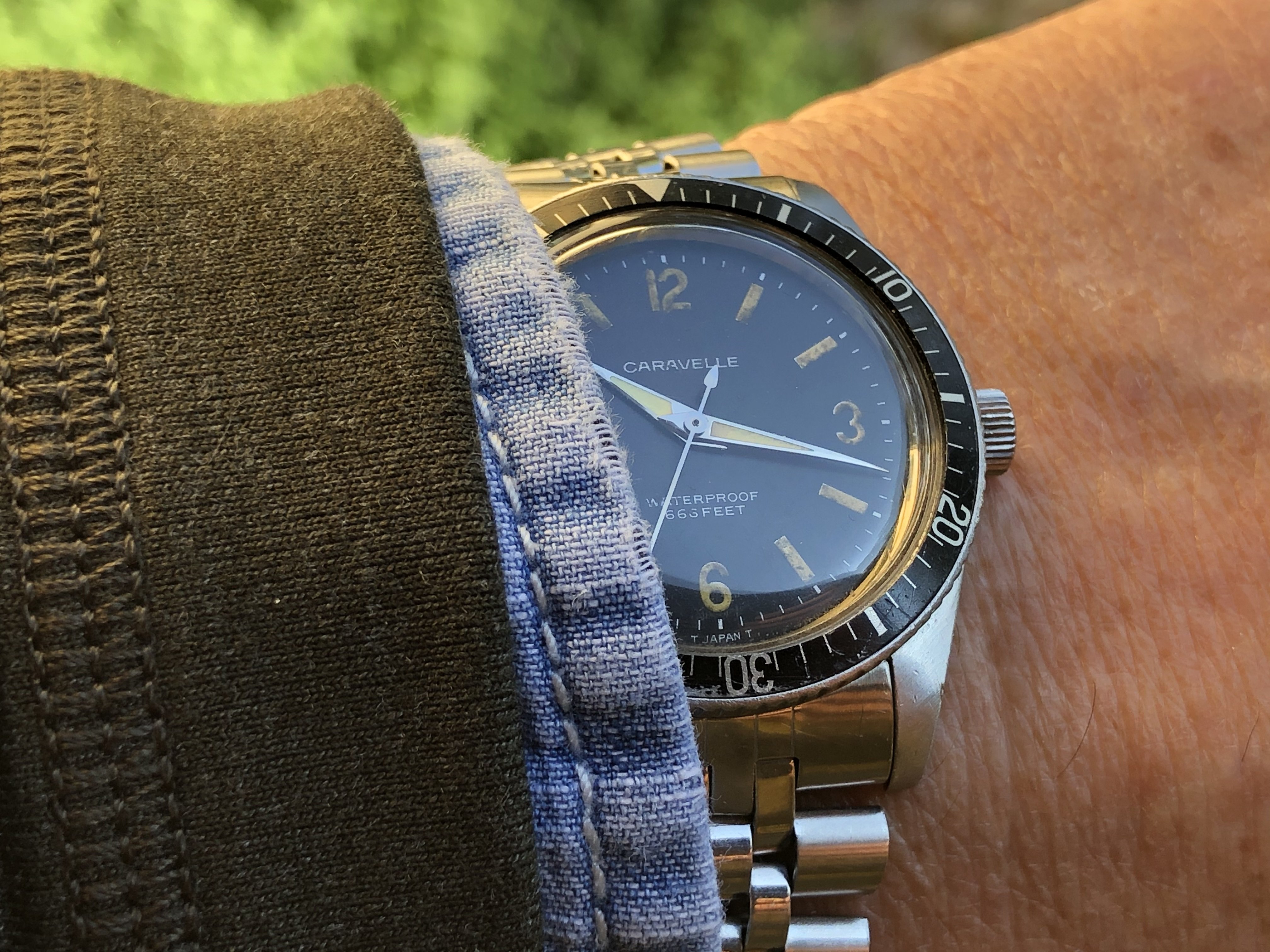 ·Bulova had some of the best watch advertising back in the late 60’s and early 70’s! - 1969 Caravelle Sea Hunter (by Bulova) Ref. 41585 - powered by Carvelle Signed 11DP (Citizen 0241) 17J manual wind movement. Fitted on the "HOLY GRAIL" of Caravelle bracelets, the full coffin link by Bulova with Caravelle signed clasp! Not overly expensive back in 1969 at $29.95, but supercool to see this Playboy advertisement which references picking one up at the PX!