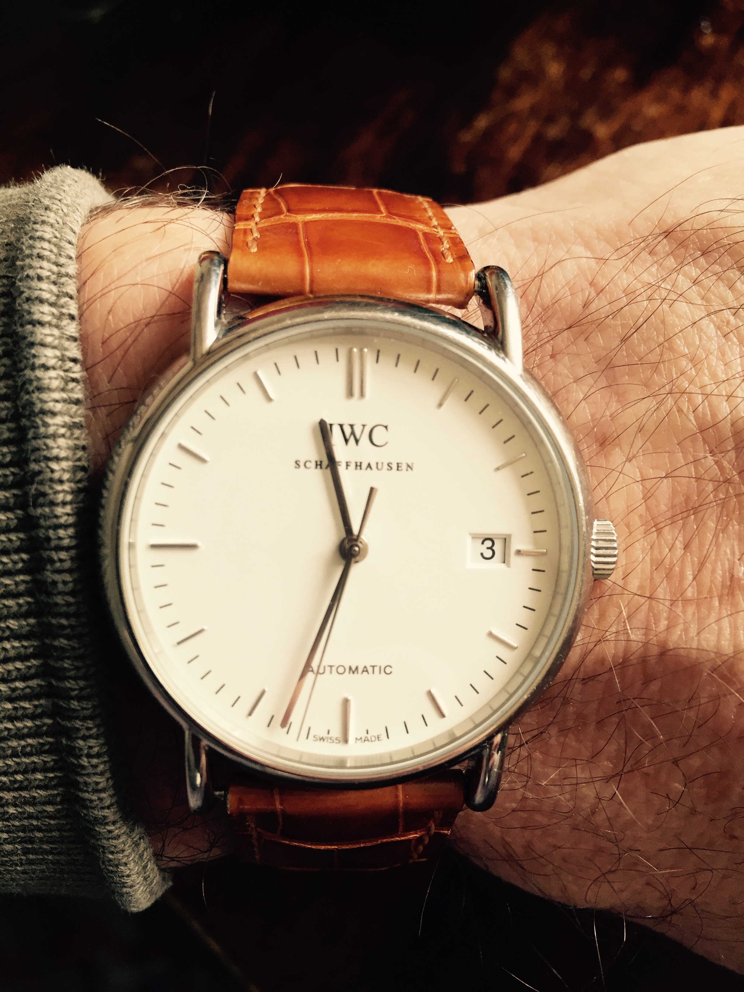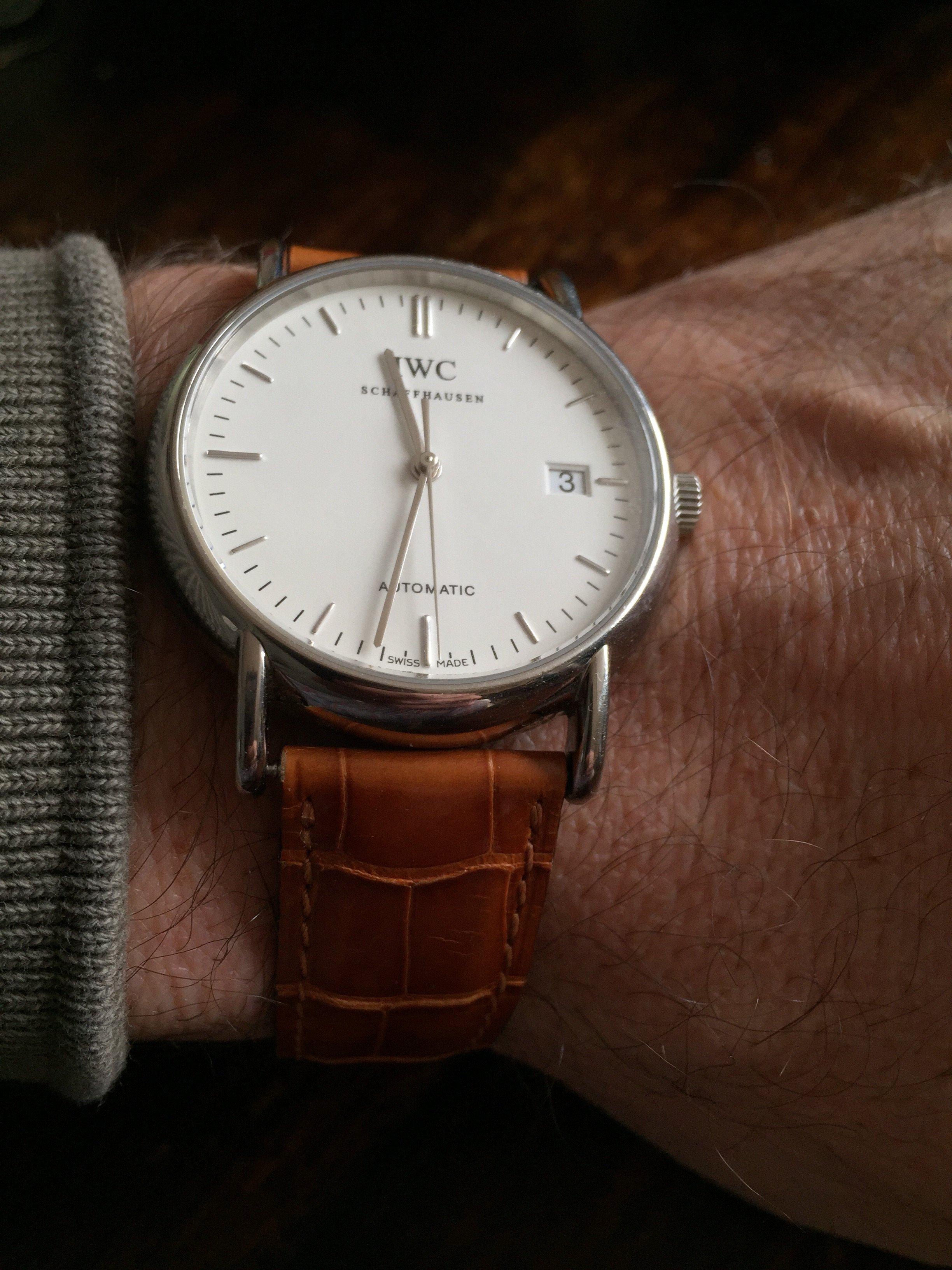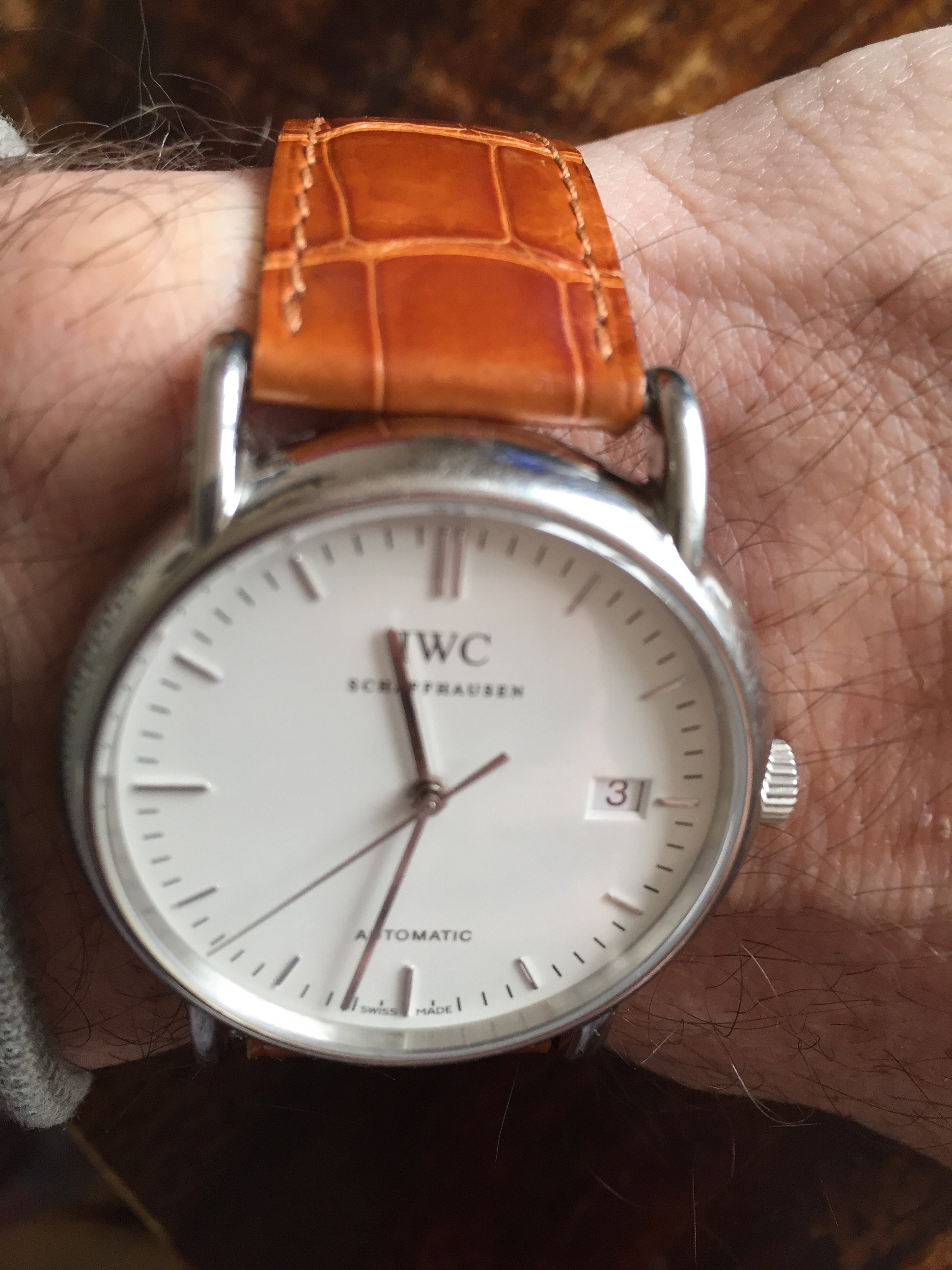 New combo. I tool the OEM Cartier band for the Louis C Tank since I don't like it on gold and tried it on the Portofino. I'm surprised and maybe looking for an IWC caramel or brandy croc