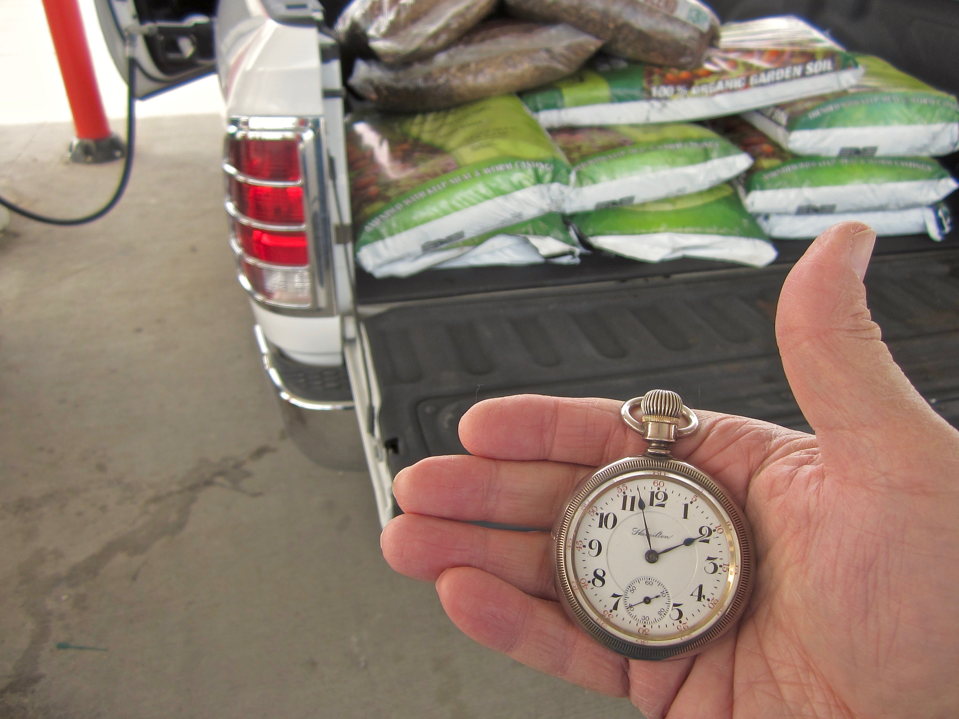 The "beater" chores watch choice for Saturday chores is the 115 year old 23-Jewel Hamilton 946 in its silver case . Been to the garden center and gassing up in anticipation of a Norther blowing into North Texas in a couple of hours. Hoping to get some mulch around the base of the fig trees before dark.