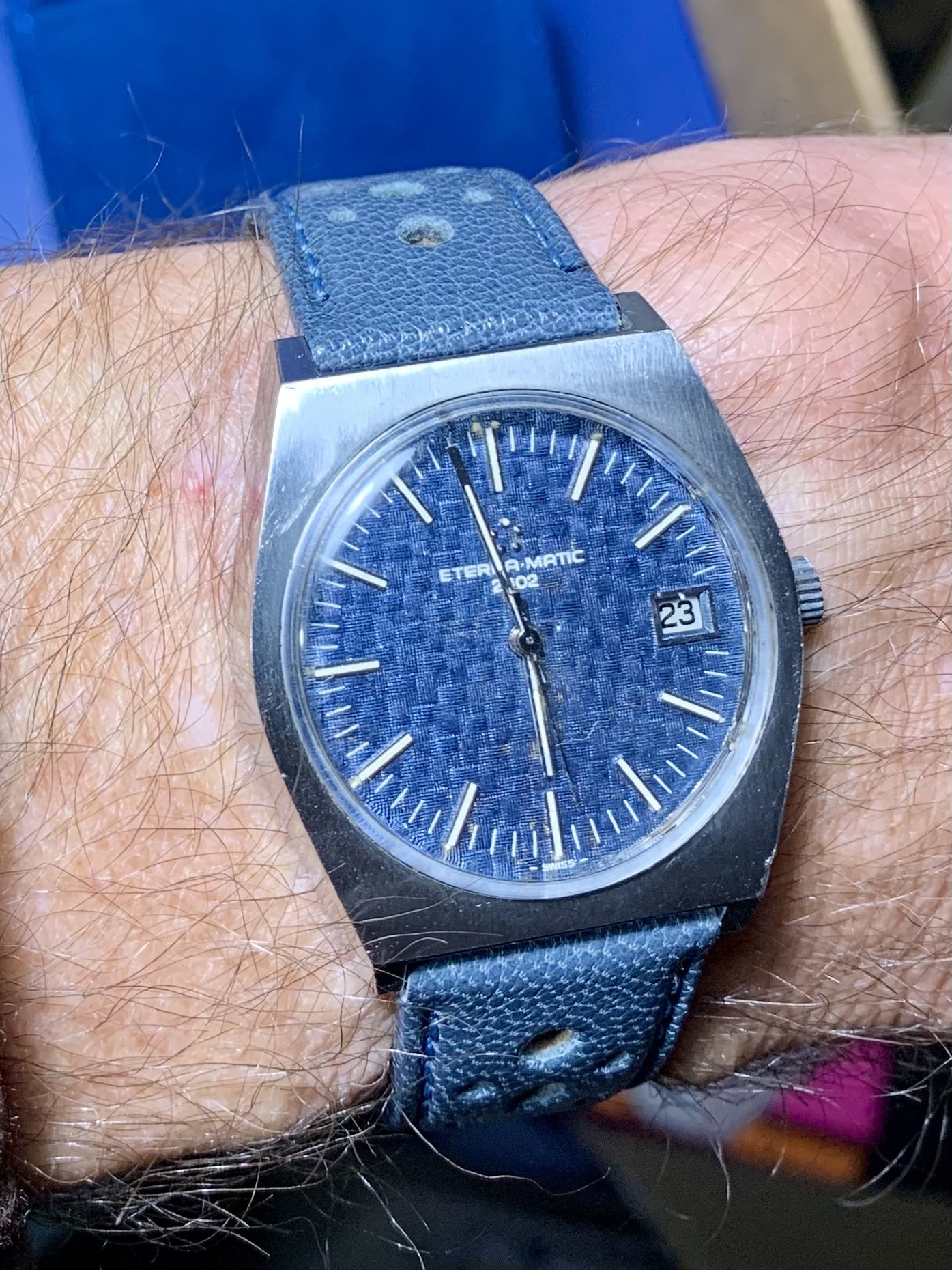 Blue dial Monday. 1973 tapis dial Eterna on Wash blue driver strap from www.rallystraps.com