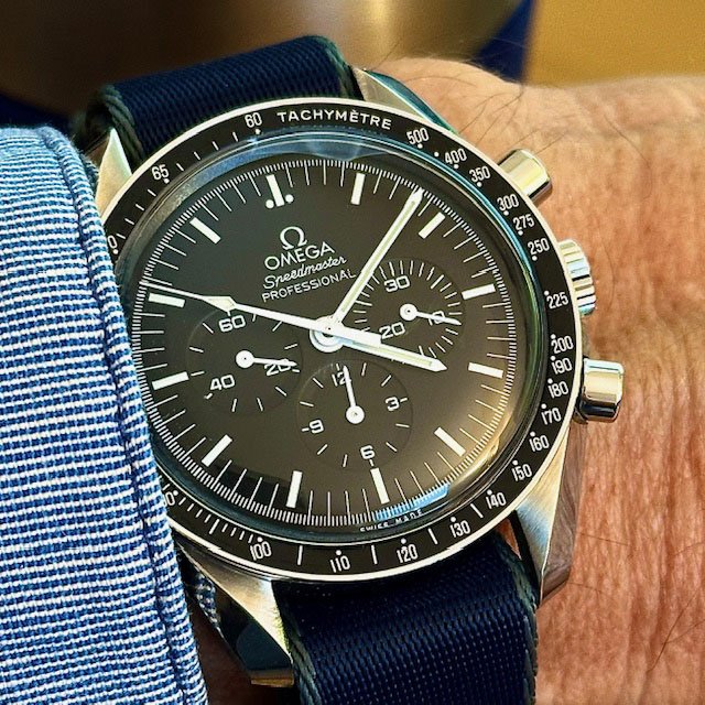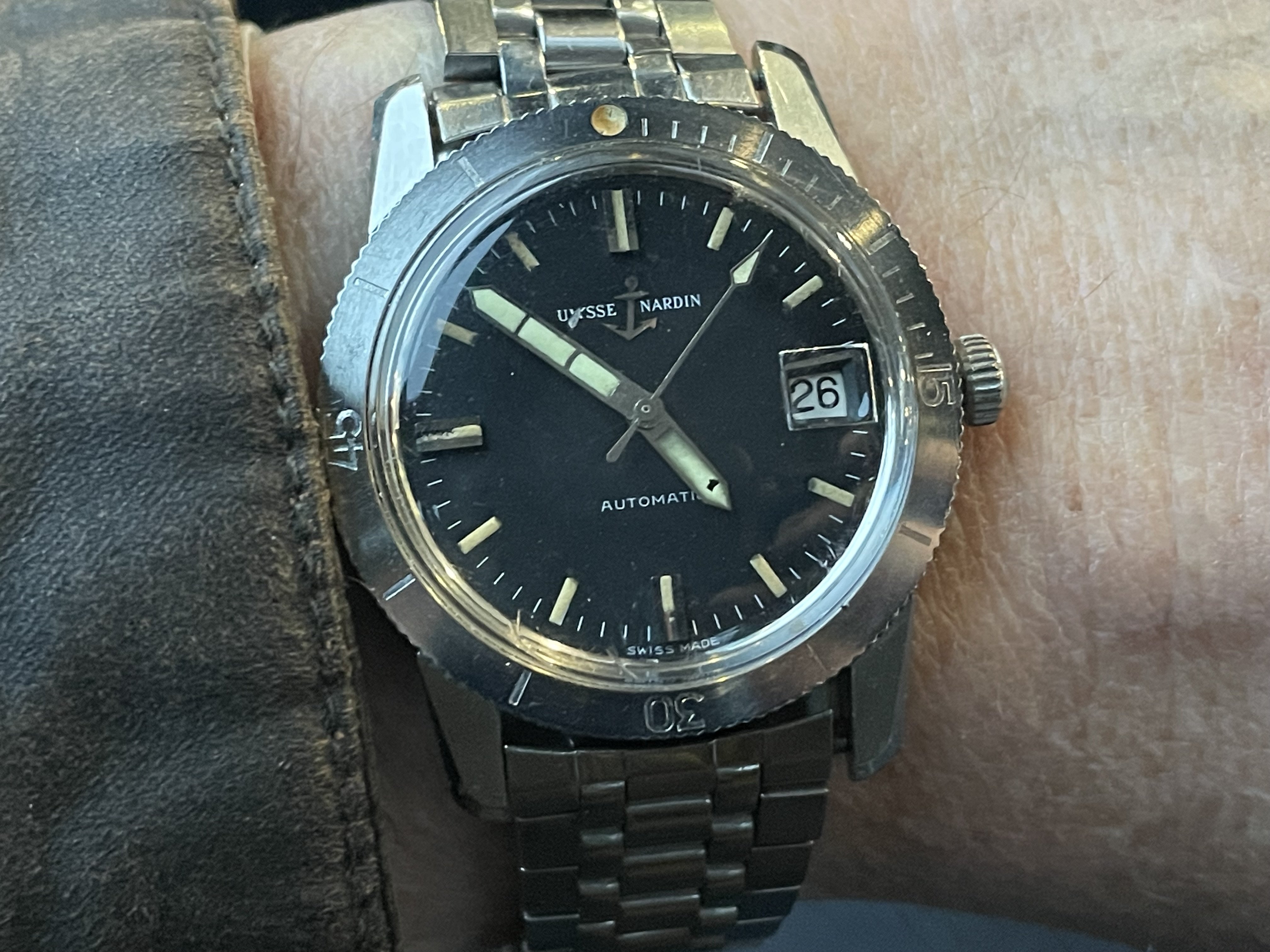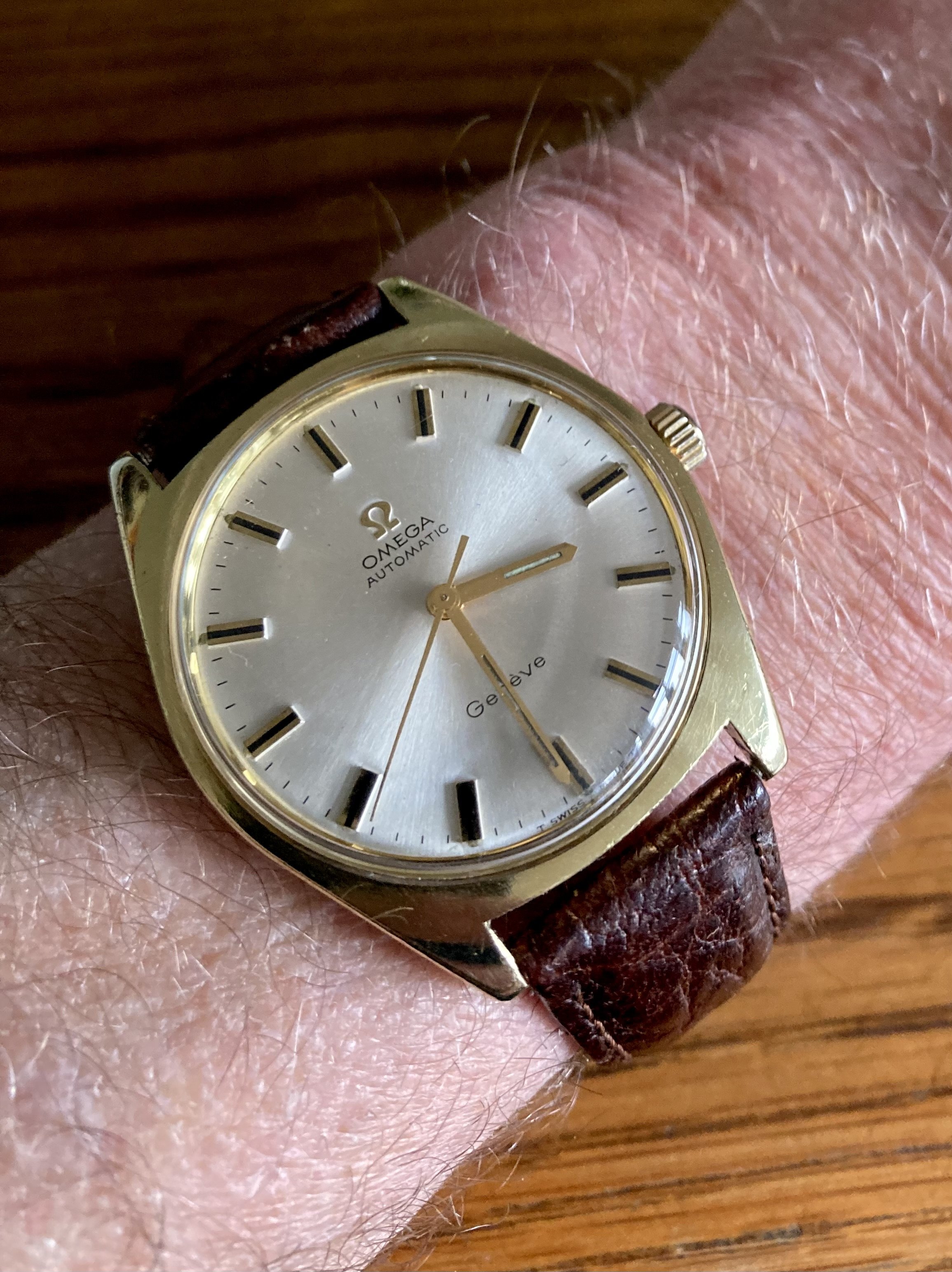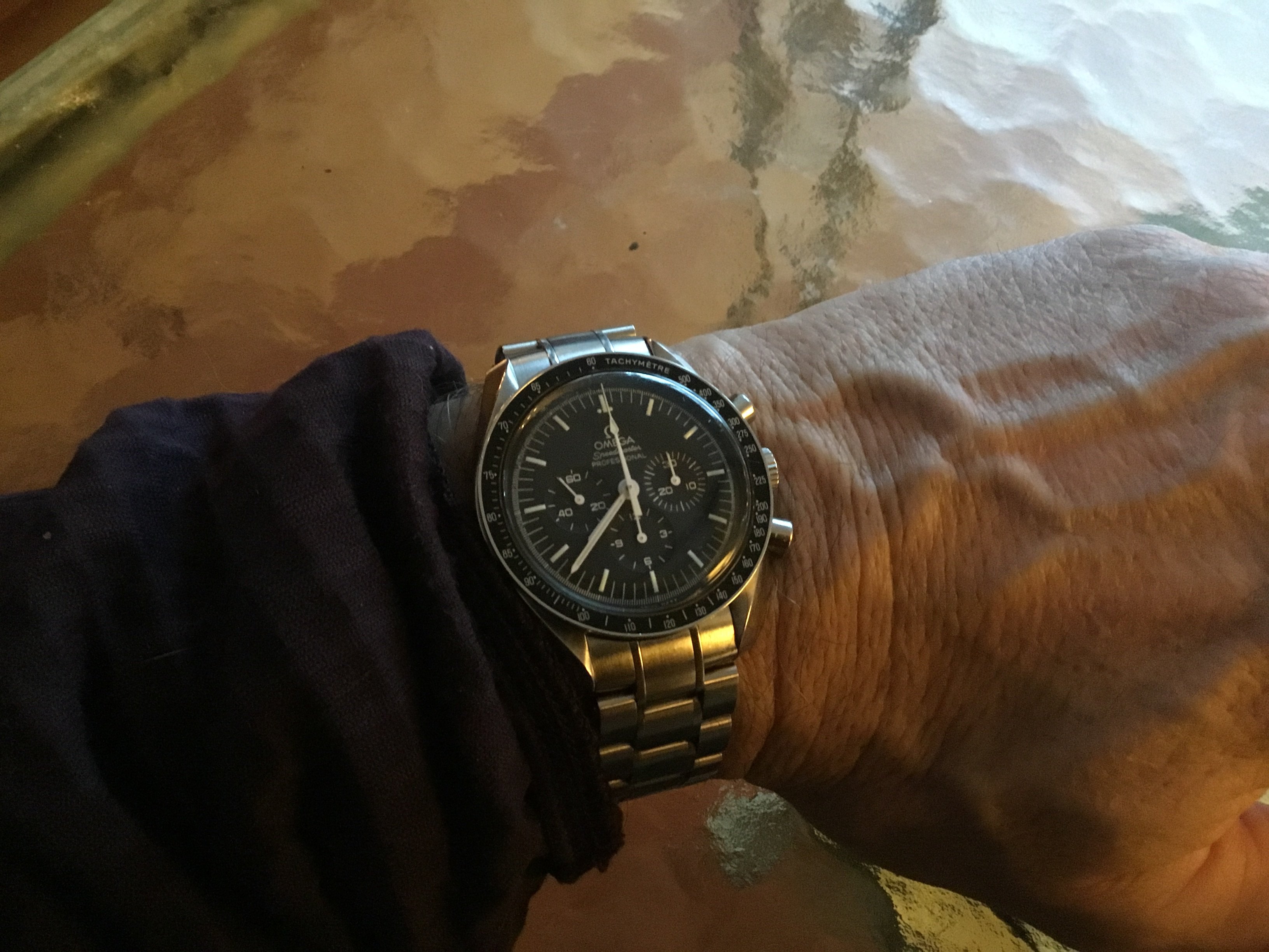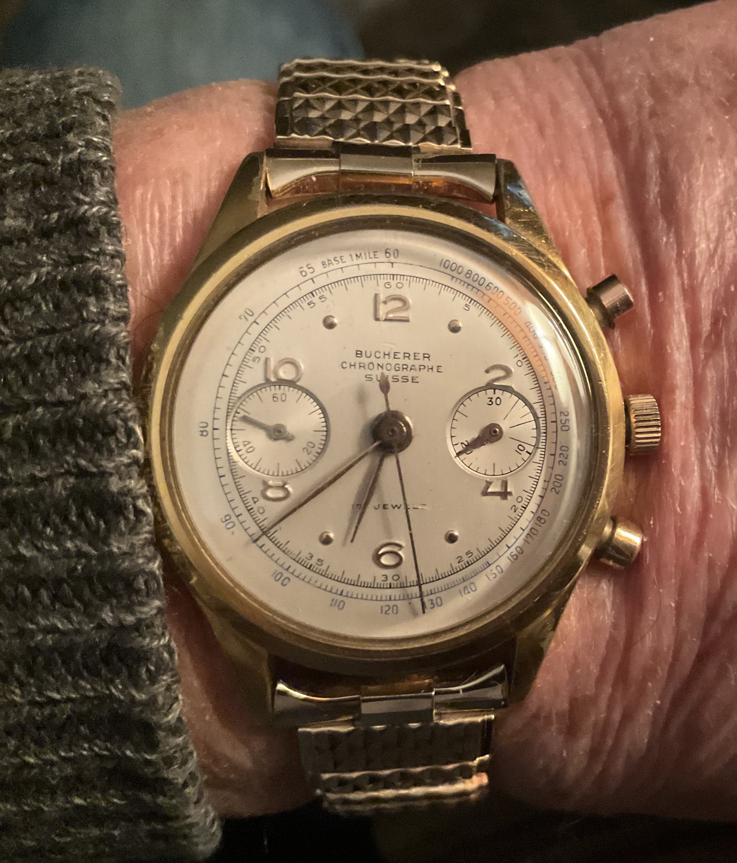 Stepping out this evening, time to change attire, and while I’m at it, my watch. This is my 60+ year old Bucherer two-register chronograph in its gold filled “clamshell” case. I’ve had this watch for ten years, but it has needed servicing, so I have seldom worn it because it was an atrocious timekeeper. I serviced the Landeron calibre 48 movement a year ago, so now it gets worn on occasion.