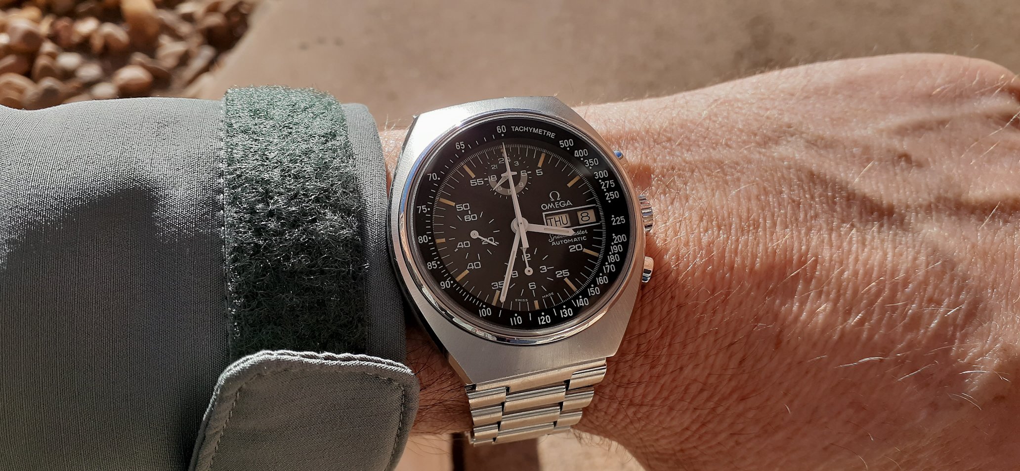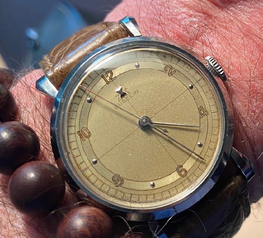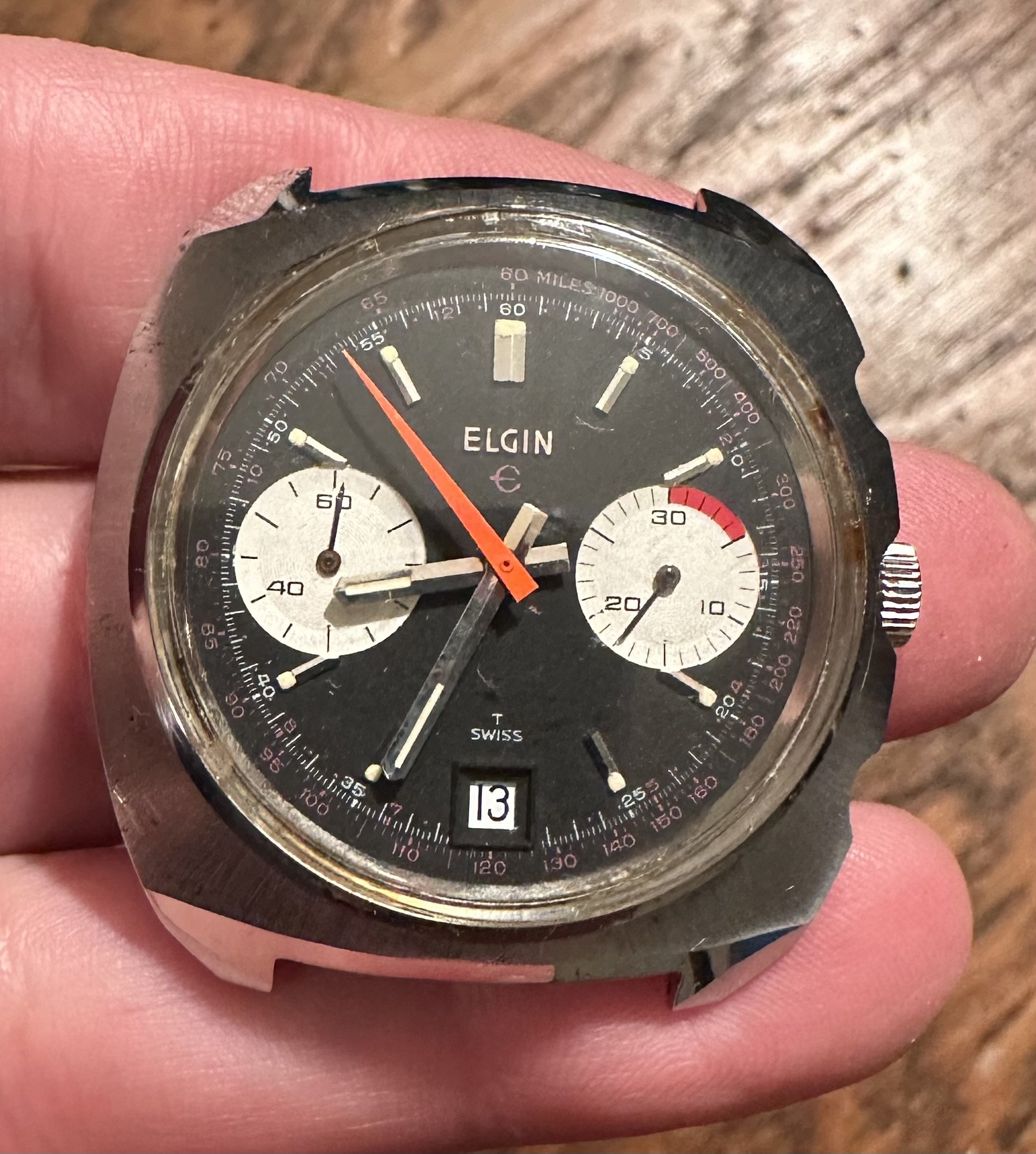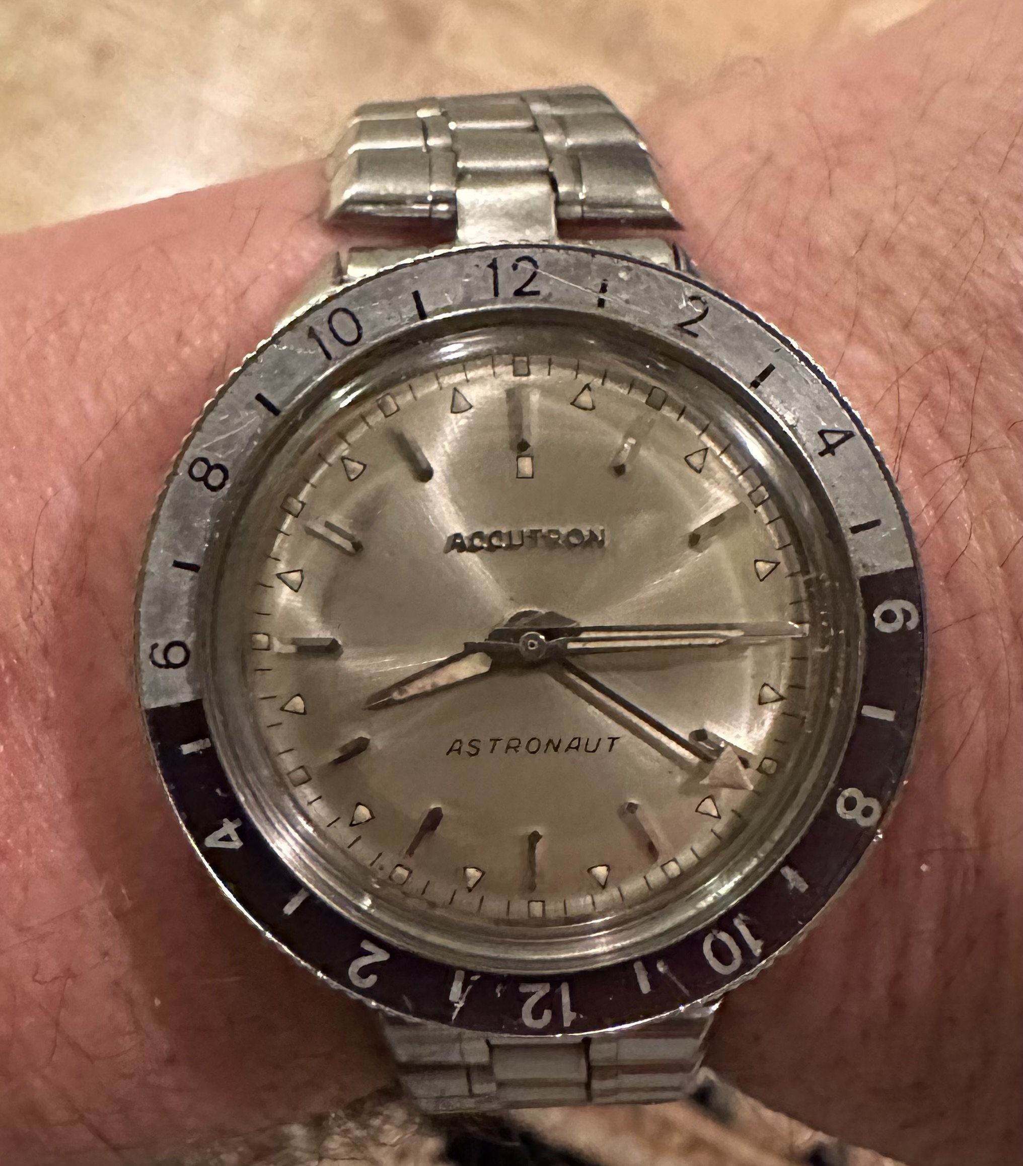 New additions. I had to remove the one good pusher on the Elgin as well as the broken one. It runs great. Rust gone. The astronaut is waiting for a crystal but cleaned up pretty well. Both dials are near perfect. I noticed too late that the Accutron is upside down. I'm guessing that will drive some of you nuts.