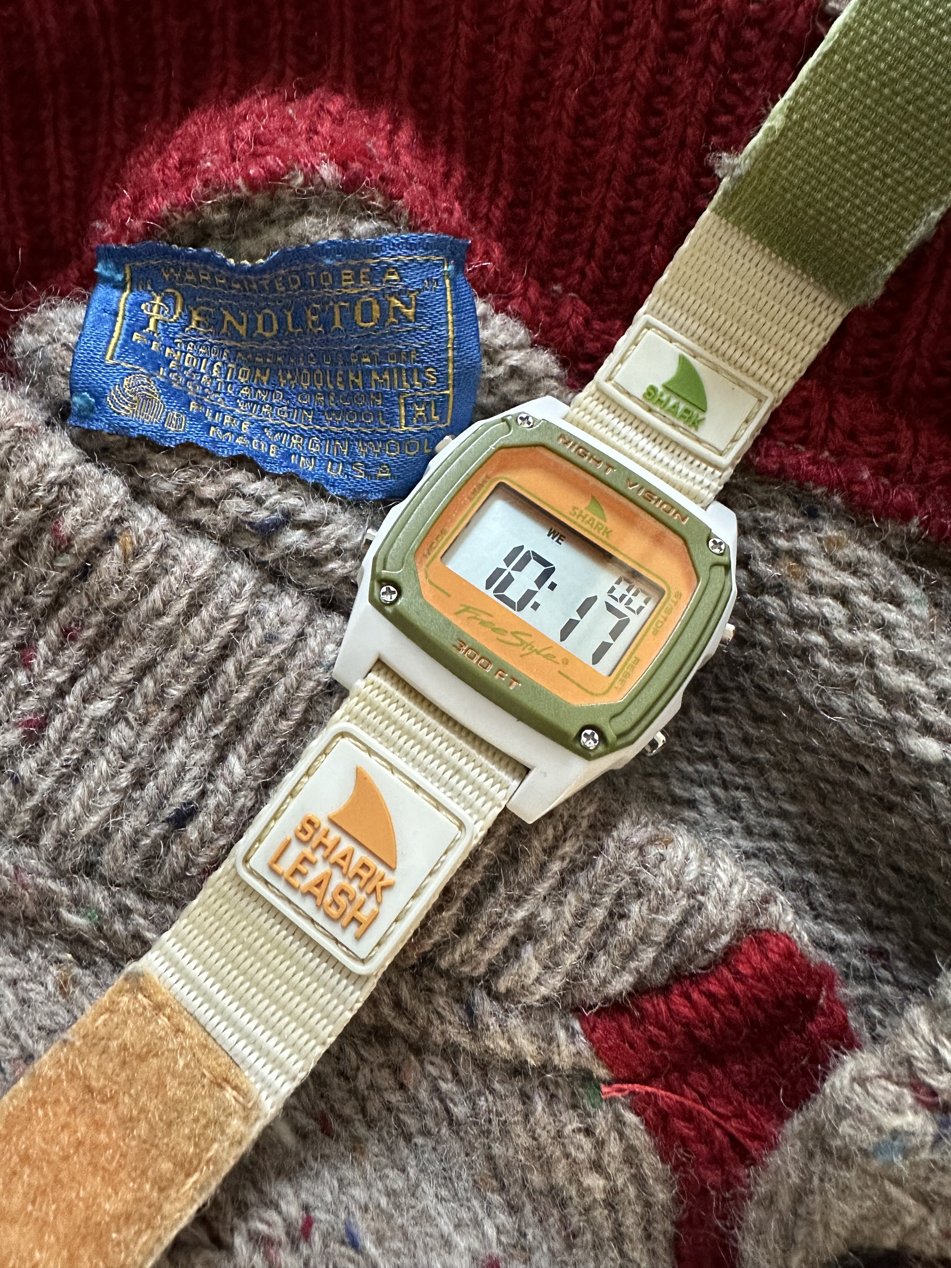 Posts 3,143 Likes 32,957 Duracuir1 ·Feb 9, 2024·Never Used A Kodak A bit of a stretch here, but these two items, the watch and the wool sweater could go together… The cheap Shark watch was originally sold in surf shops in the 1980s. And the Beach Boys, with surf inspired music… Were once known as The Pendletones…