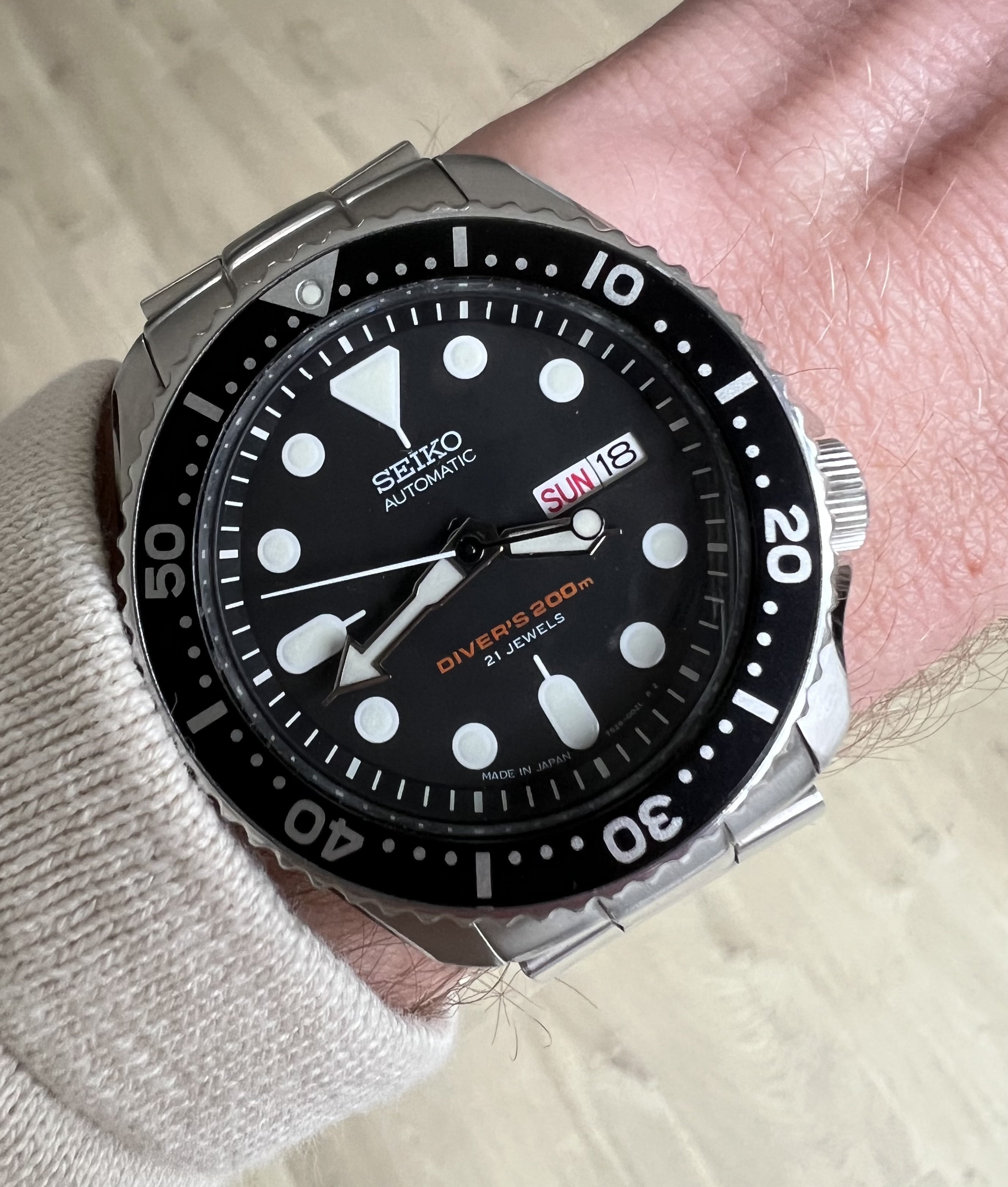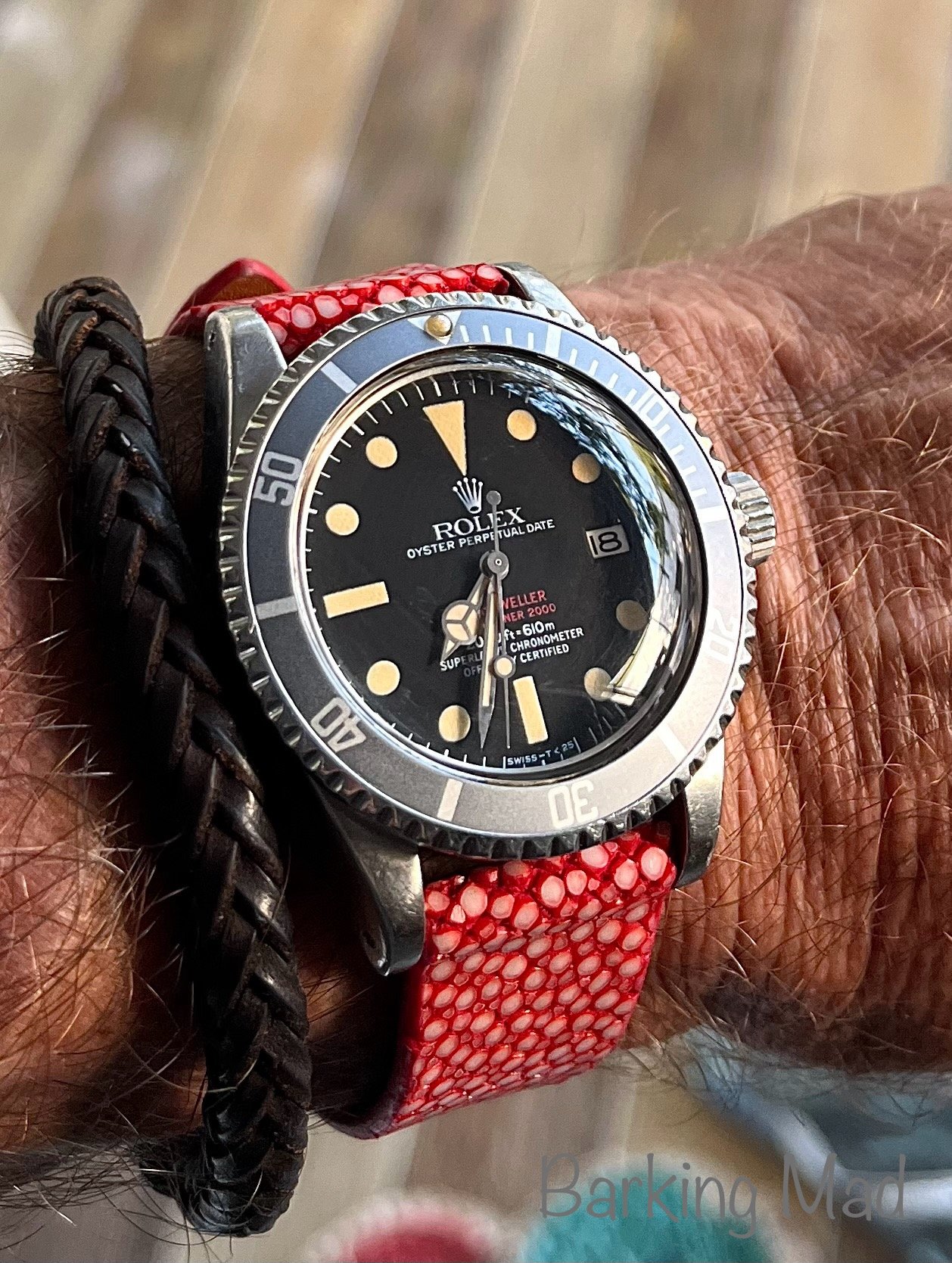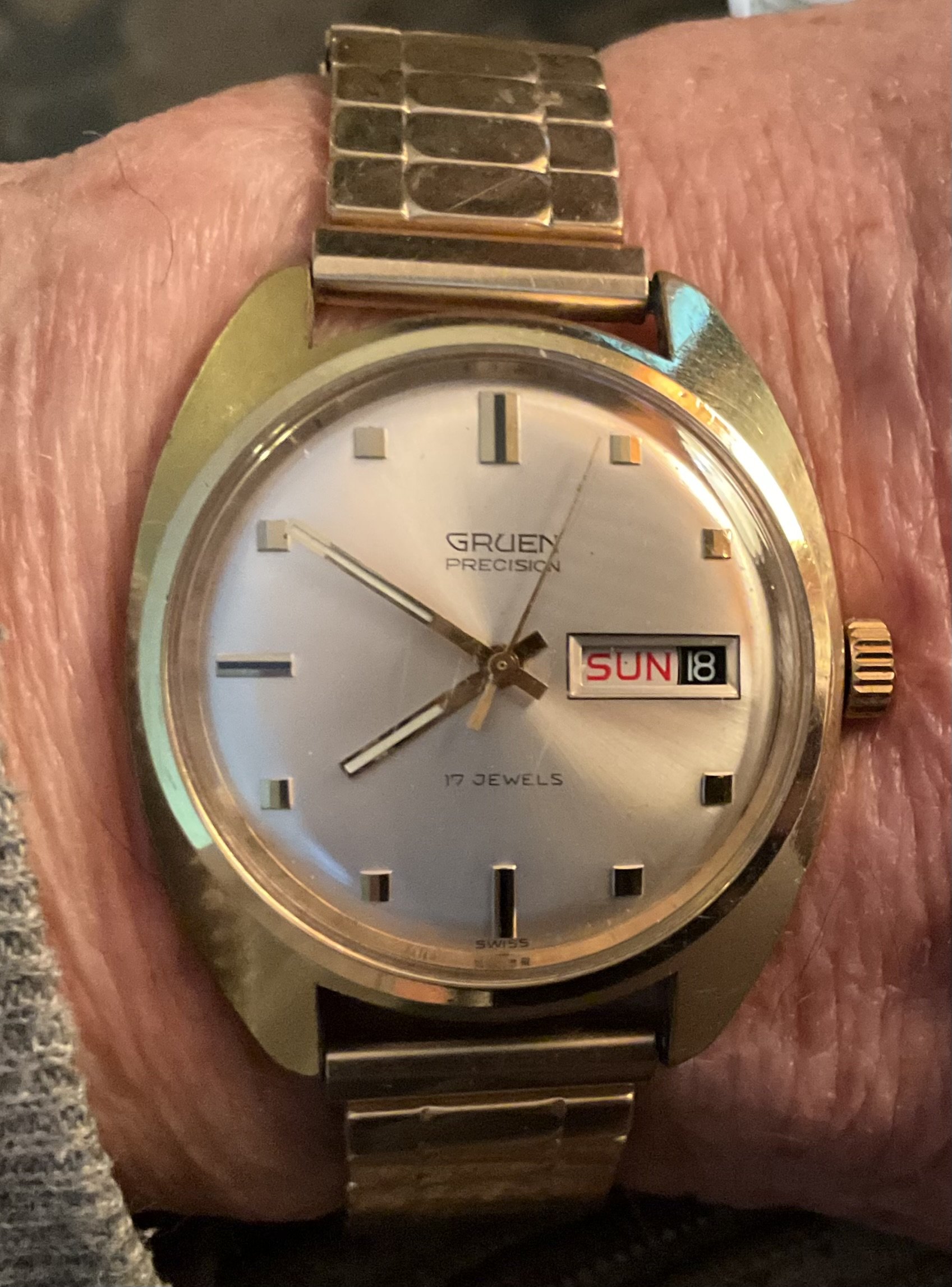This Gruen, today. A manual wind day/date. Not something often seen. I wear it so seldom that I have to retrain myself as to getting the day and date correct, every time I wear it. At the date change, the date changes first, the day very quickly thereafter. The day can be backed up, the date can’t. Set it ahead until the date is correct, then back it up until the correct DAY shows. Then continue backing up until you reach the correct TIME. A pain in the derrière to set. But I’ve worn an auto wind watch without the date for a while, and that also is a pain.