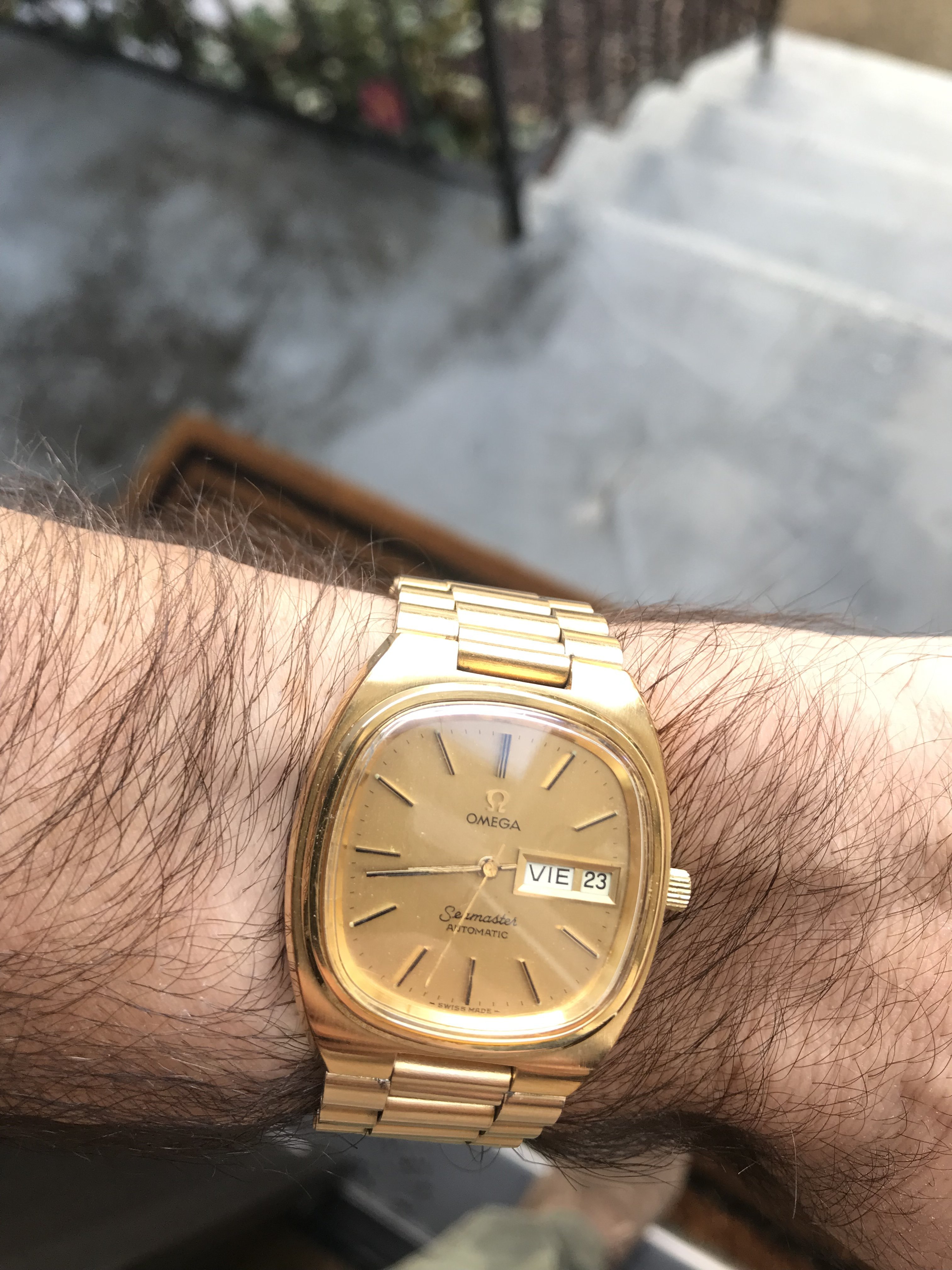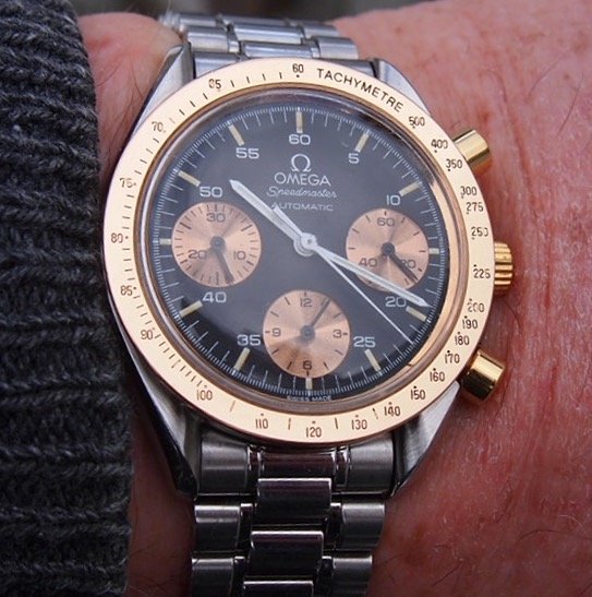 My fiddle group plays for a banquet/dance tonight. I need a watch with some “bling”, so it is the 18-karat and rose gold Omega Speedmaster reduced that will be pressed into service.