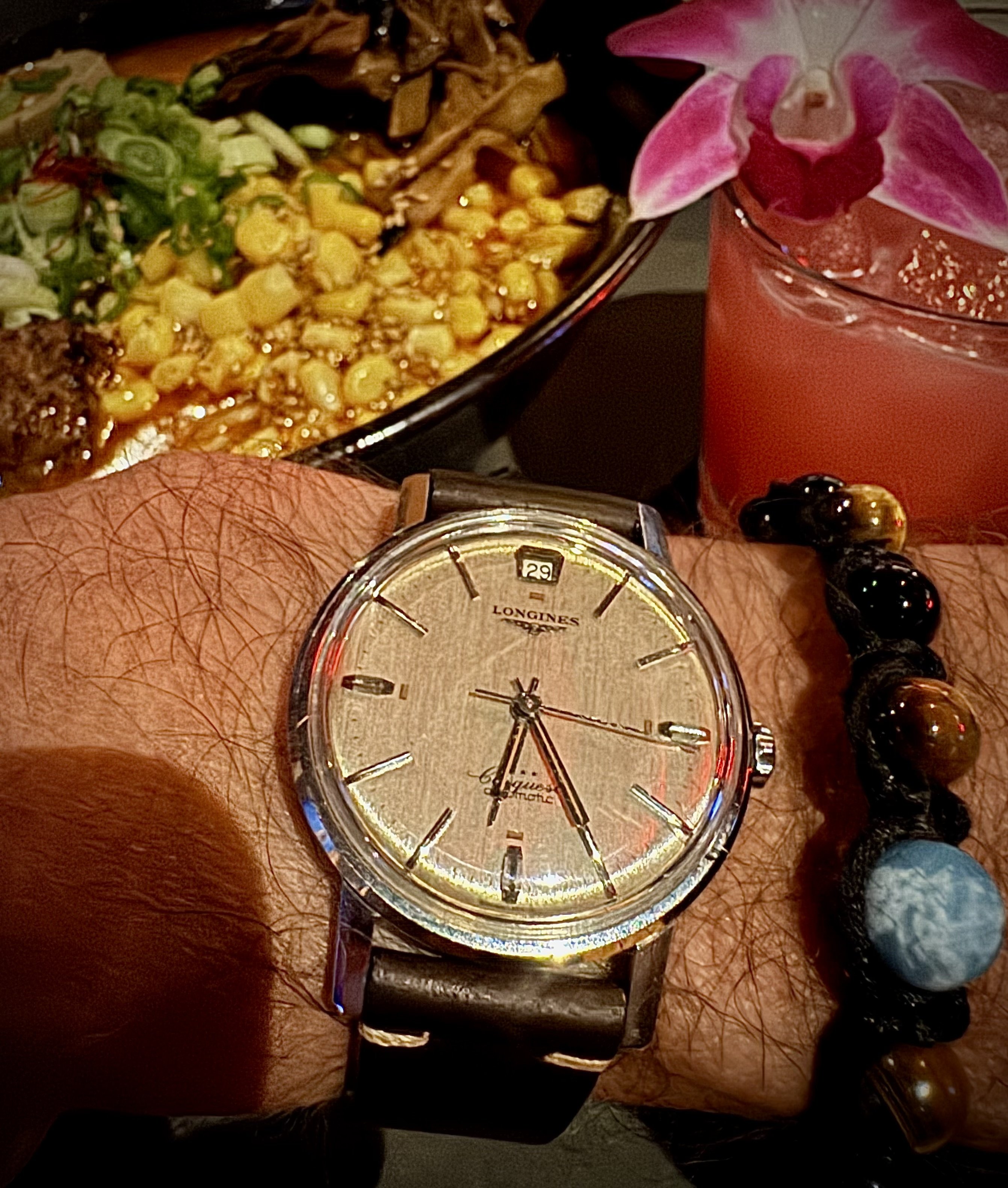 Posts 7,293 Likes 76,576 dougiedude ·Feb 29, 2024·Carpe horologium! Enjoying a relaxing Leap Day evening with the 29 @12, some yummy ramen, and a Japanese cocktail: 1960 Conquest cal 291 Kittty-friendly here as well, as the local feline, Sprout, is perfectly welcome during the sleet storm under a heat lamp on the patio! Edited: Feb 29, 2024 IMG_3162.jpeg - 2.9 MB IMG_3163.jpeg - 2.9 MB