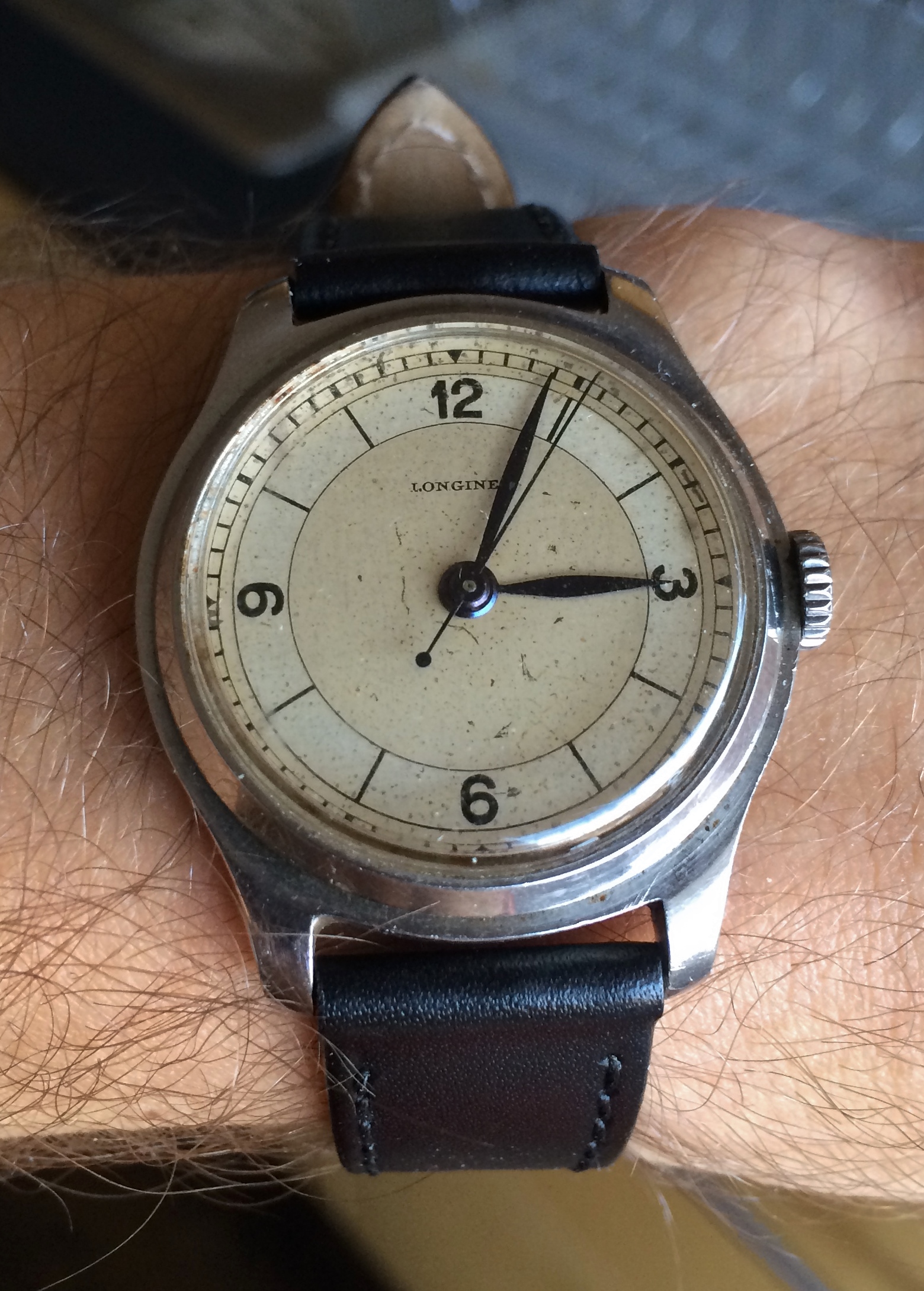 Longines in Staybrite steel from 1936 with the relatively uncommon caliber 12.91 (sorry for the crude photography)