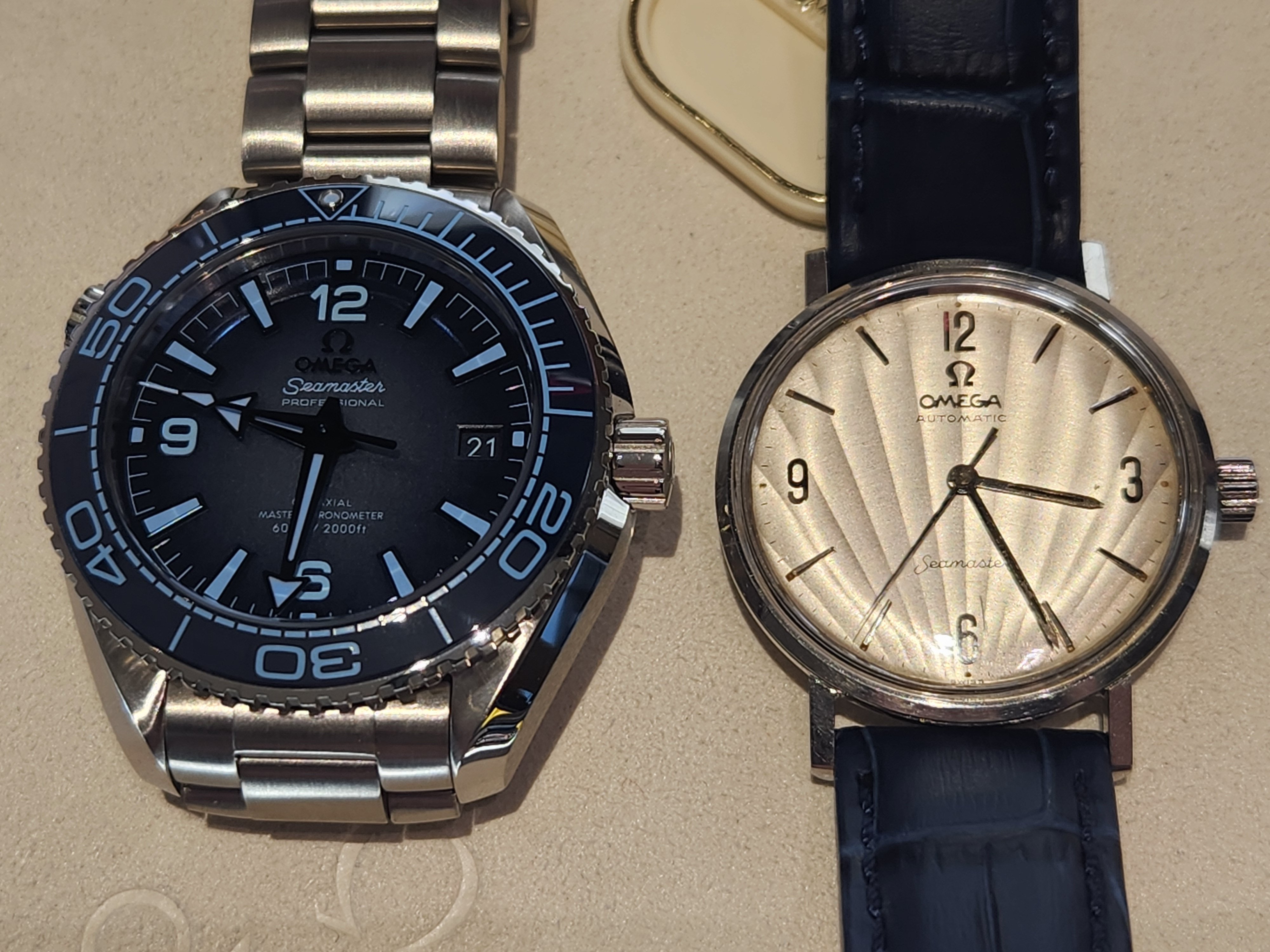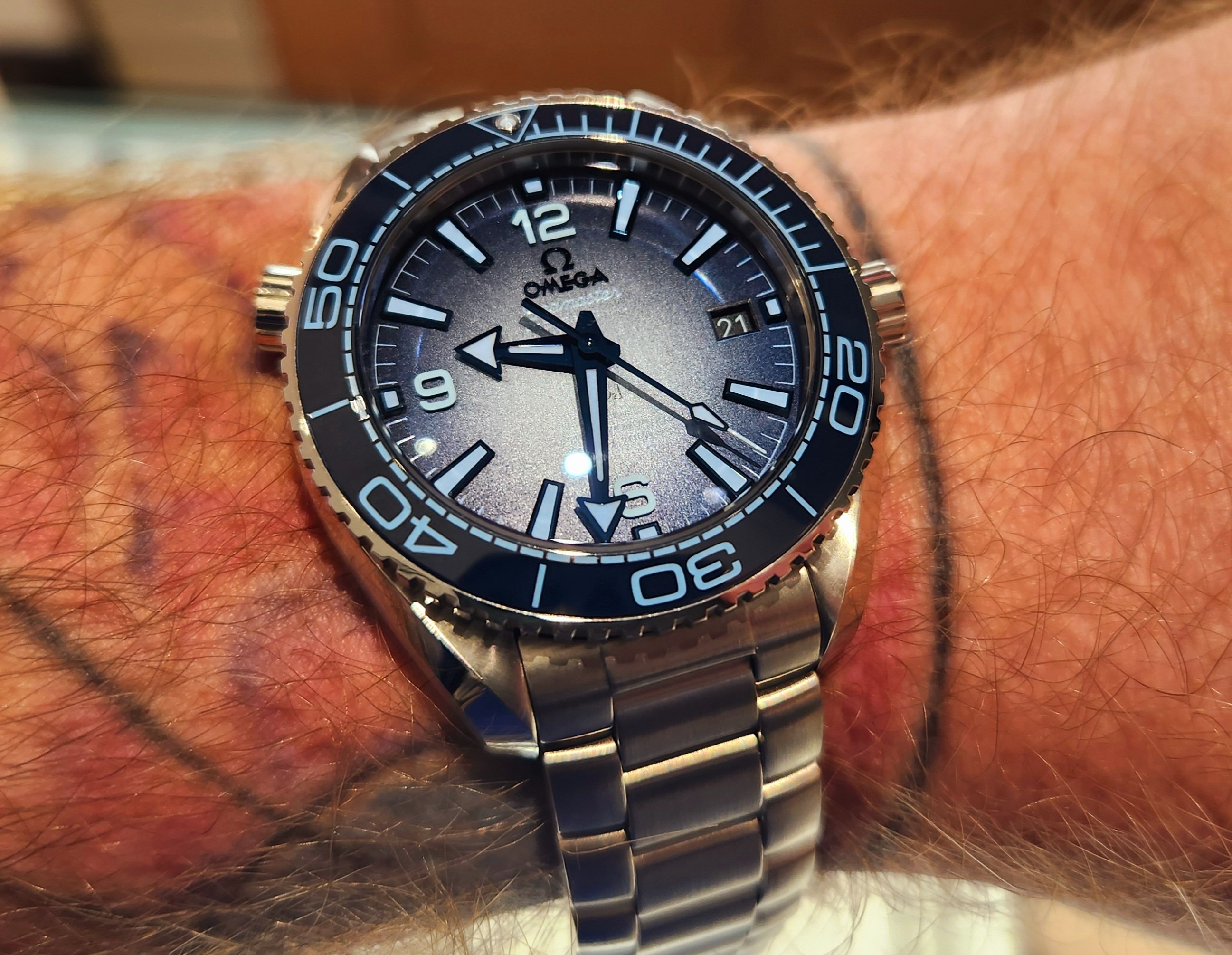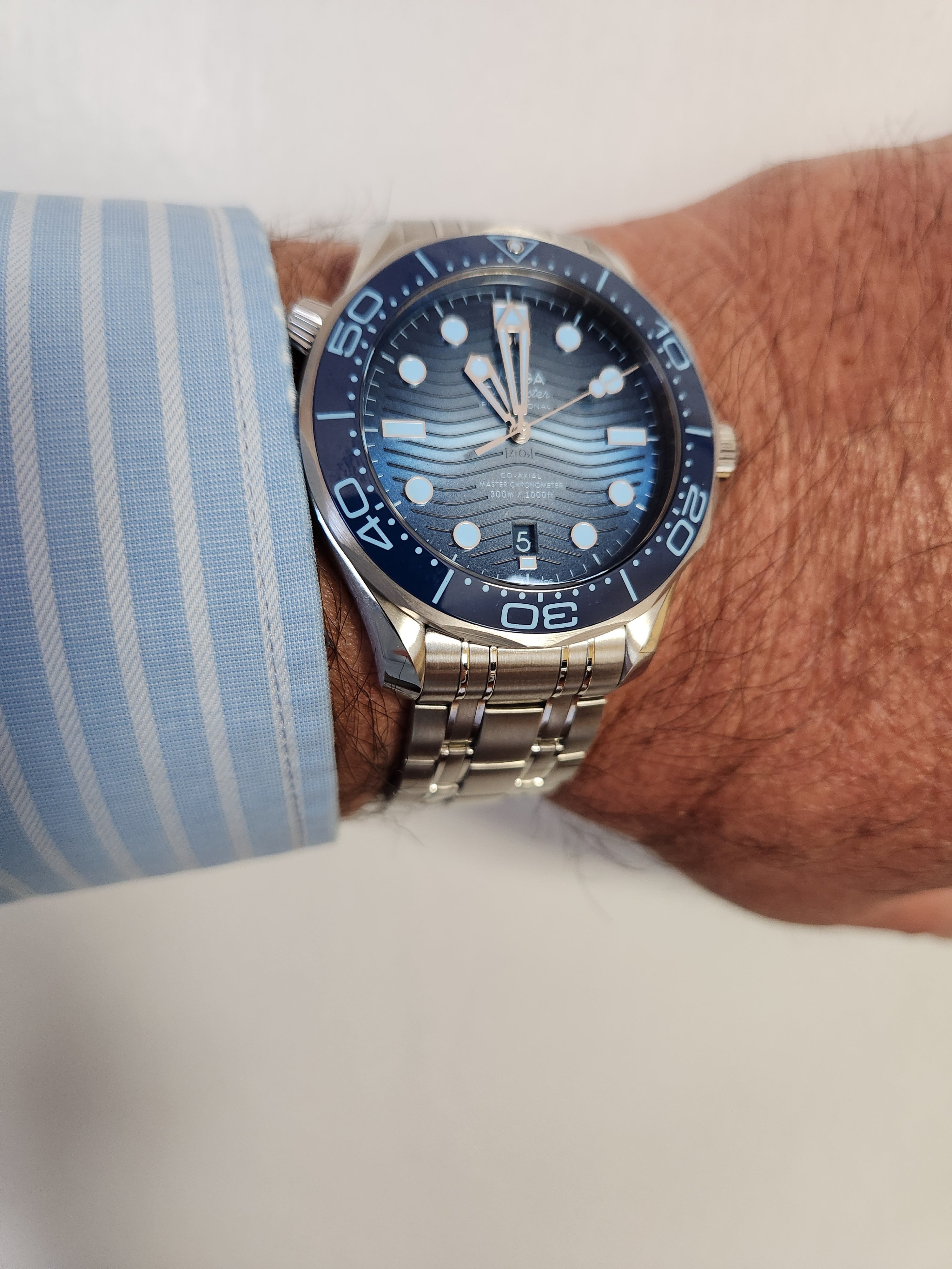 Got to try on the summer blue PO today at my AD. I swung in to try to see the new Daniel Craig speedy (no luck). I like this more than I expected to. The bracelet is fantastic! I thought 39mm would feel too small but it's lovely. Although i was wearing this baby DeVille today. Fun to see the old man next to the young lad.