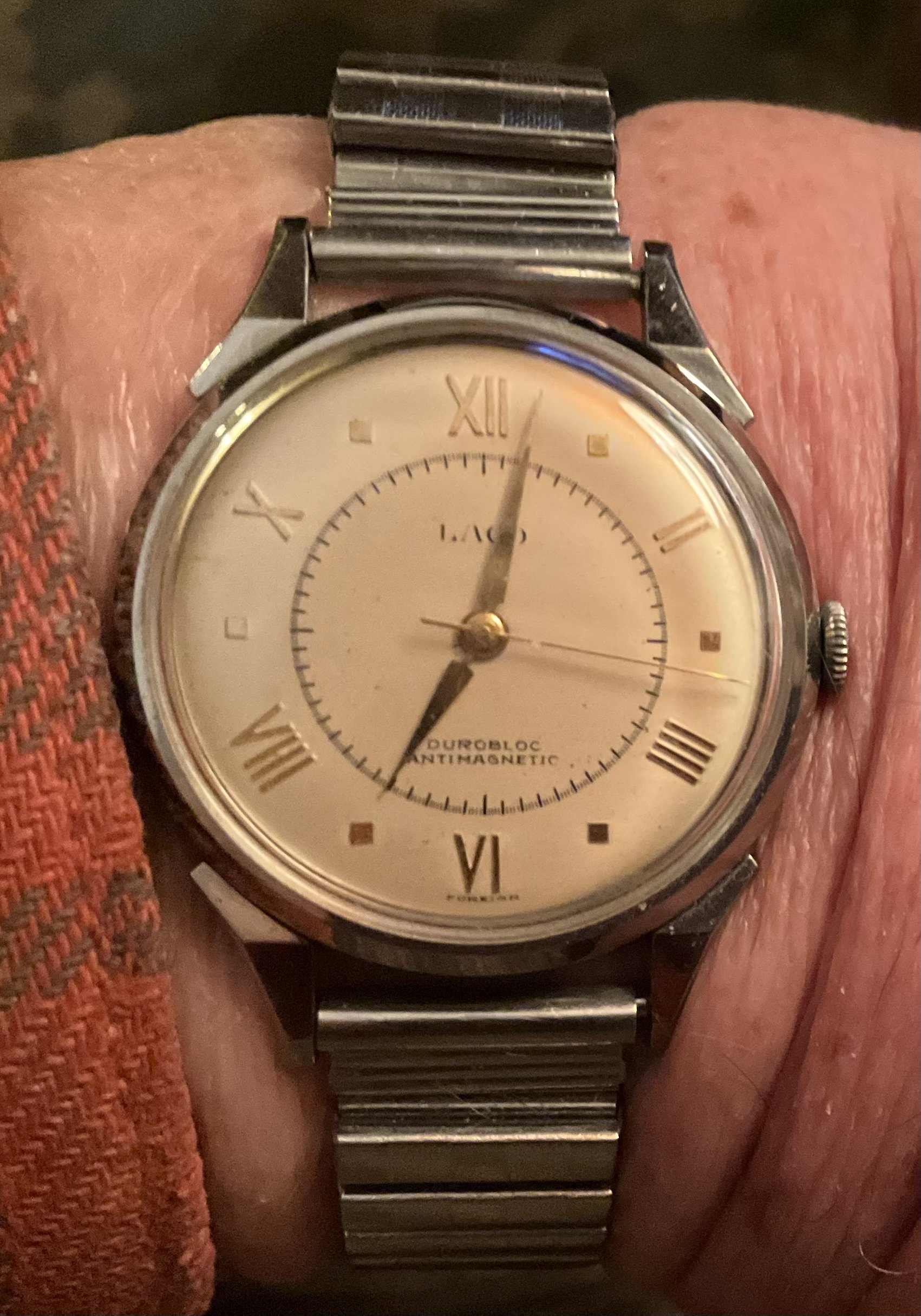 And now for something a bit less exotic than many of the selection offered here, recently. A post-WWII Laco (not Lanco). Laco was a major supplier to the German military in WWII. The name is still around. Laco was founded as Lacher and Company, and initially, they used Swiss movements. They merged with the firm Durowe who was a German firm manufacturing movements. This one has a German made Durowe manually wound movement. Typical of exports from Germany after WWII, the dial and movement on this watch are marked FOREIGN owing to backlash toward Germany after the war. Durowe was bought by Timex in the late 1950s because Timex was interested in the firm’s battery powered watches. I’ve shown a Durowe battery powered movement which is marked TIMEX. This is the movement used in Timex battery watches in the early 1960s. I’ve also shown the Durowe manual wind movement as in the subject watch. Marked FOREIGN.