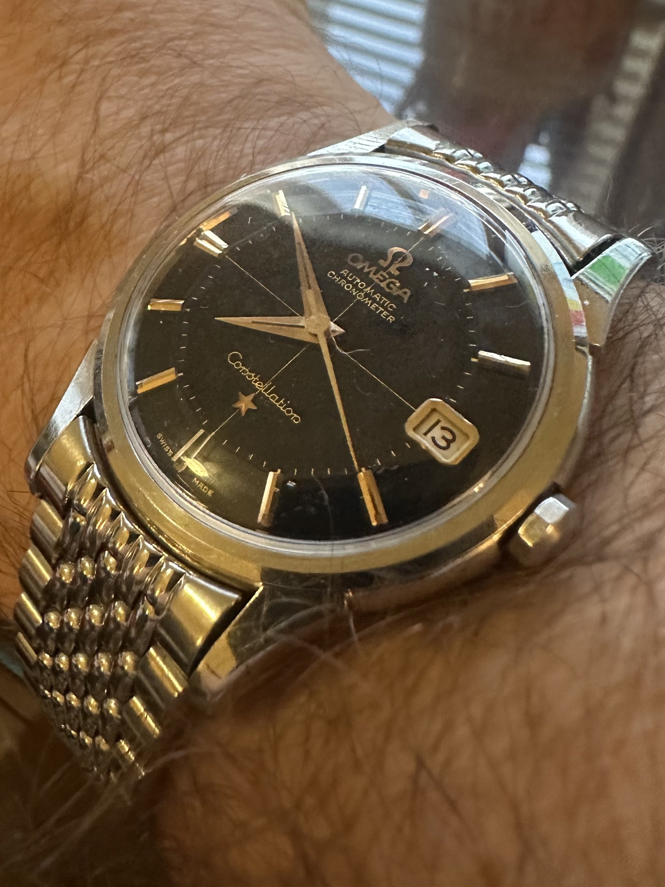 Posts 9,556 Likes 52,795 gbesq ·Mar 13, 2024 Good day all. Steel cased black dialed Constellation 14393 with gold furniture. All original.