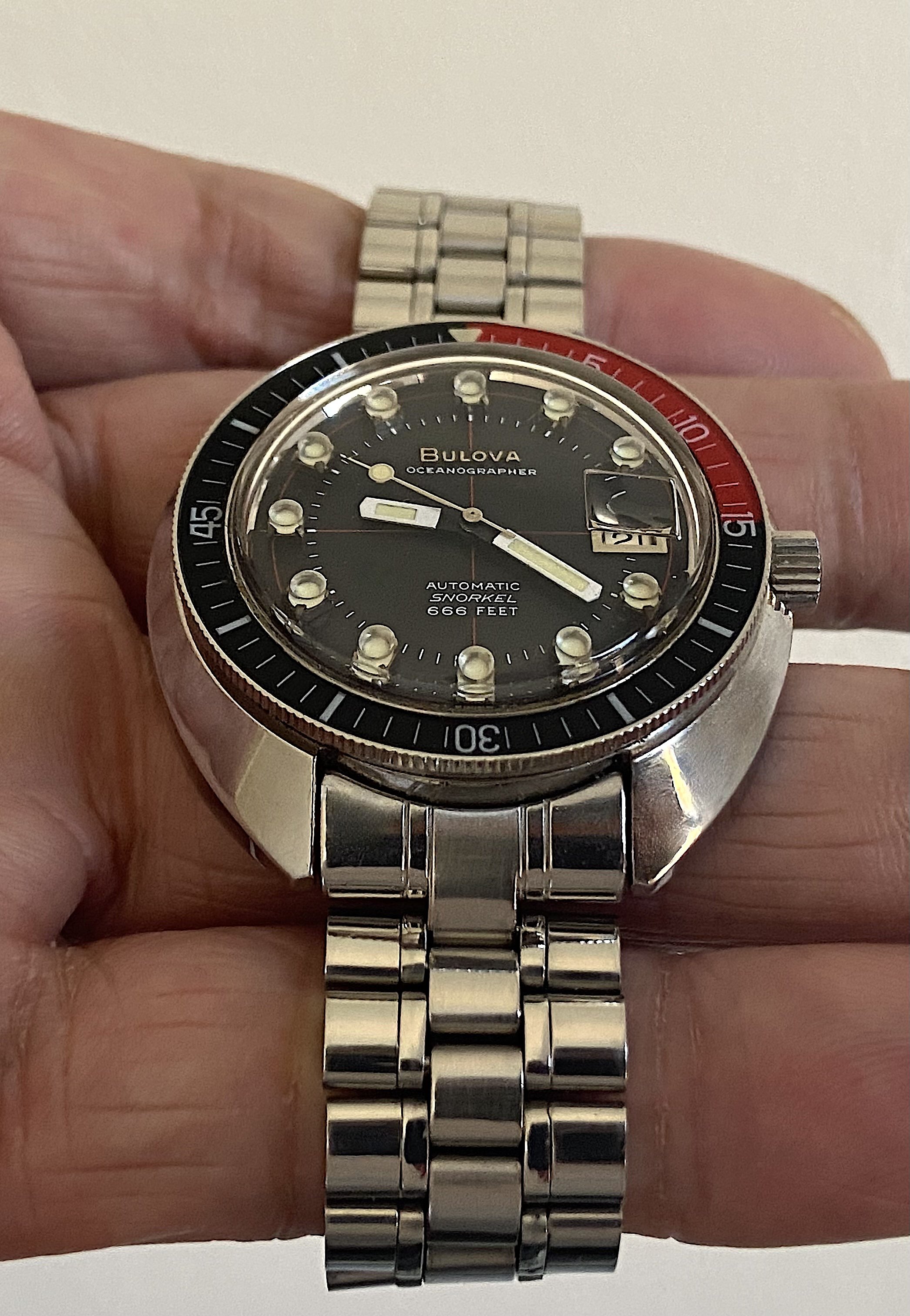 Before it leaves the factory, every single Bulova Oceanographer Snorkel is tested under 666 feet of water pressure in our special pressure tank, where it stays “down” a minimum of five minutes.