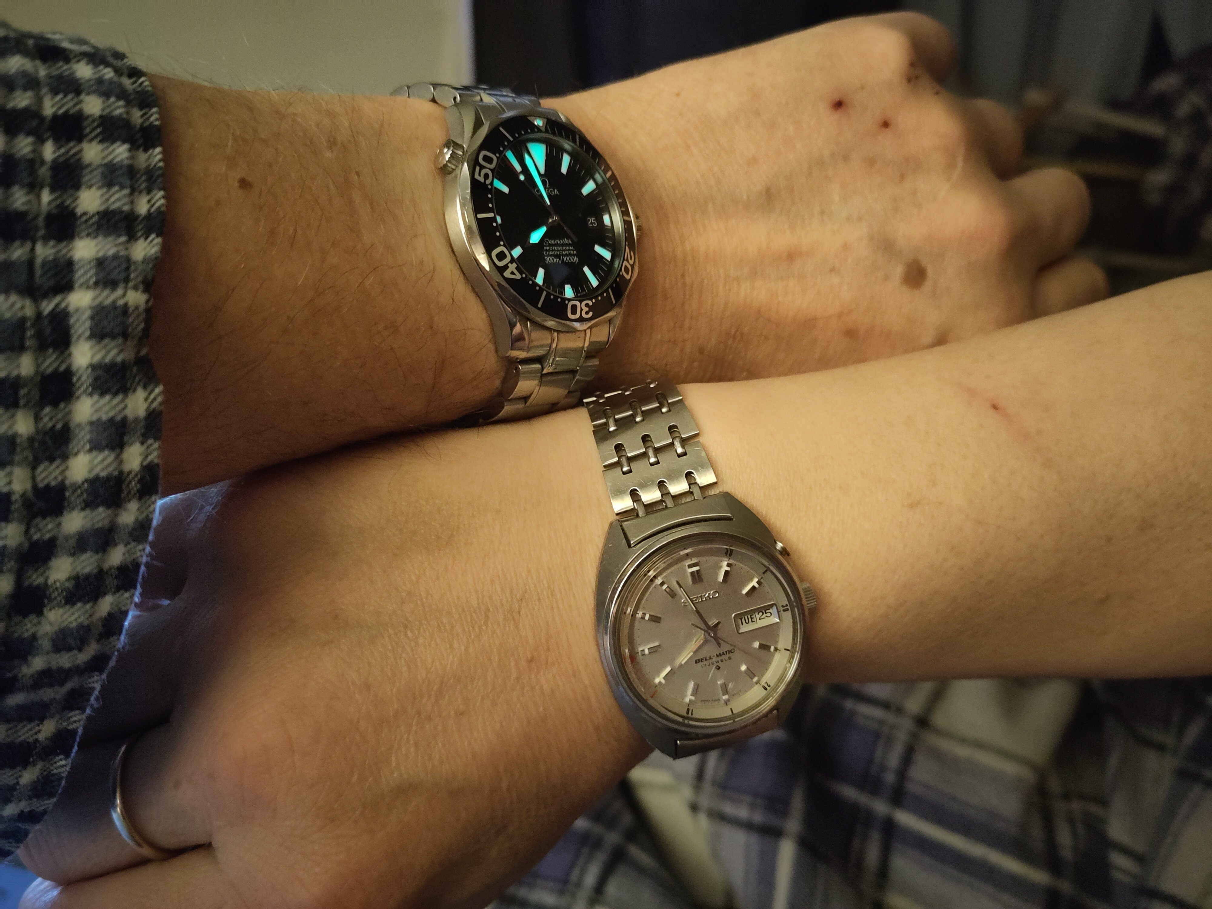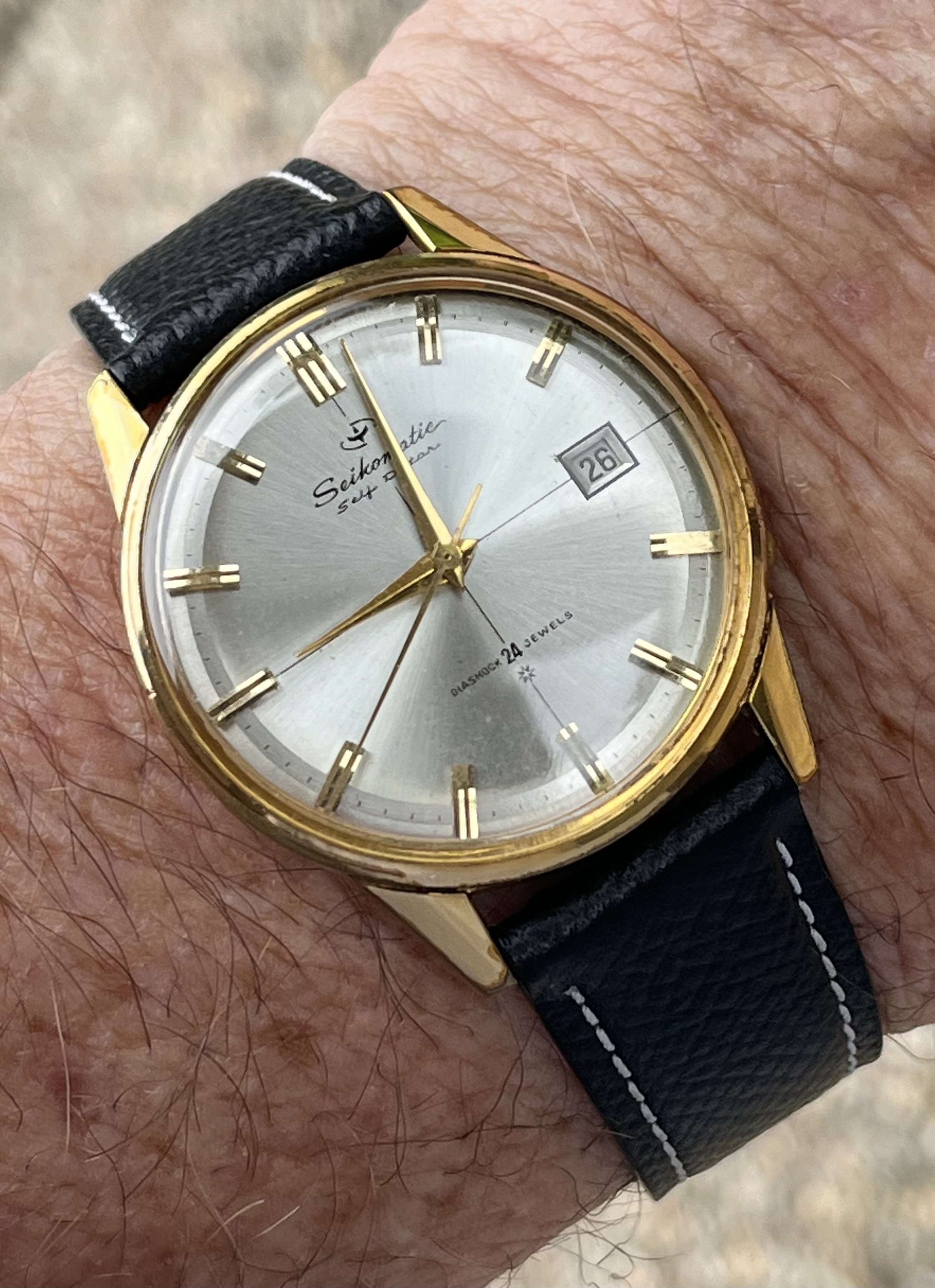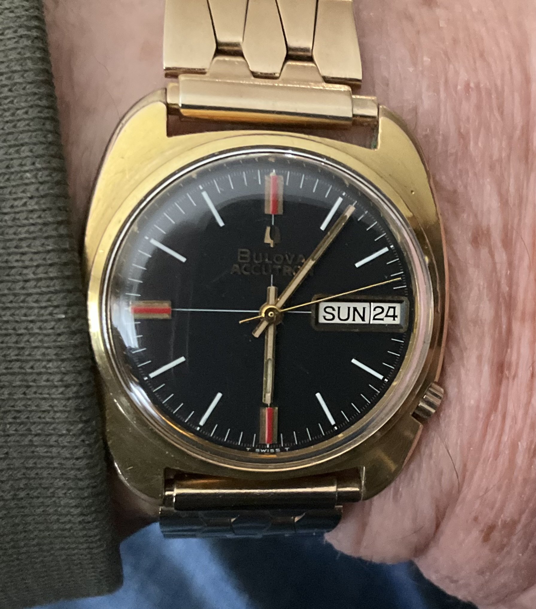 ·One of two, today. In 1969, I worked for a chain jewellery store that carried Bulova Accutron. In 1969, I sold this watch to its original owner. That’s 55 years ago! After 1969, I was transferred away, and we lost touch. In 1971, I was transferred back, and was managing one of the chain’s stores in the mall where his wife worked. They followed me. In 1980, I was promoted to manager of a different local store. They followed me. I left that firm in 1990. They followed me. In about 2005, his wife had died, and he took up residency in a senior’s care home. He phoned me one day, and asked me to visit him. During the visit, he gave me the Accutron I’d sold him way back then. I don’t wear it much as the gold filled case has corrosion problems. It’s a style of Accutron I have always liked.