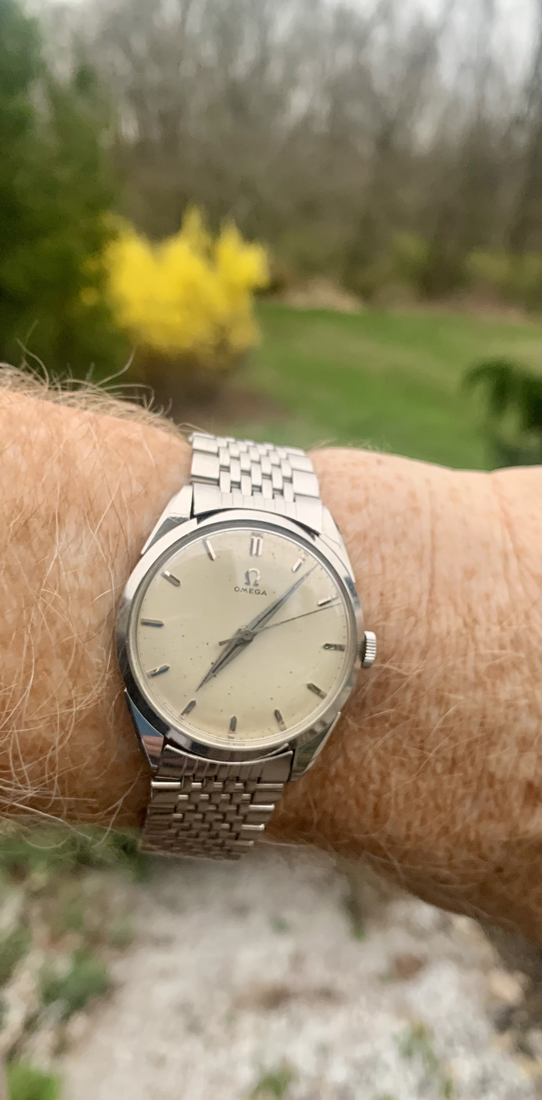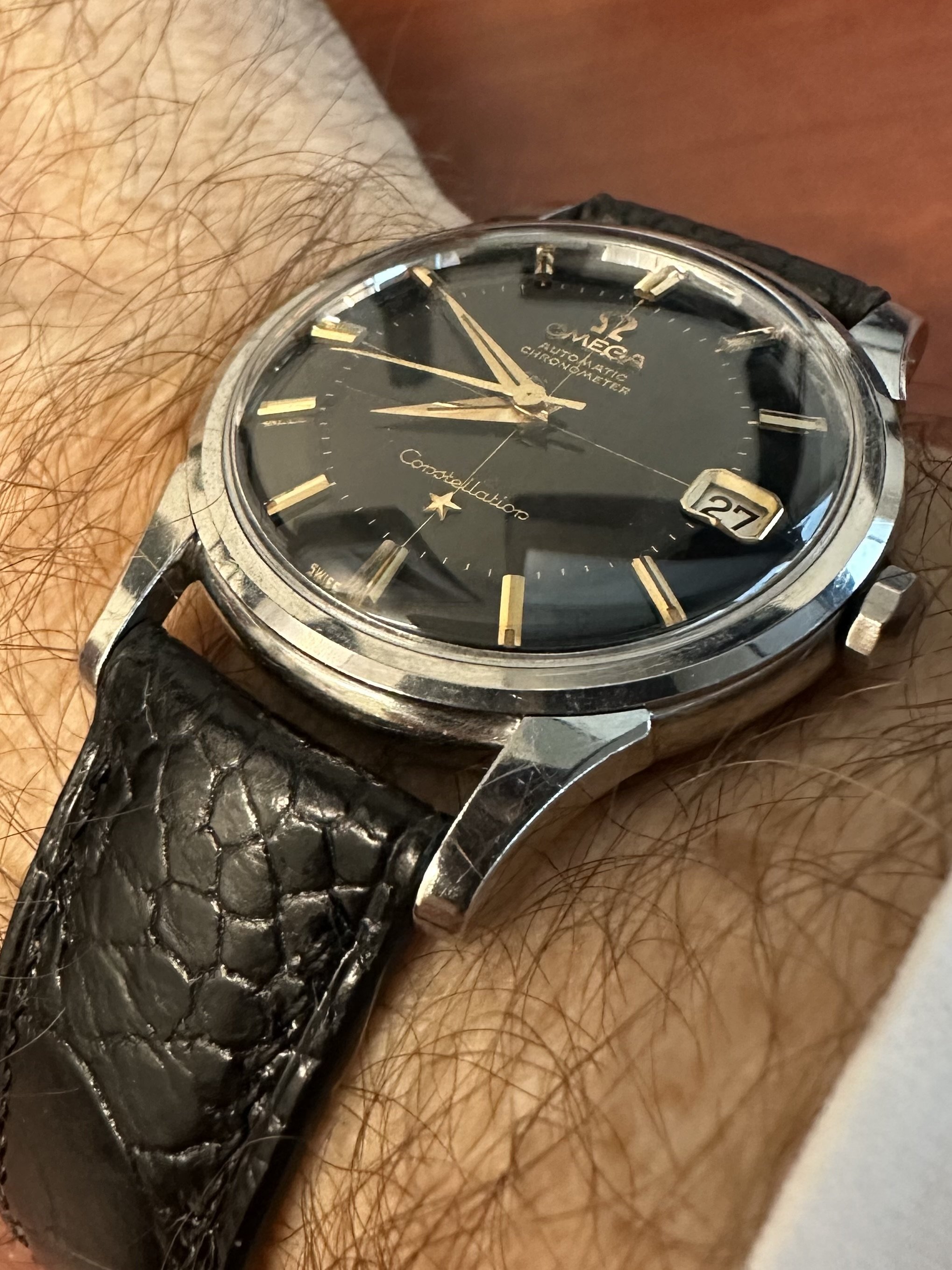 Good day all. 1959 pie pan Constellation reference 14393 with an unrefinished crosshair black dial with gold accents. Has some patina, but still lovely. 🥰