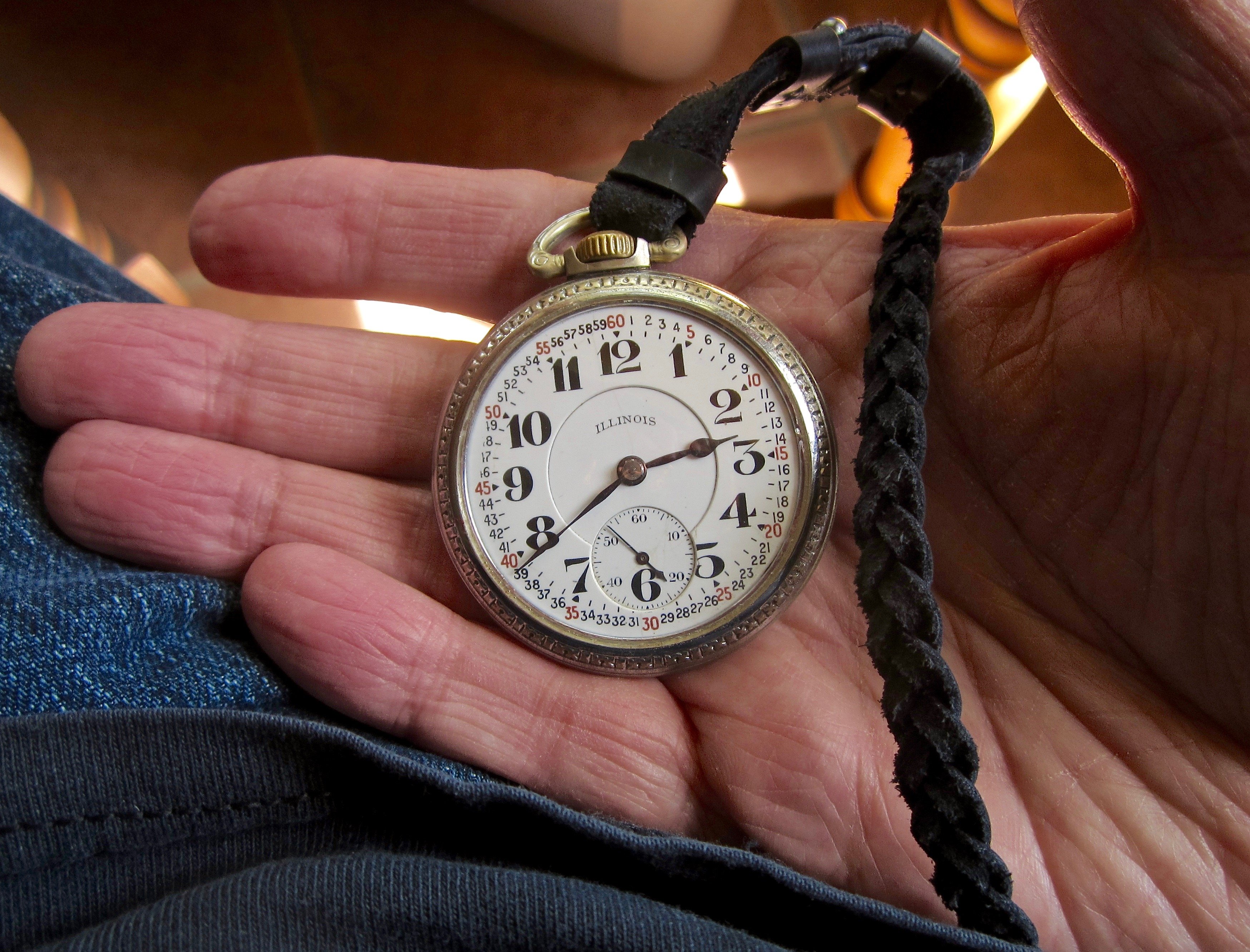 If there was such a thing as a beater, chores watch then this vintage 1919 Illinois A. Lincoln 21-jewel watch in a inexpensive and shabby, much "loved" case would be the one to use while doing weekend lawn chores, which is how it's serving today. Sporting a DaveK dark blue lanyard. The movement is quite nice, railroad grade and falling right below the Bunn Special in the Illinois 21-jewel pecking order. This one could have been a trainman's watch at one time. Or not.