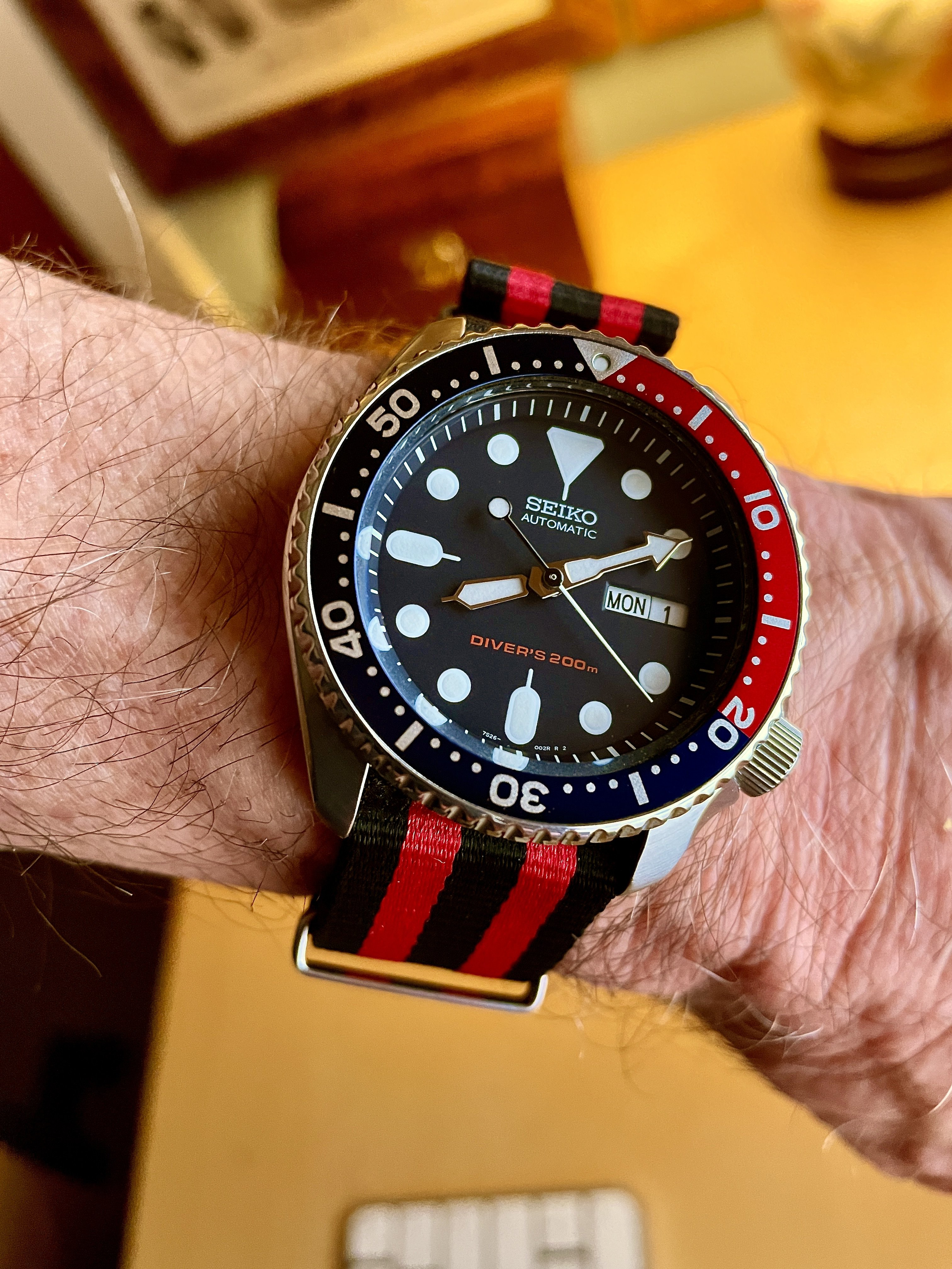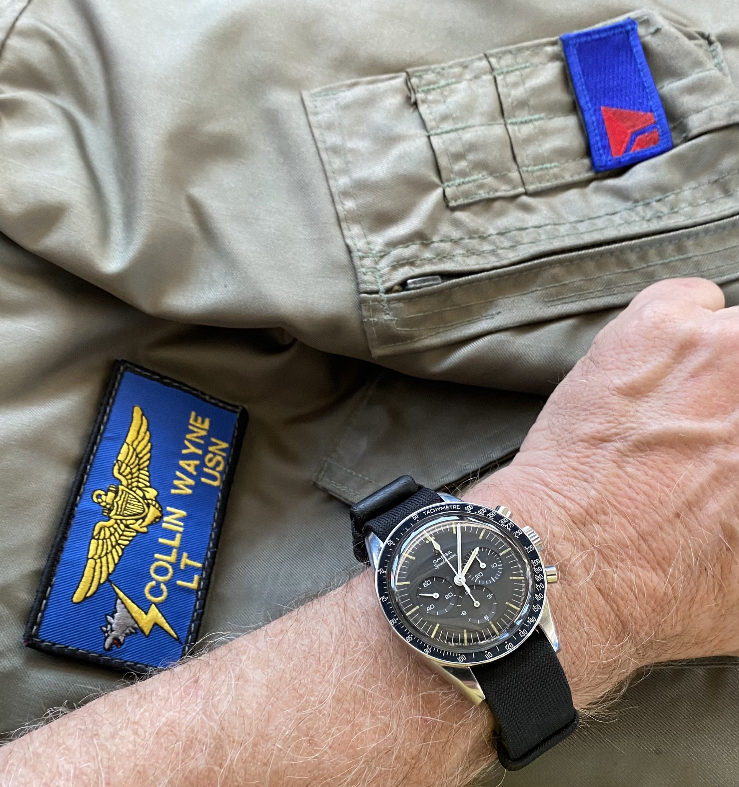 Just completed five days of fliegering with my -64 Echo Whiskey and it’s a beautiful spring day here in Detroit…I forgot to pack some colorful “springy” Omega NATOs for the drive back to Cincinnati…but at least I have some colorful “springy” patches on my old Navy CWU-36/P NOMEX flight jacket…