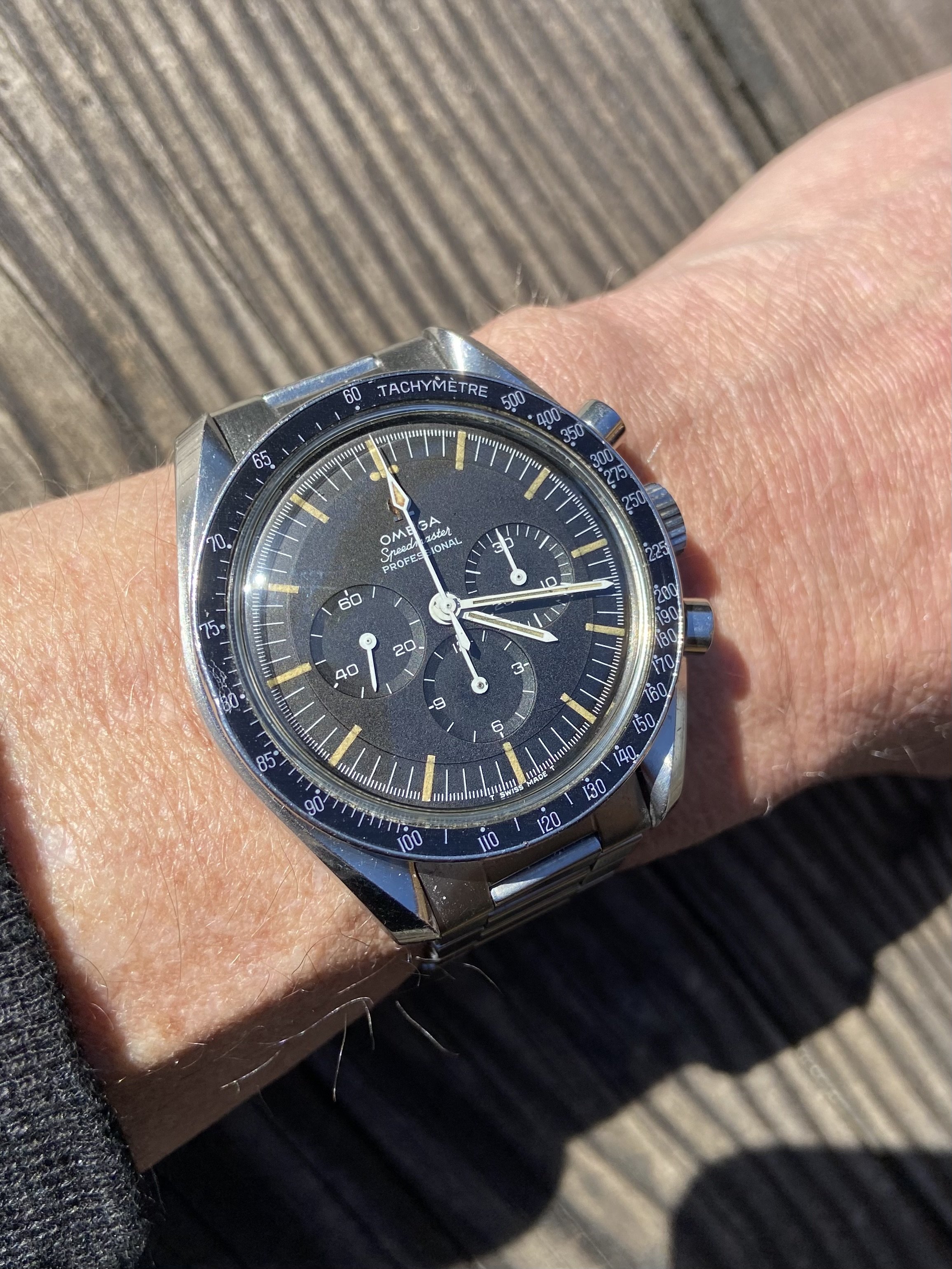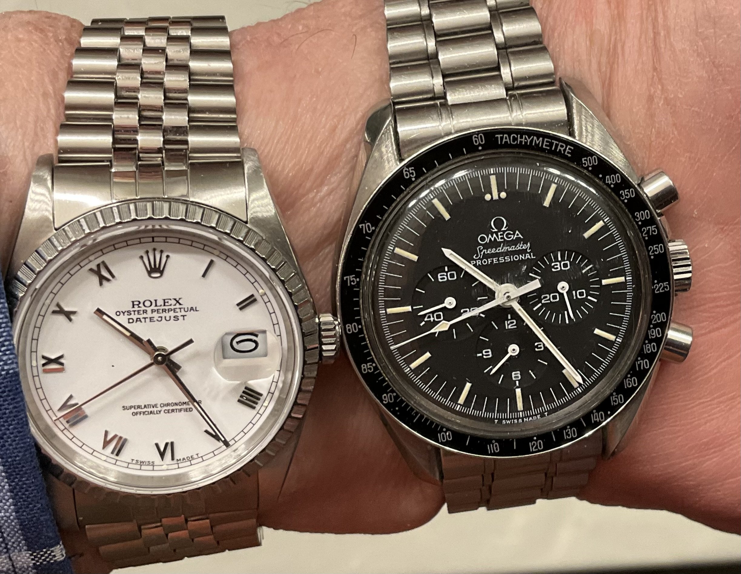 ·One on each wrist today. The Rolex was put back into service on March 11, set to my iPad at that time and worn 24/7. In this picture, it has lost 1.5 seconds in 26 days without stopping or having been re-set. My Speedmaster 345.0808 with the gold plated calibre 853 movement and sapphire back is the other. I conditioned it 16 months ago. It was set to my iPad 18-hours ago, and worn continually since then. It is one second fast to my iPad. This is one for Ripley!
