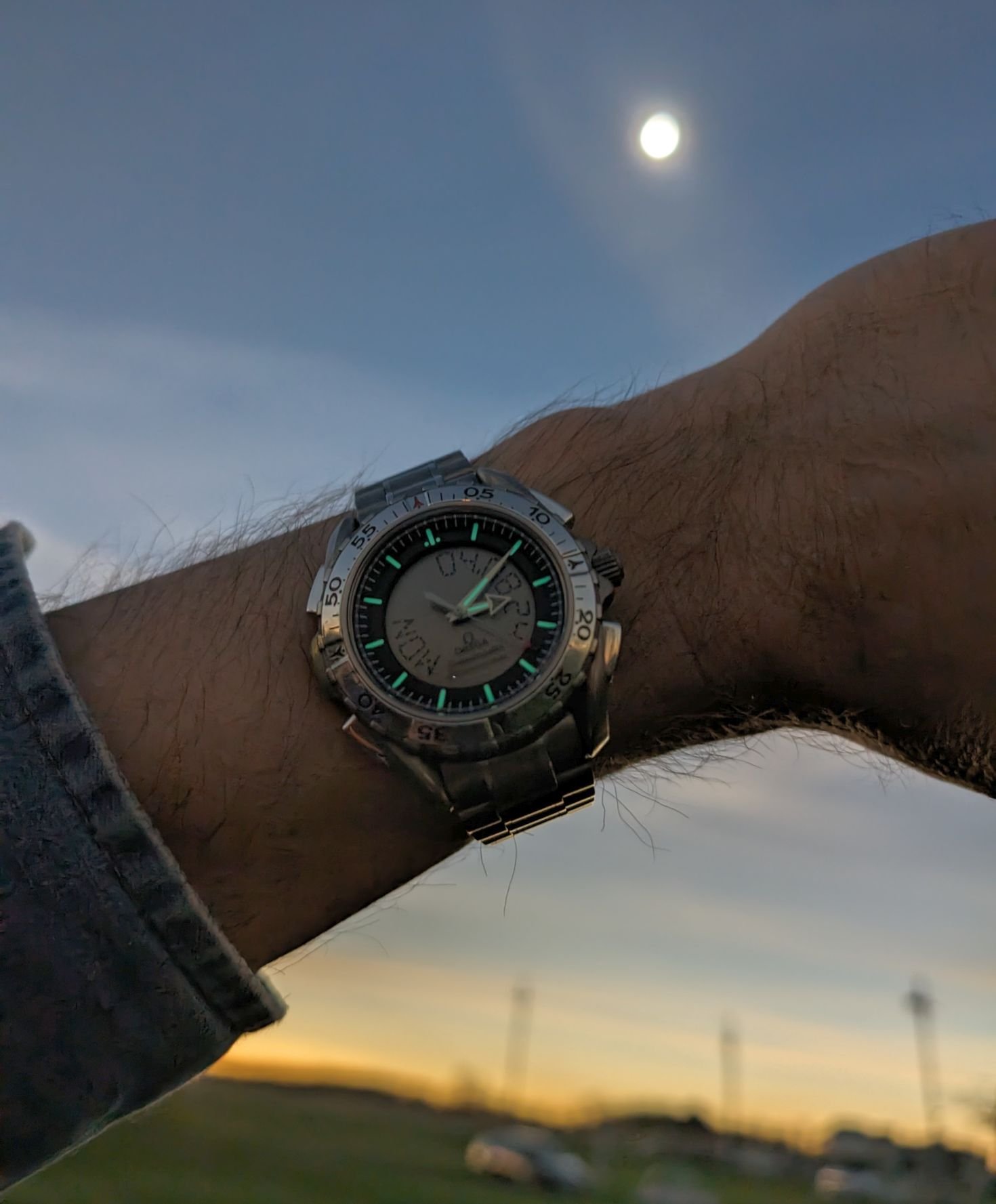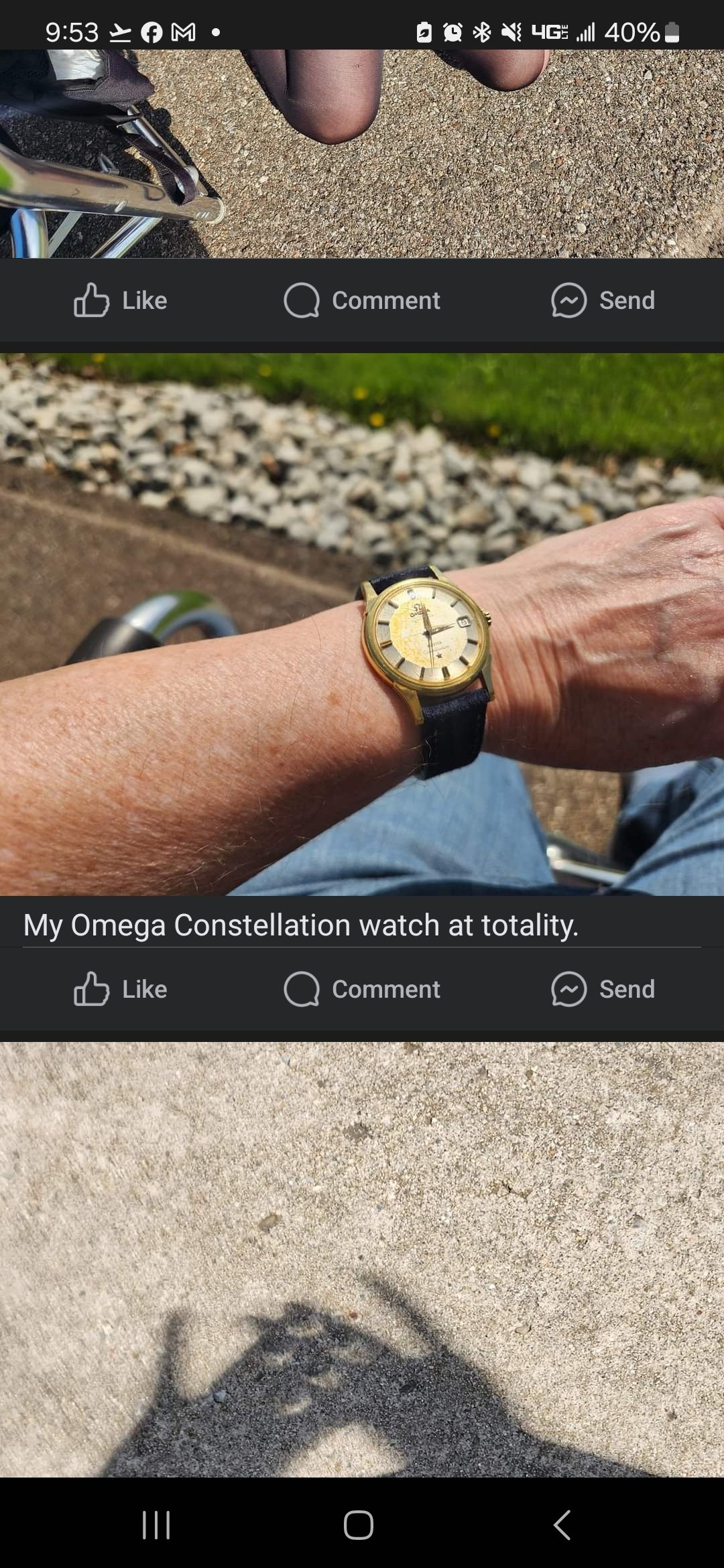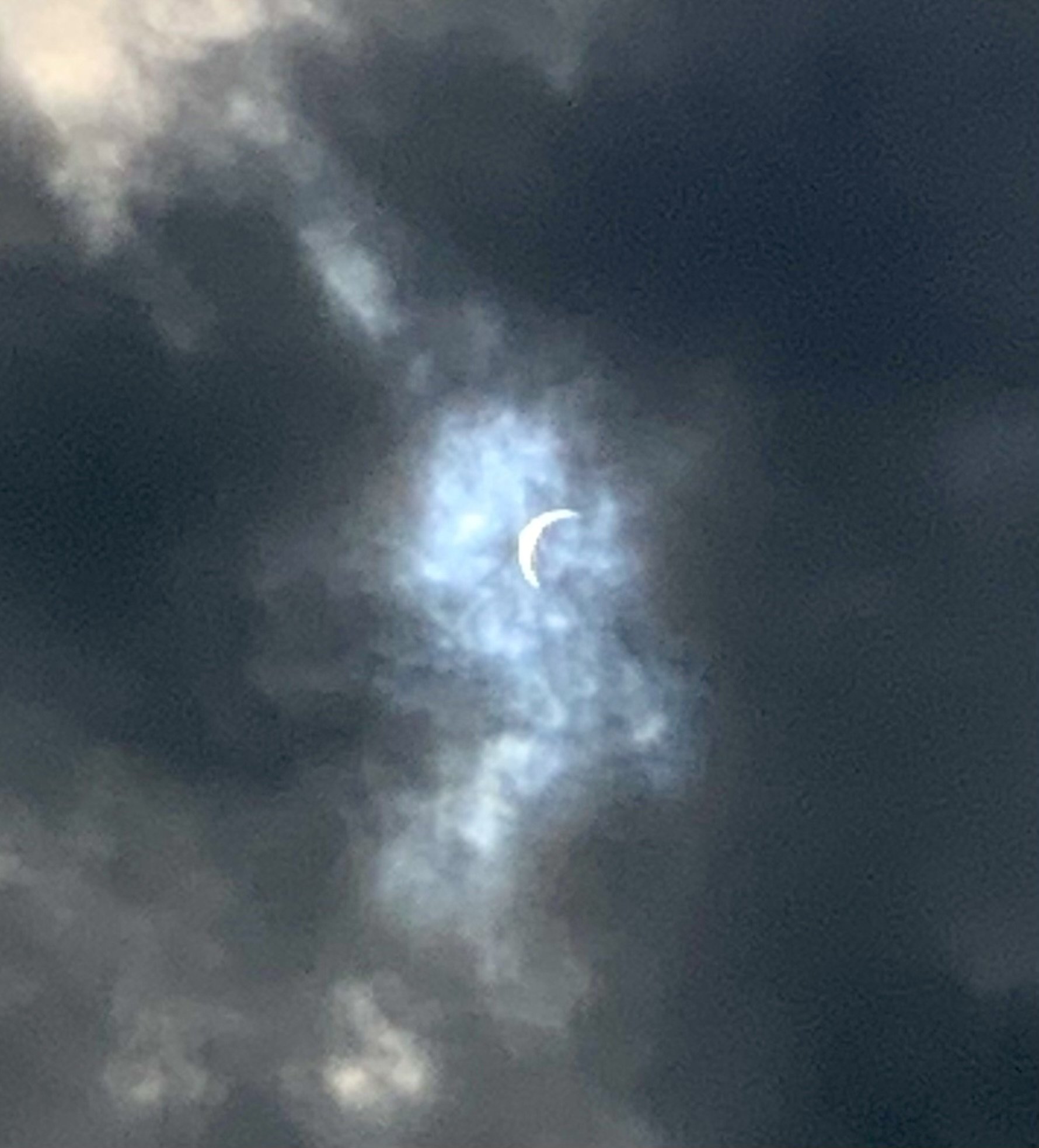 This is a terrible picture because automatic settings overexpose so much it ruins the eclipse, but with binoculars I was able to spot a small looping flare or prominence at the 6 o'clock side of the sun. Also I think it was Venus that popped right out to the right of the sun (not shown in this pic). At least the pic shows the sunset-ish colors at the horizon...horizons all-around.