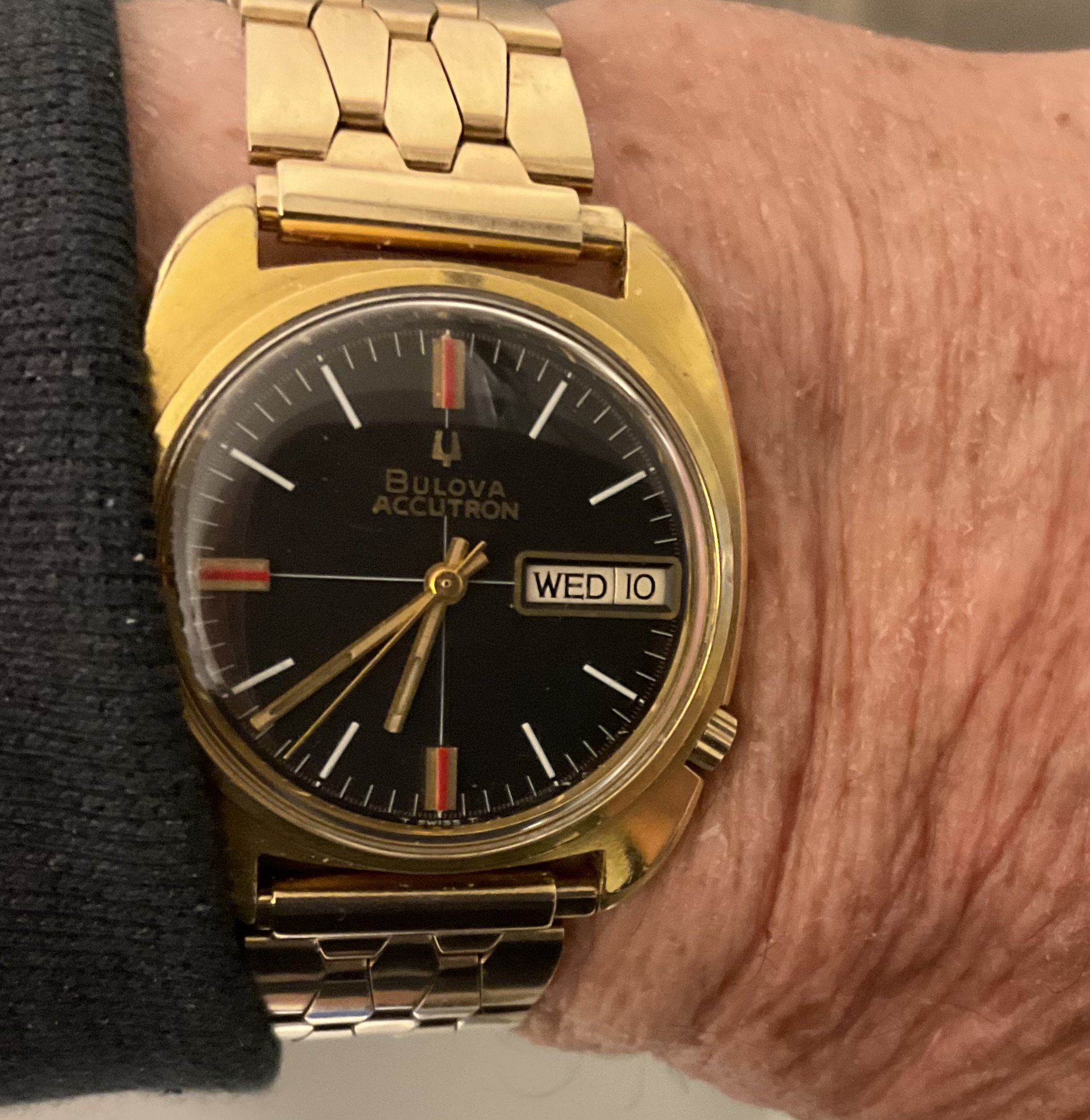 I’m the second owner of this Accutron. I sold it to the first owner in 1969, when I worked for a Bulova dealer. In about 2005 or so, shortly before he passed away, he gave it to me as he had no family to leave it to. I put a new cell into it about ten days ago, and posted a picture in the WRUW thread. Shortly after that, the accuracy went to H _ _ L. The watch had not been serviced for probably 25 years or so, and the movement looks awfully forlorn. So I serviced it Monday of this week. Back into service today. The gold filled case is showing the typical corrosion, so I don’t wear it often. I’ve always liked this model.