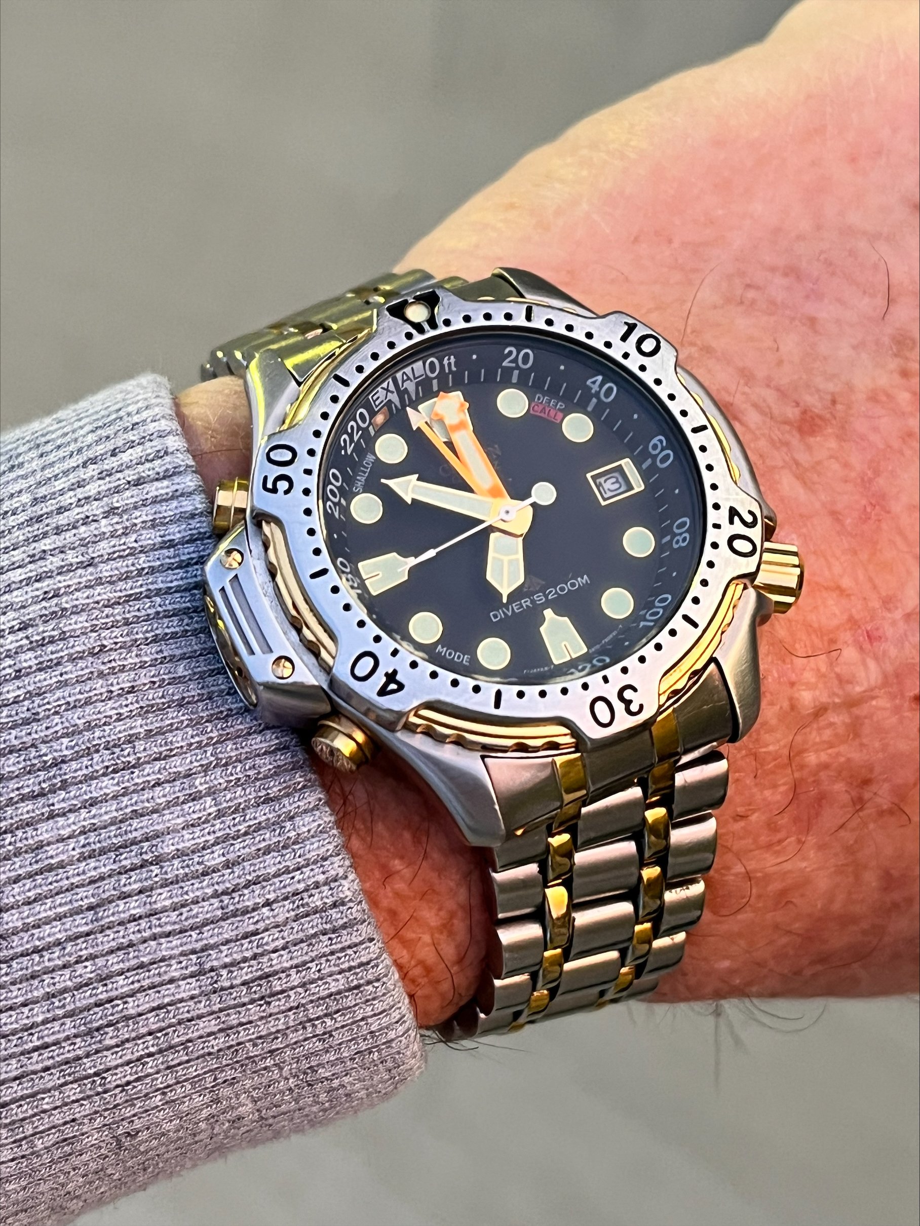 My first "big" watch purchase in 1992 when I was working in the Scuba Industry. After years of daily use and many dives, it was put in storage because I thought it needed a new battery. Little did I know then that it would take me 12 years before I would get the suitcase out of attic. Turns out it need a complete overhaul to get it back up and running. I have probably spent more money on it than it cost to buy it 32 years ago. It still gives me a lot of pleasure.