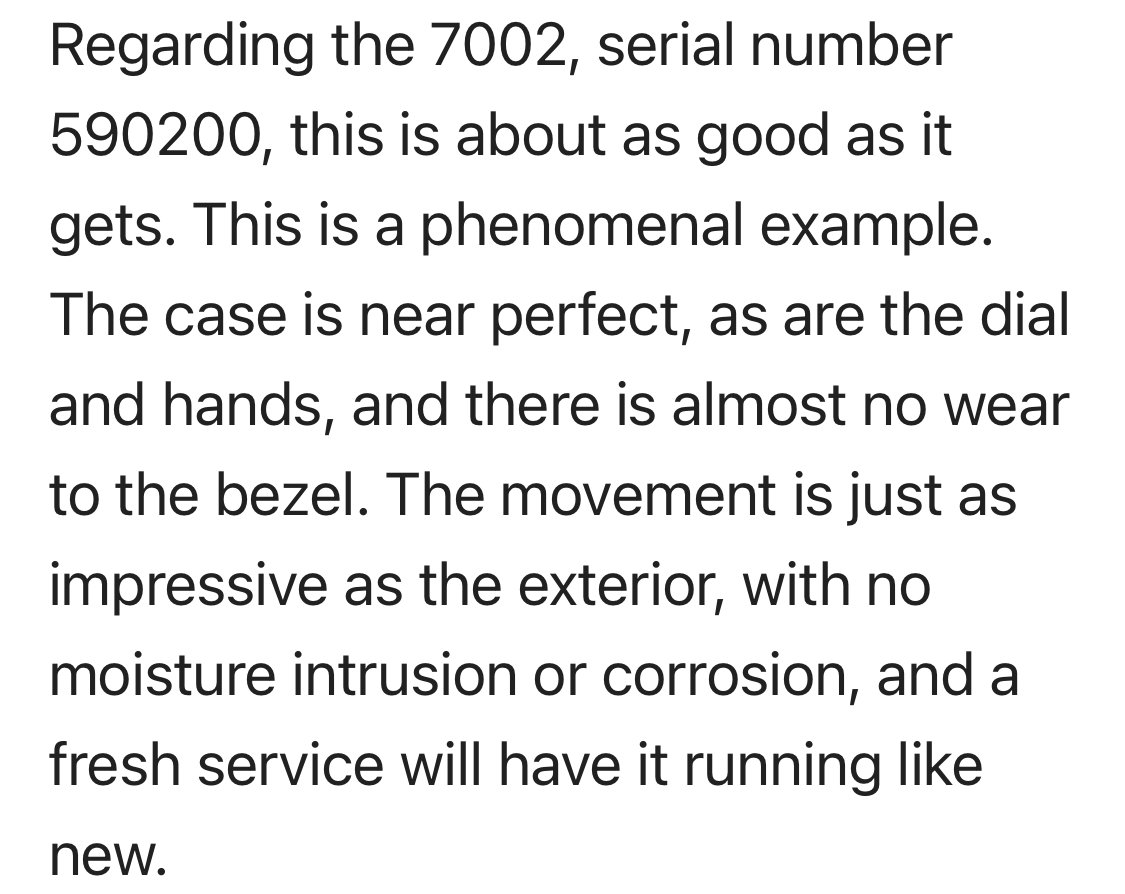 Posts 611 Likes 5,528 Charlie3755 ·Apr 18, 2024 I am a fan of all Seiko divers, new and old. In particular the 7002-7000’s. I picked up this ‘95 last year and sent it out to Seth @hubcityvintage for a service along with another one from “92. Seth’s evaluation: Edited: Apr 18, 2024