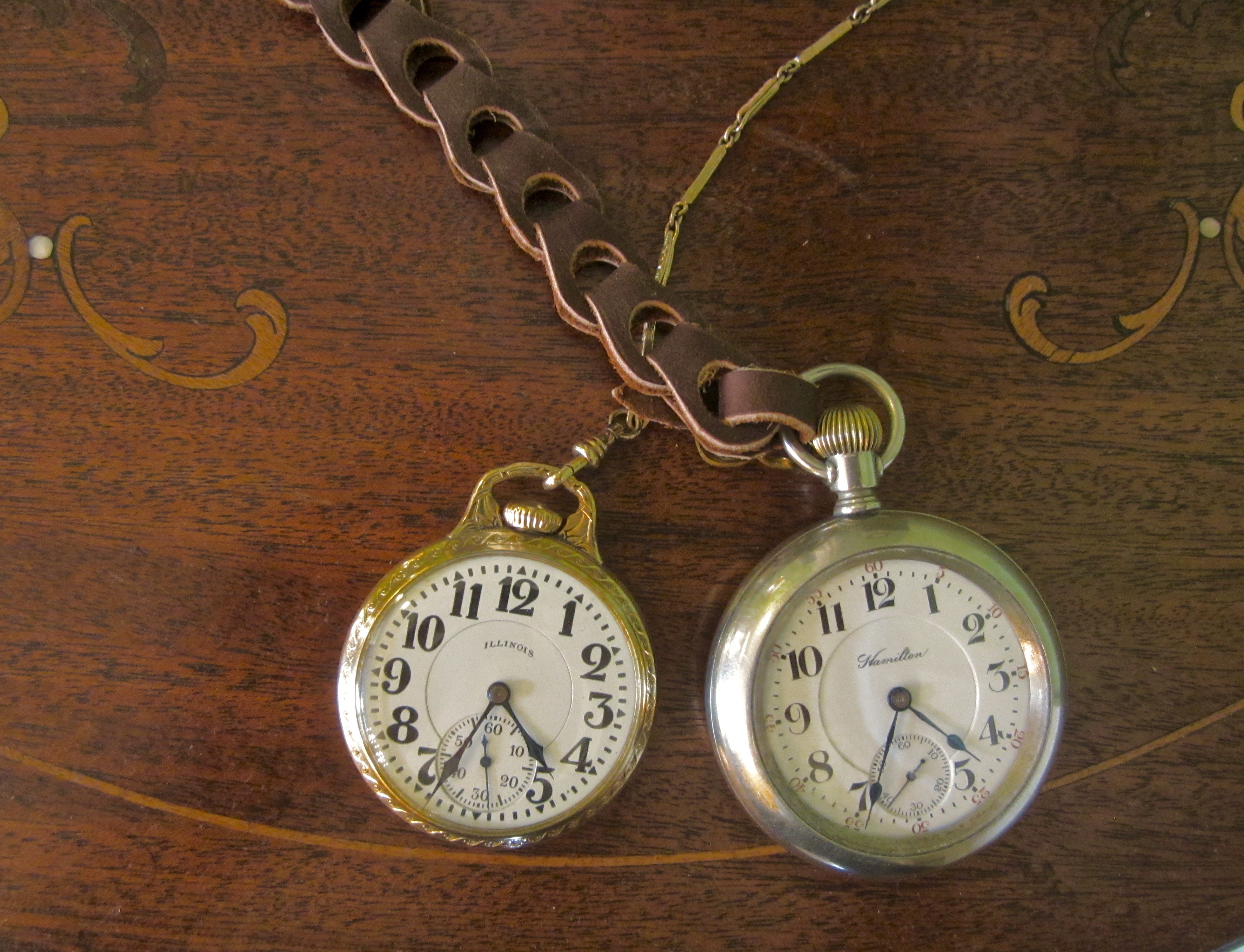 We have two members here who can produce the most novel and useful leather pocket watch lanyards, DaveK and Duracuir1. Both are practical and stylist ways of toting pocket watches daily. I generally prefer them over the watch chains for actual use. DaveK's complement the 16 size (and 17 size Sangamo Special) watches so well and Duracuir's provides a sturdy mate to the large 18 size watches.