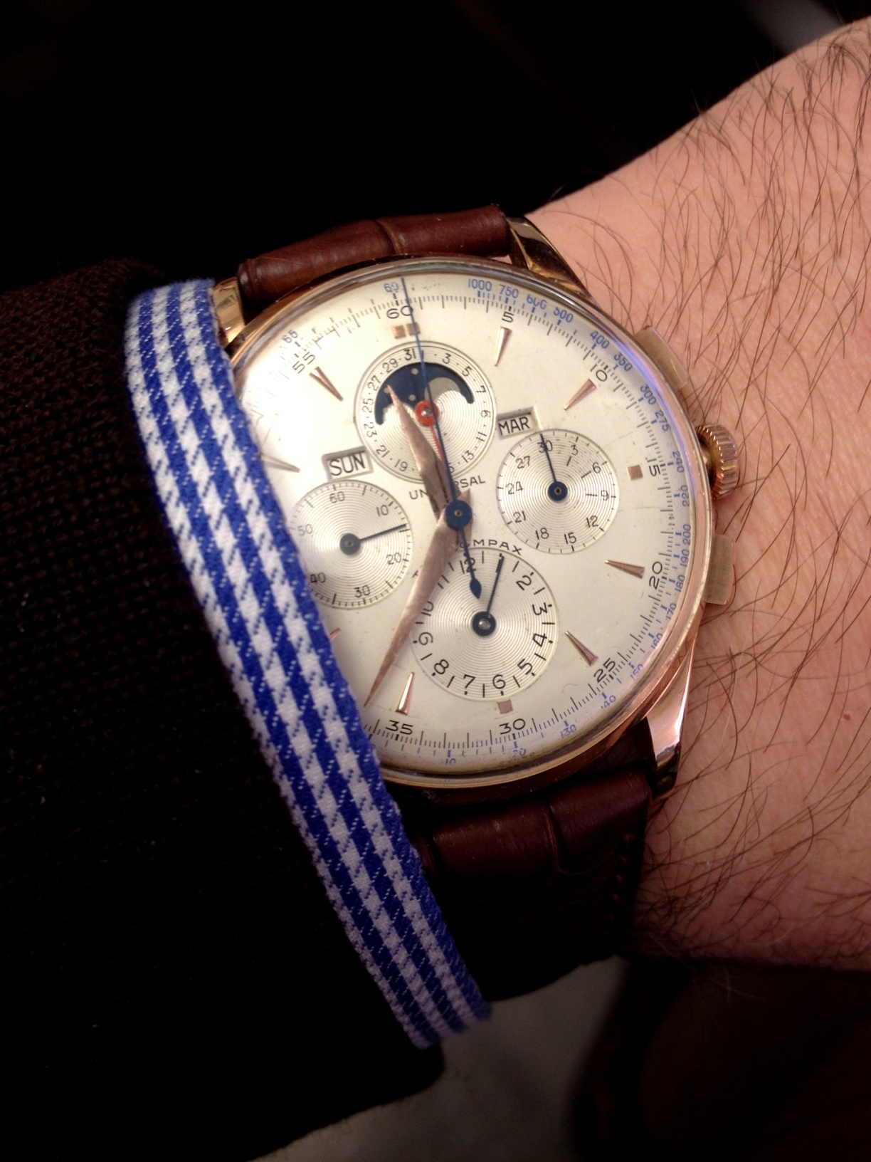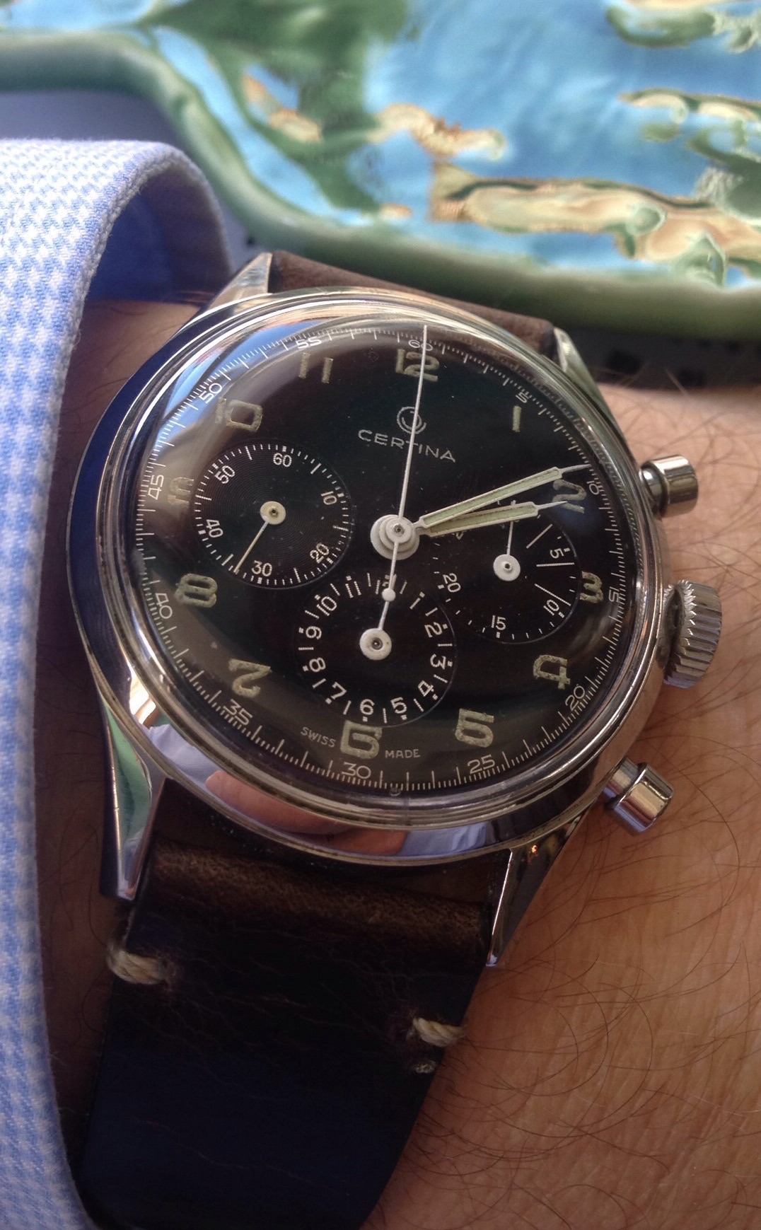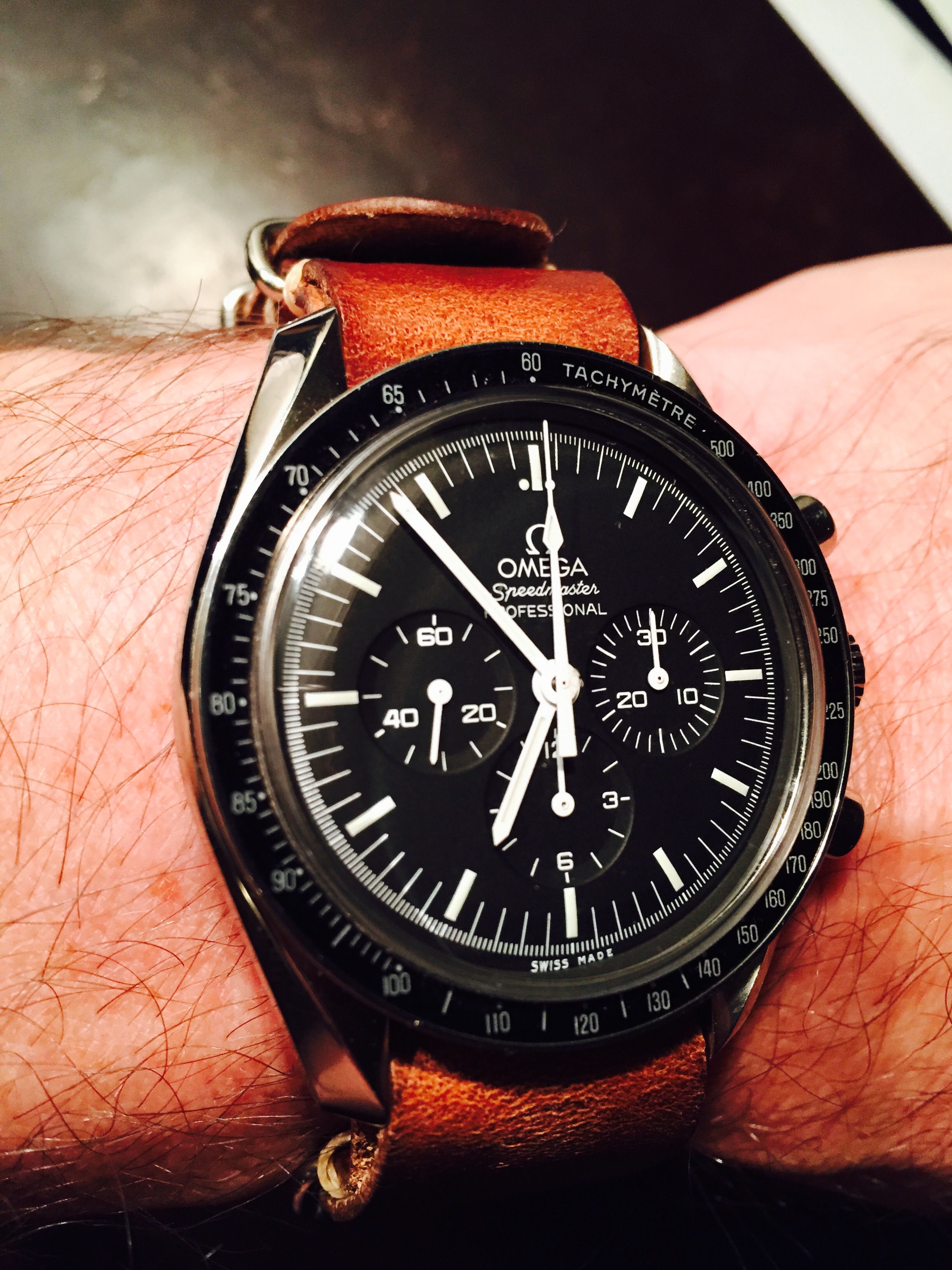 I'm going through that 'let's try every strap I've got phase ...' - These lugs are a bit of a pain at 19mm (why Mr Heuer ?!). I think ultimately I will try and get a Rally strap done with silver stitching or something, but in the mean time I like this - I call it 'Grey Side of the Camaro'!