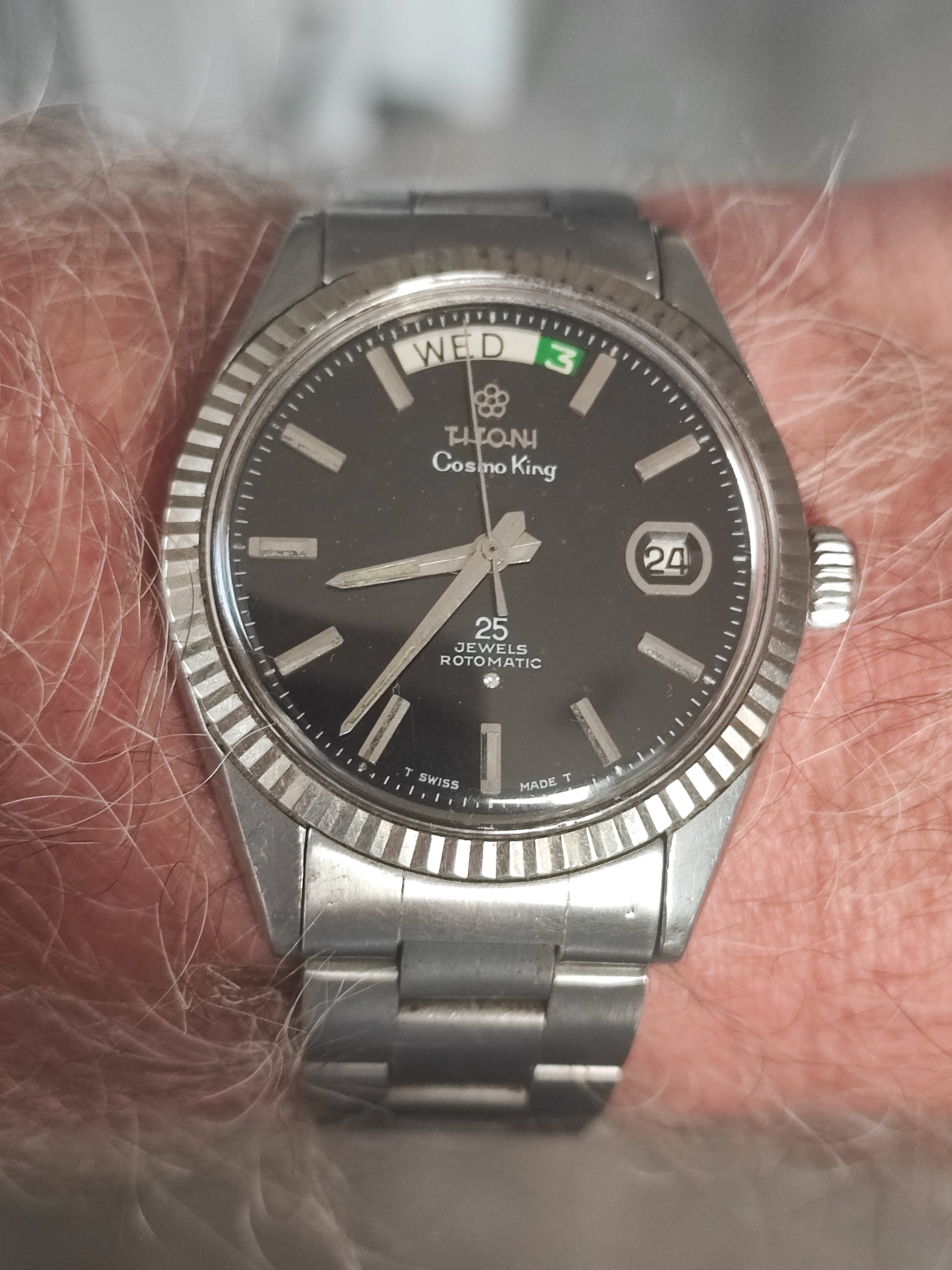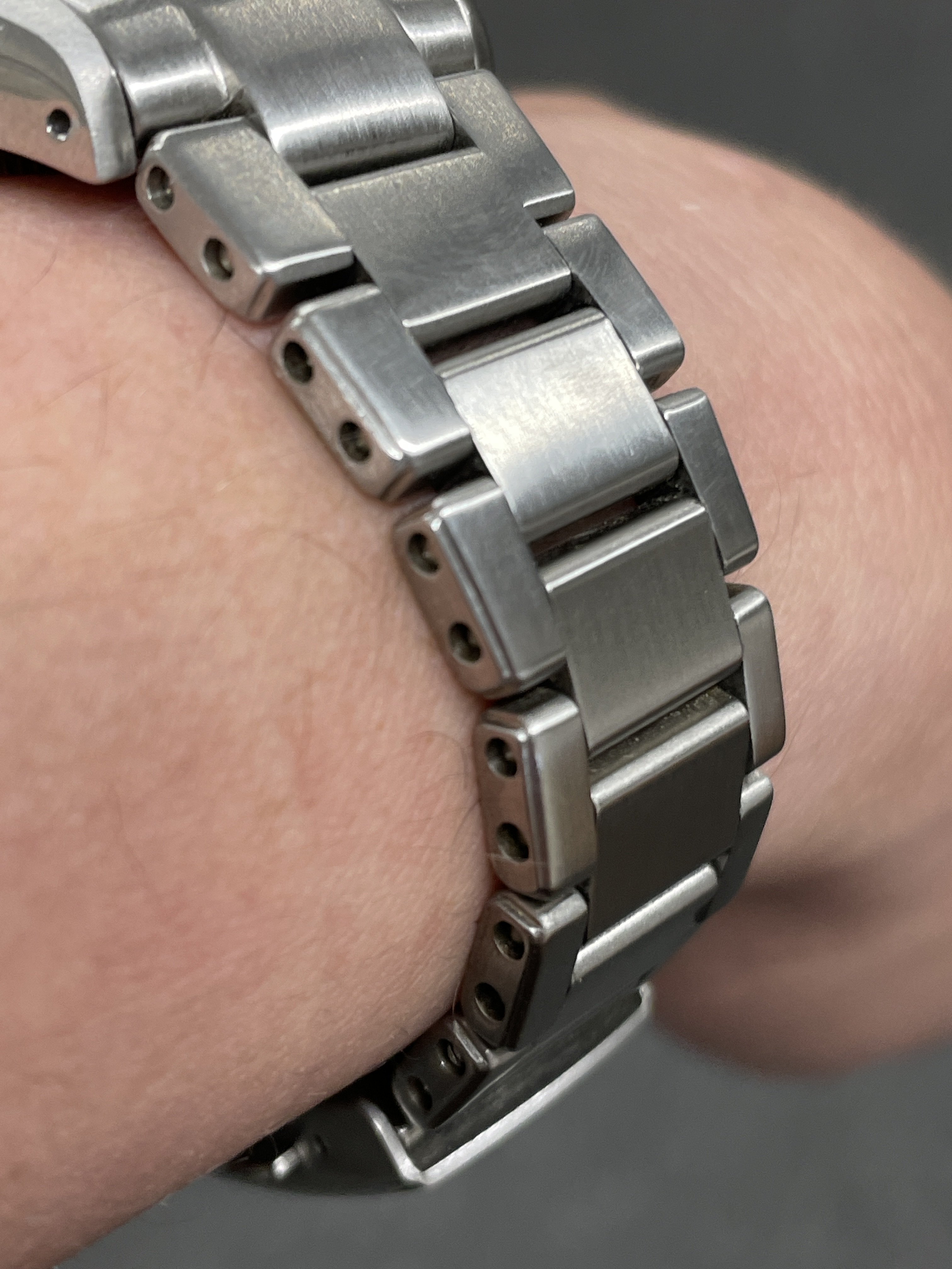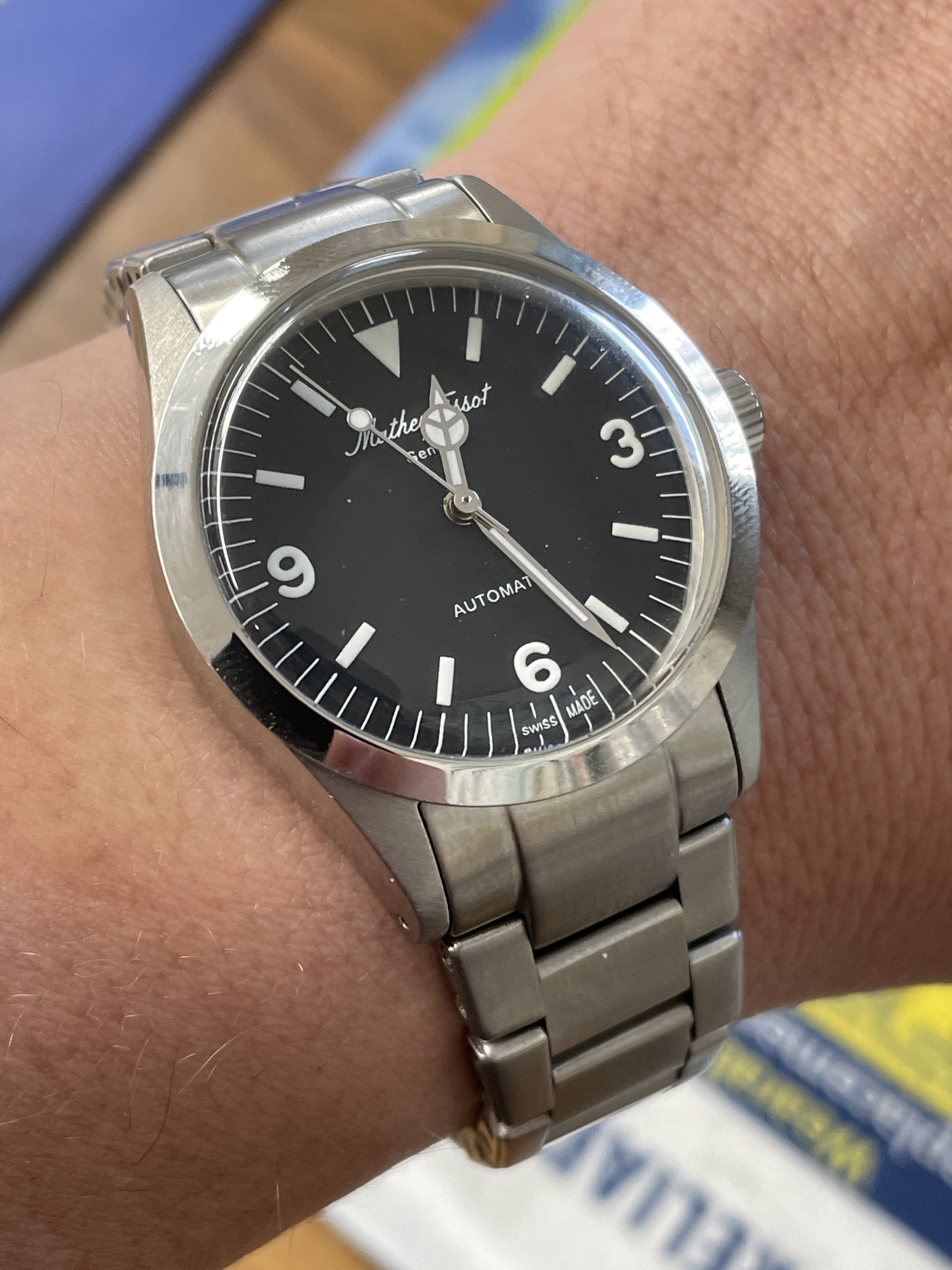 Several years ago, the Facebook group Asia Mechanical Watches Group commissioned Mathey-Tissot to make an homage to the classic 5500 Explorer. It’s been re-released with cool colors and applied indices through GDG watches but I’m partial to the old school printed dial. It’s got Tudor-esque faux rivet sides on the bracelet for no real reason that I can tell other than it looks cool and adds to the tool watch aesthetic.