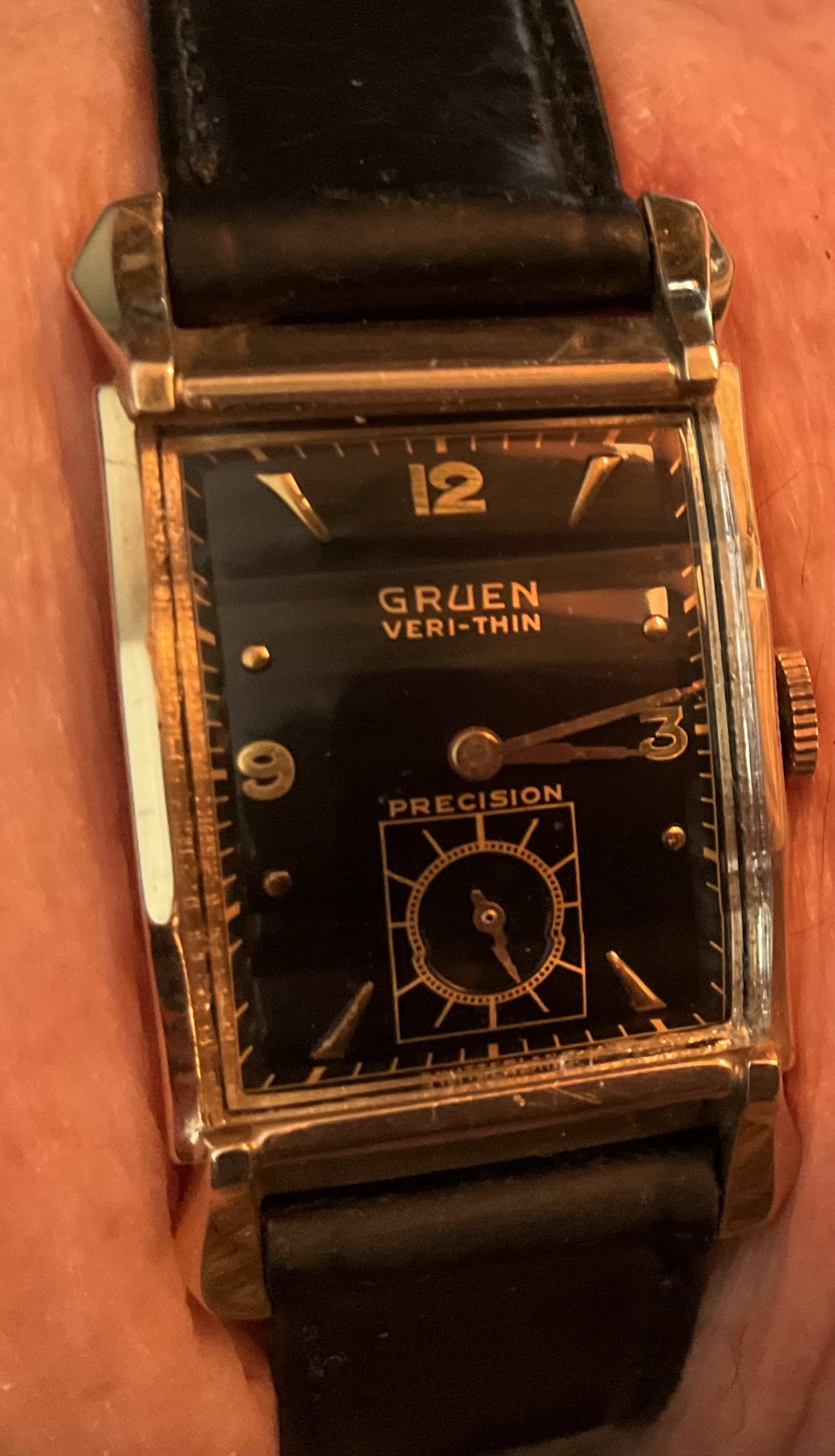 When Gruen closed their Canadian office, the managing director landed with Rolex, Canada, as managing director. When he found out I was a watch collector, he gifted me two NOS Gruen sample watches. This being one of them. Recently, a collector saw a picture and really liked it. I’ve owned it for 35 years, and I doubt if I have worn it a dozen times. So, today, I decided to wear it. The movement Is a 17-jewel calibre 430, and the case model # is 703. Vintage? Maybe mid to late 1960s? Today, it received its first polish, a light touch up with rouge on a Selvyt cloth to remove a bit of tarnish.