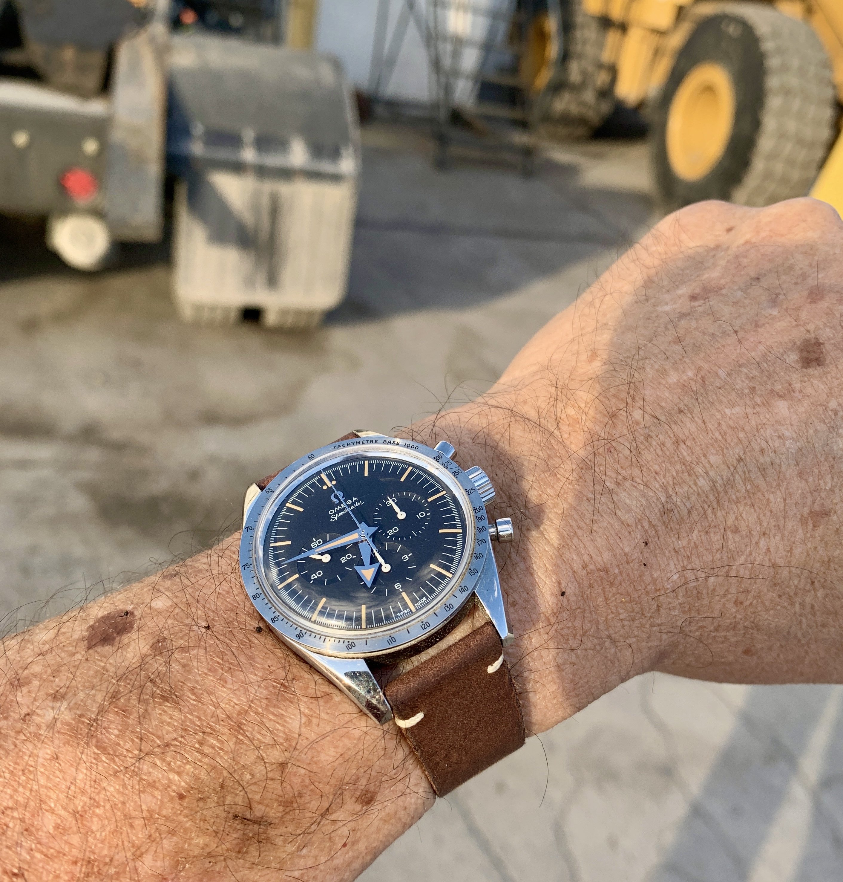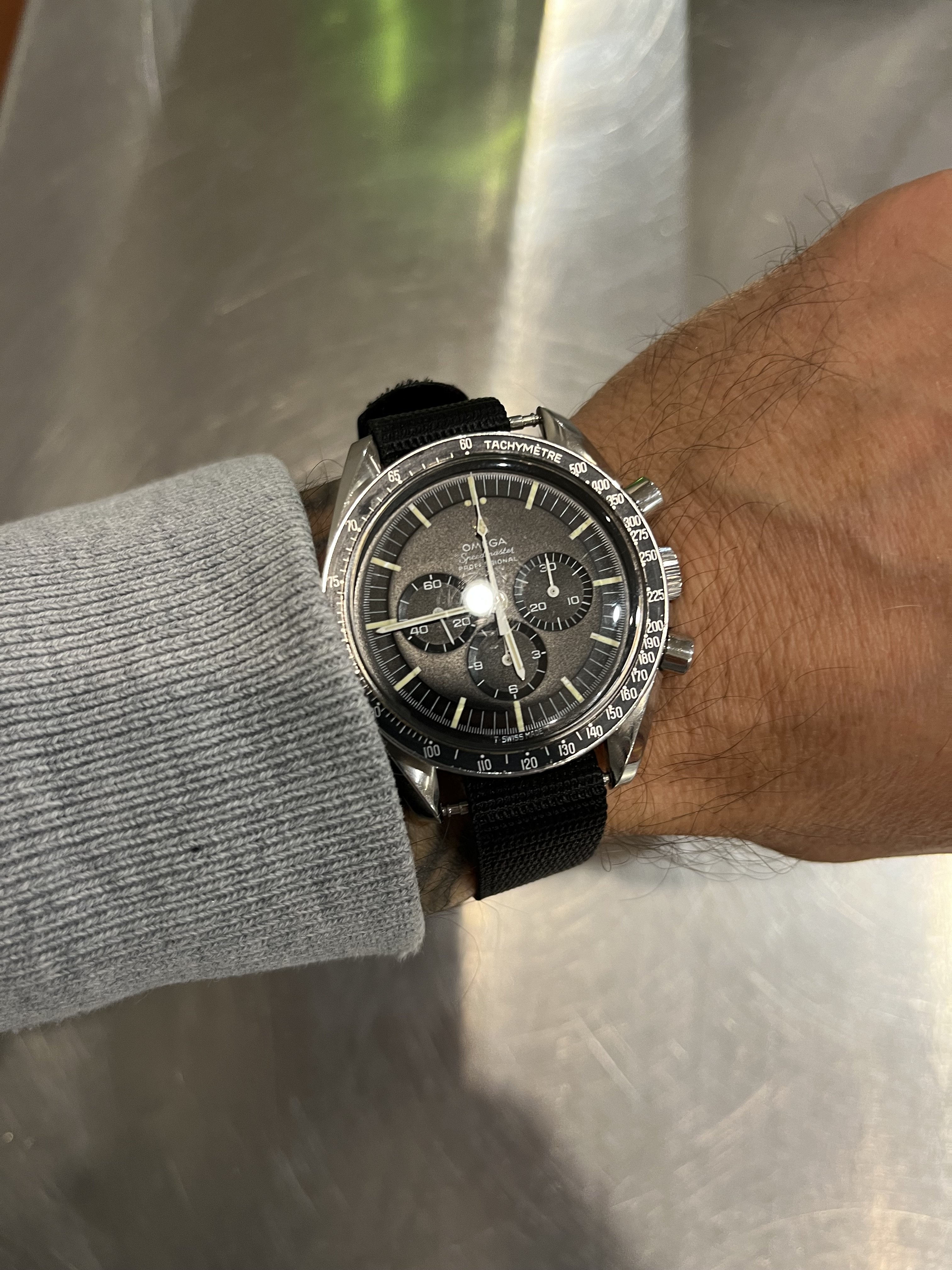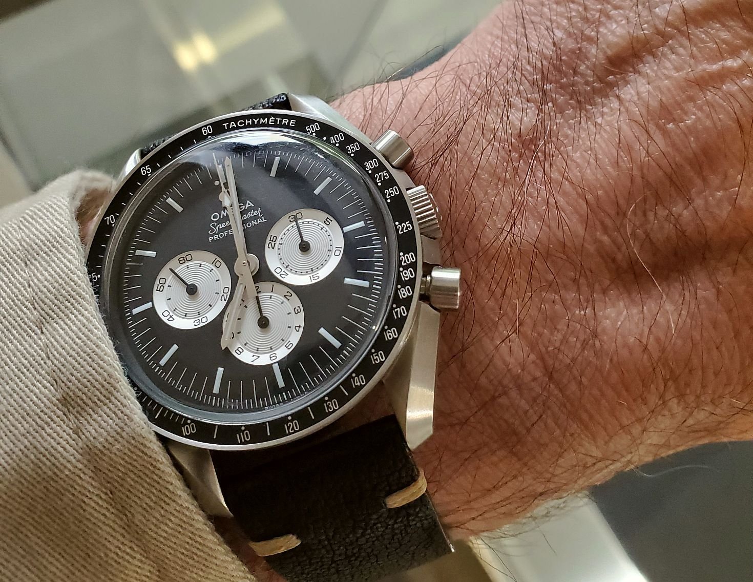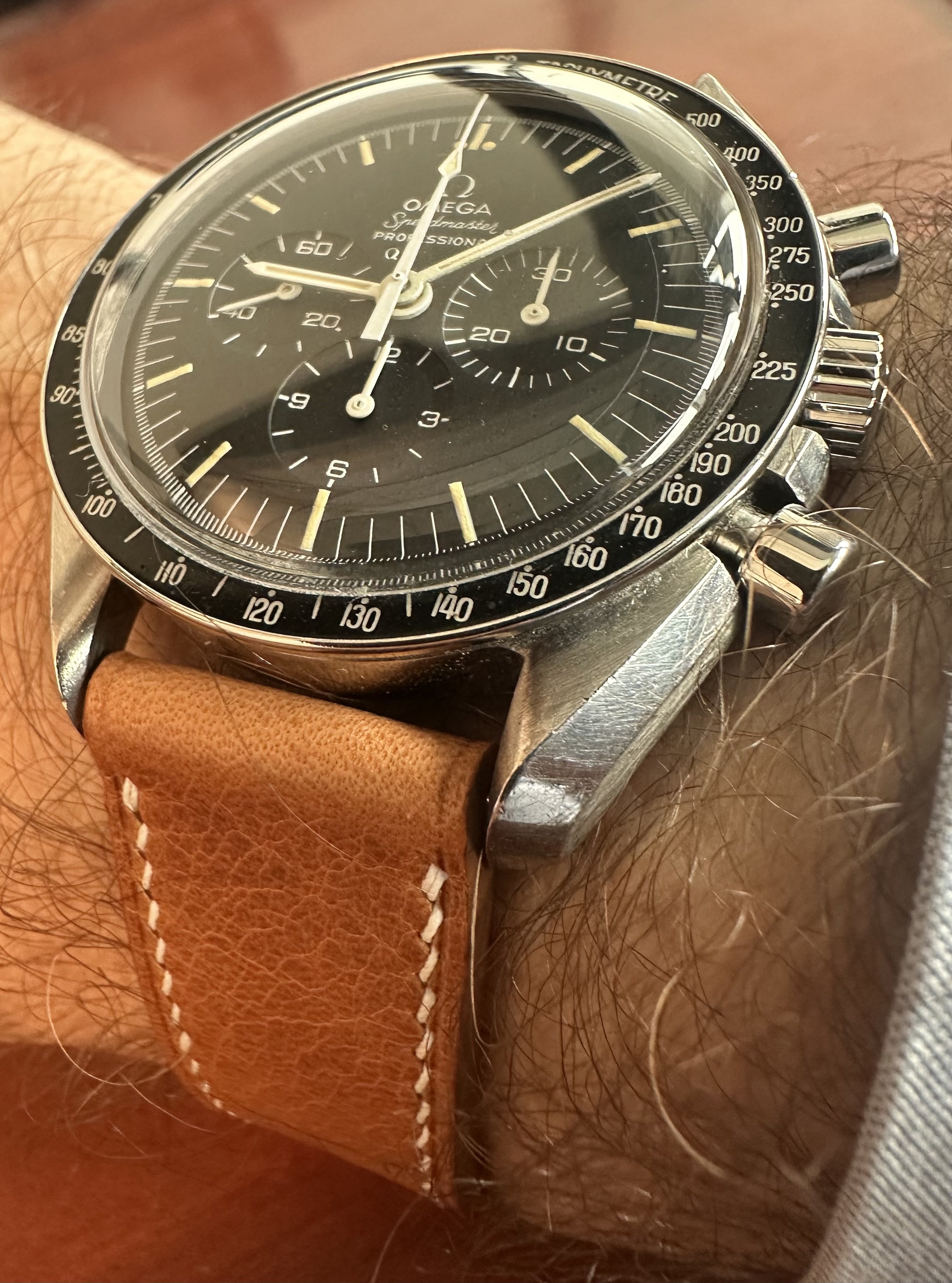 Good day all. 1969 Speedmaster Professional “Flight Qualified” Straight Writing 145.022. Off its Omega flat link bracelet today in favor of a leather strap from Artisan. Many thanks and much credit to TheGreekPhysique (“Niko”) for finding this excellent example for me.