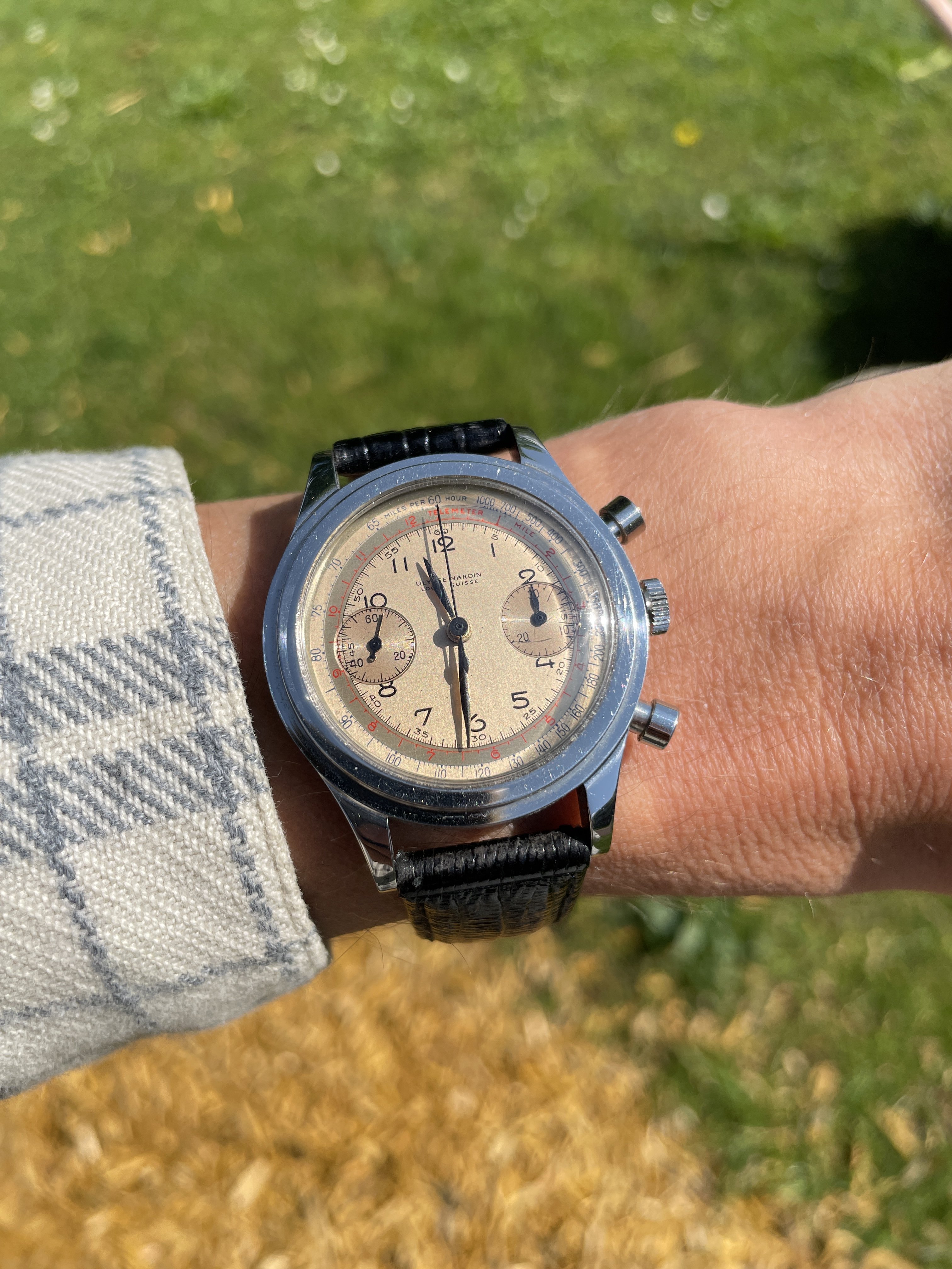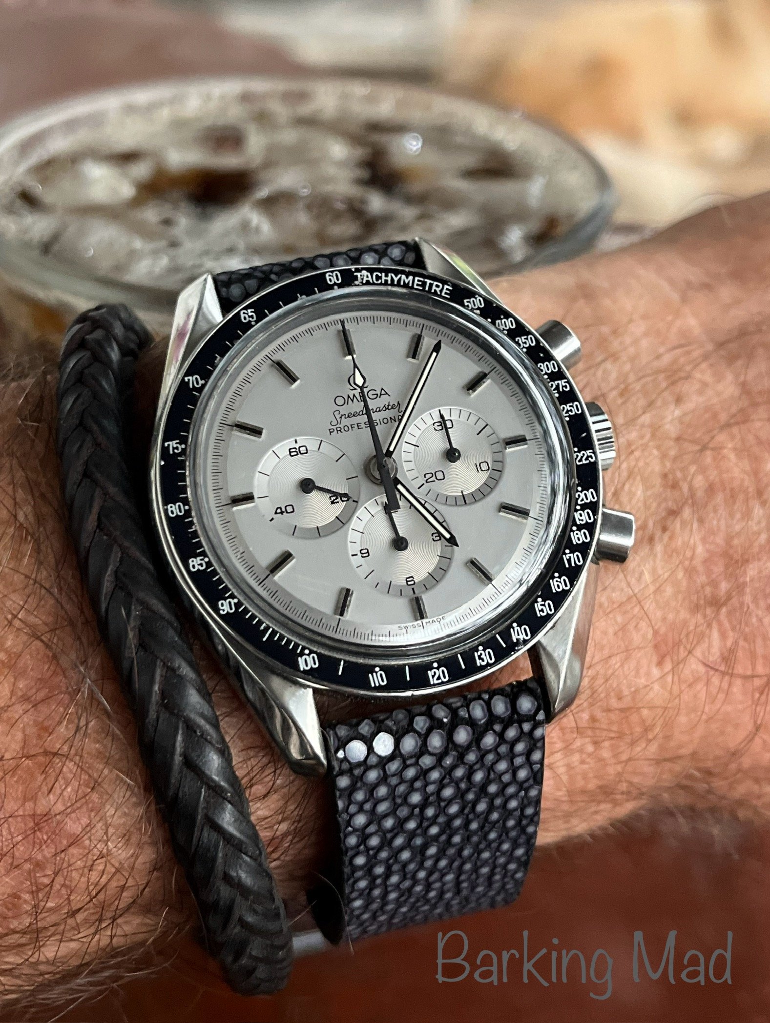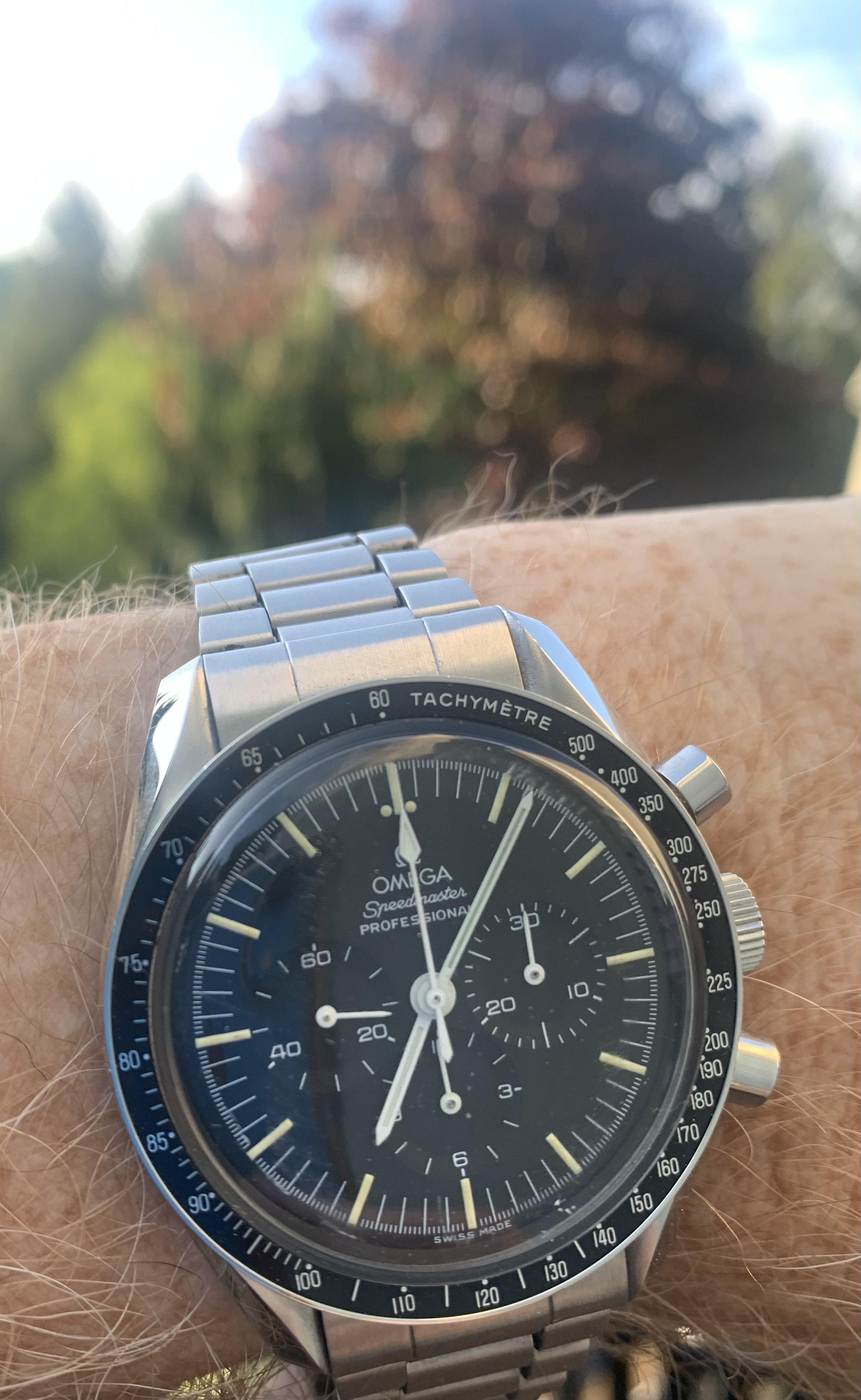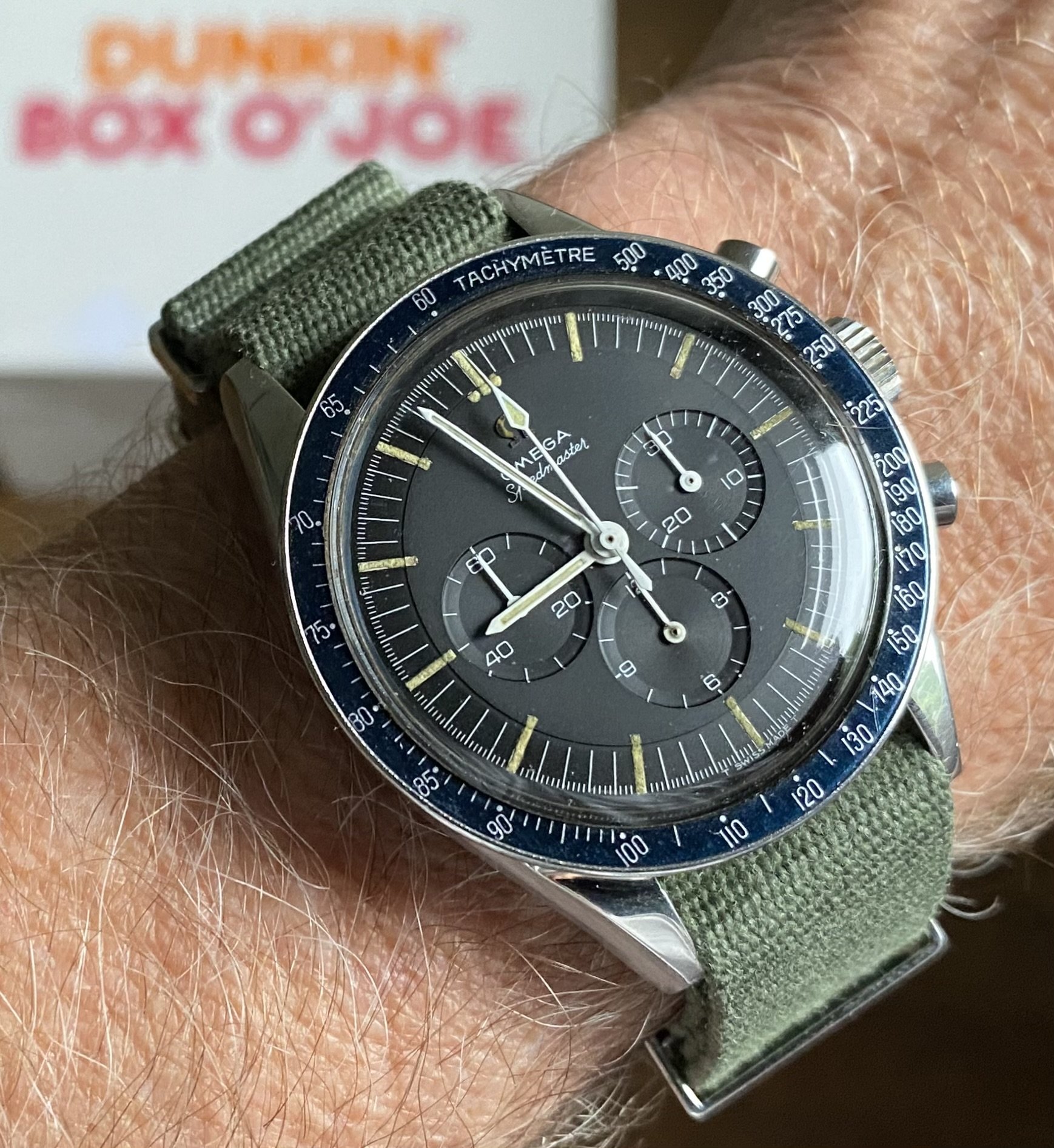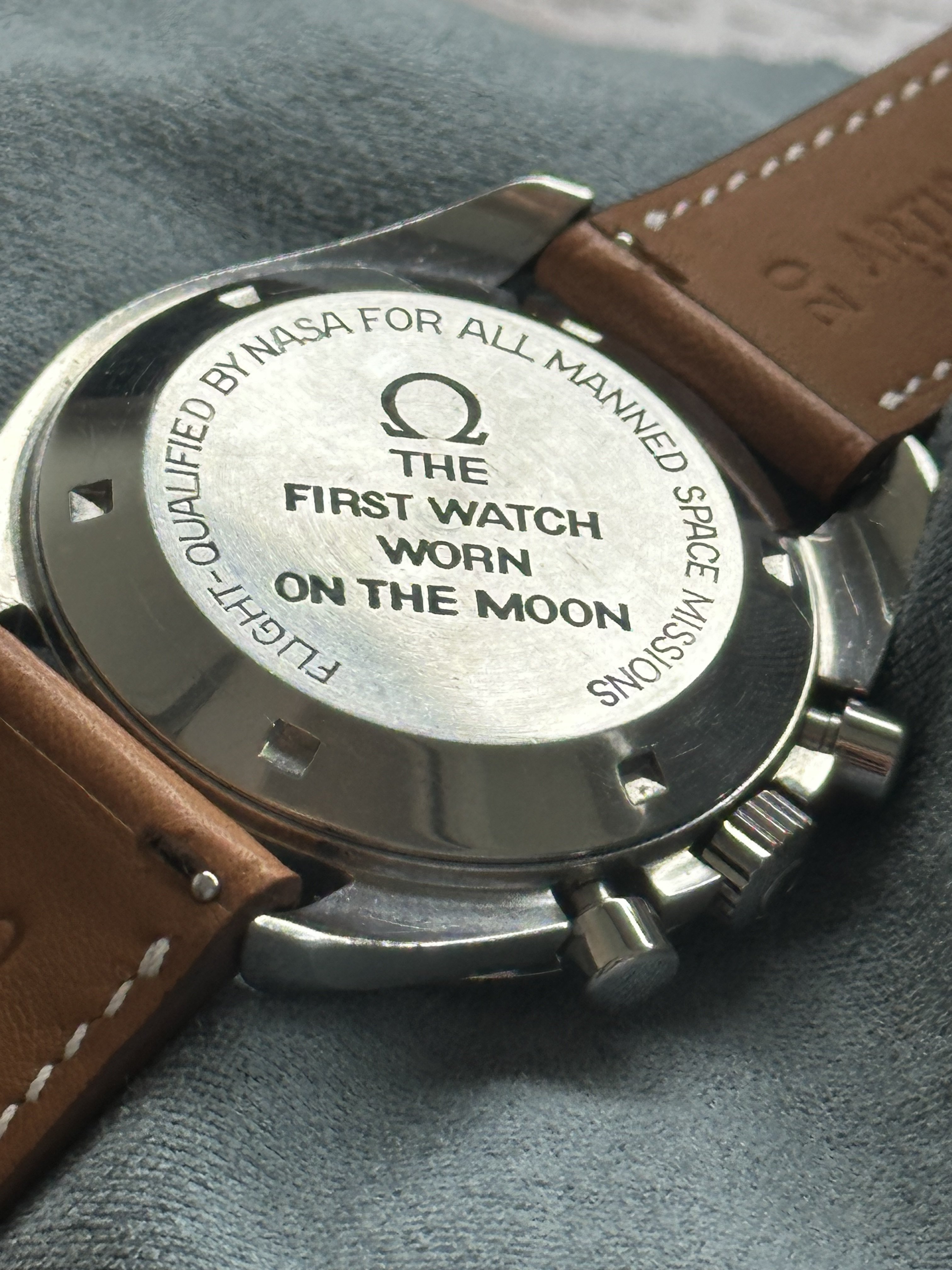 Good day all. 1969 Speedmaster Professional “Flight Qualified” Straight Writing 145.022. Off its Omega flat link bracelet today in favor of a leather strap from Artisan. Many thanks and much credit to TheGreekPhysique (“Niko”) for finding this excellent example for me.