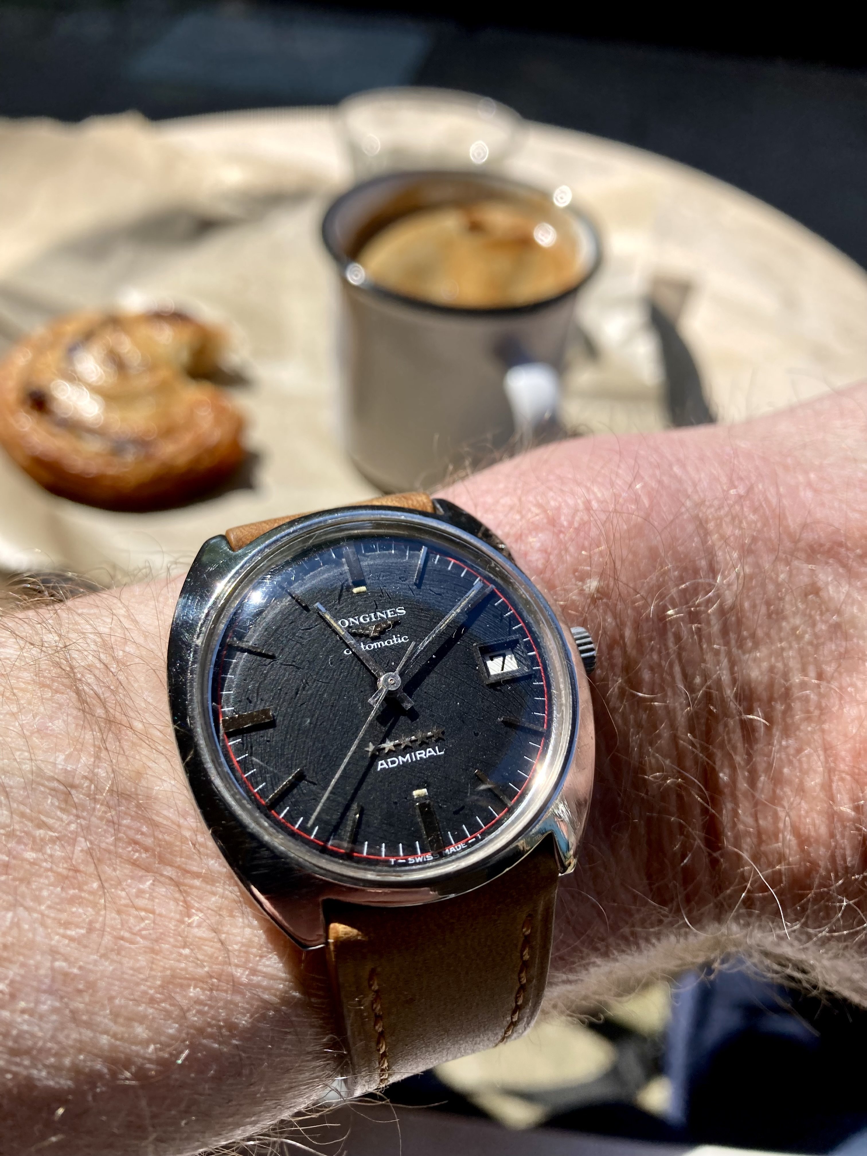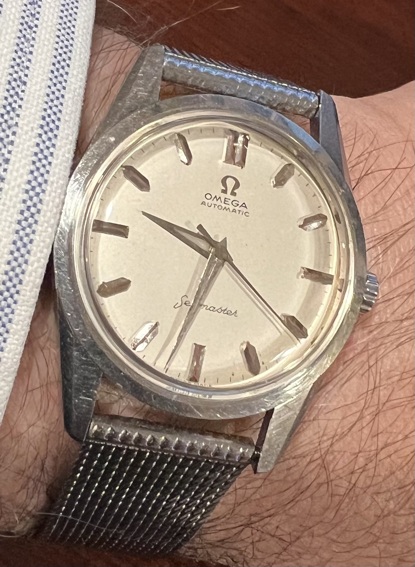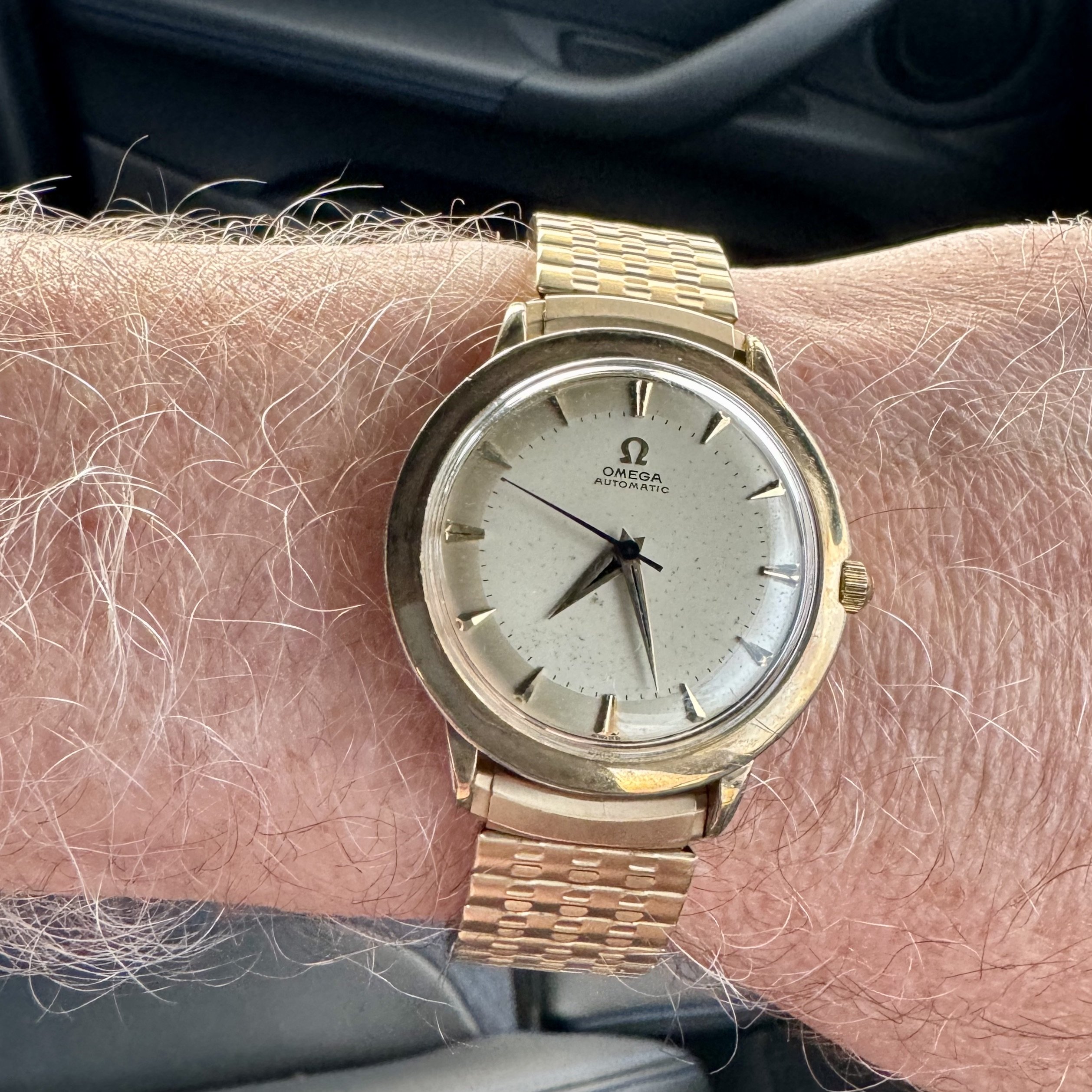 US-cased gold-capped Omega automatic, nice even patina on the dateless dial. I guess a Seamaster in all but name? Stretch bracelet only because the colours match so well!