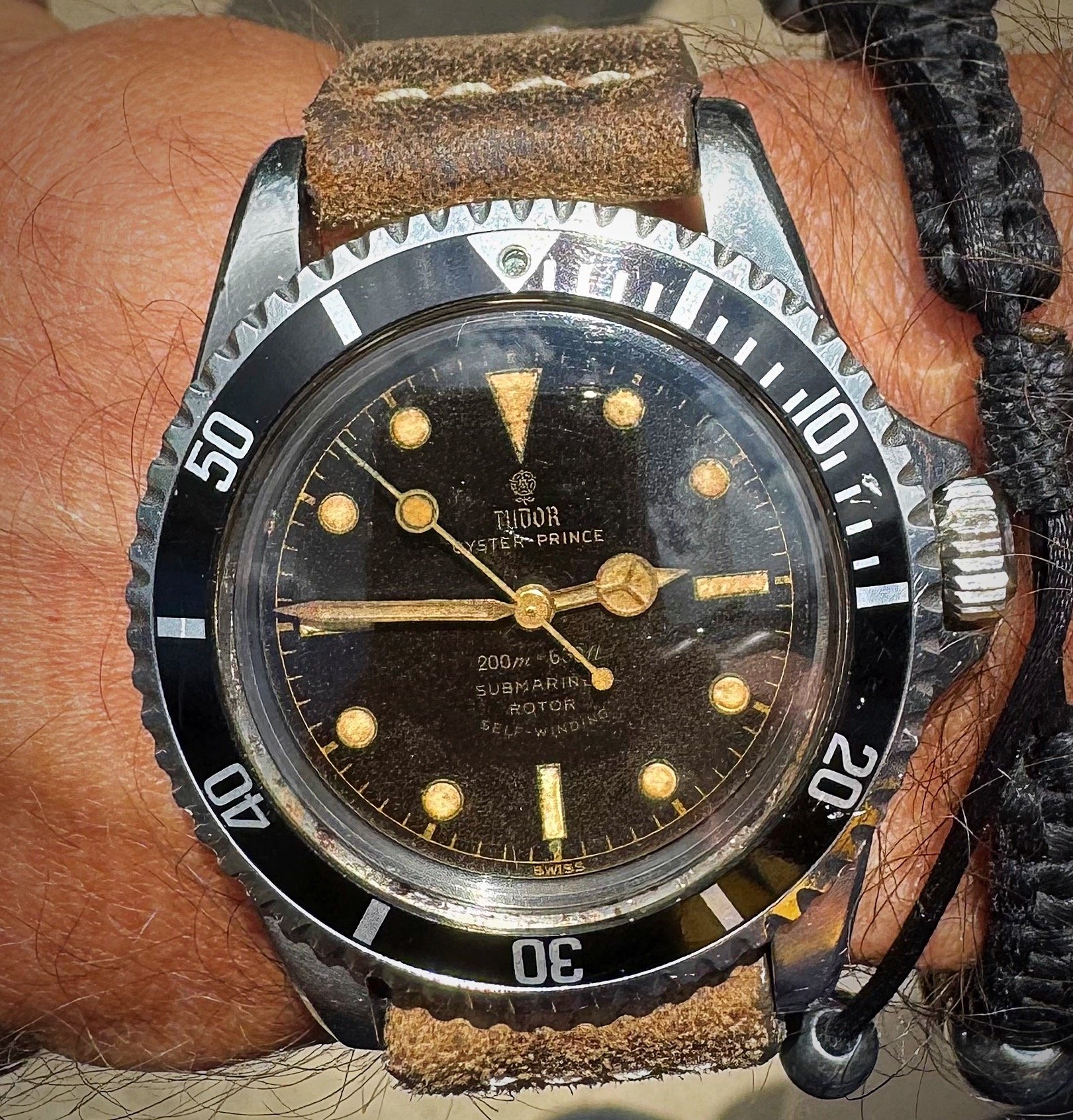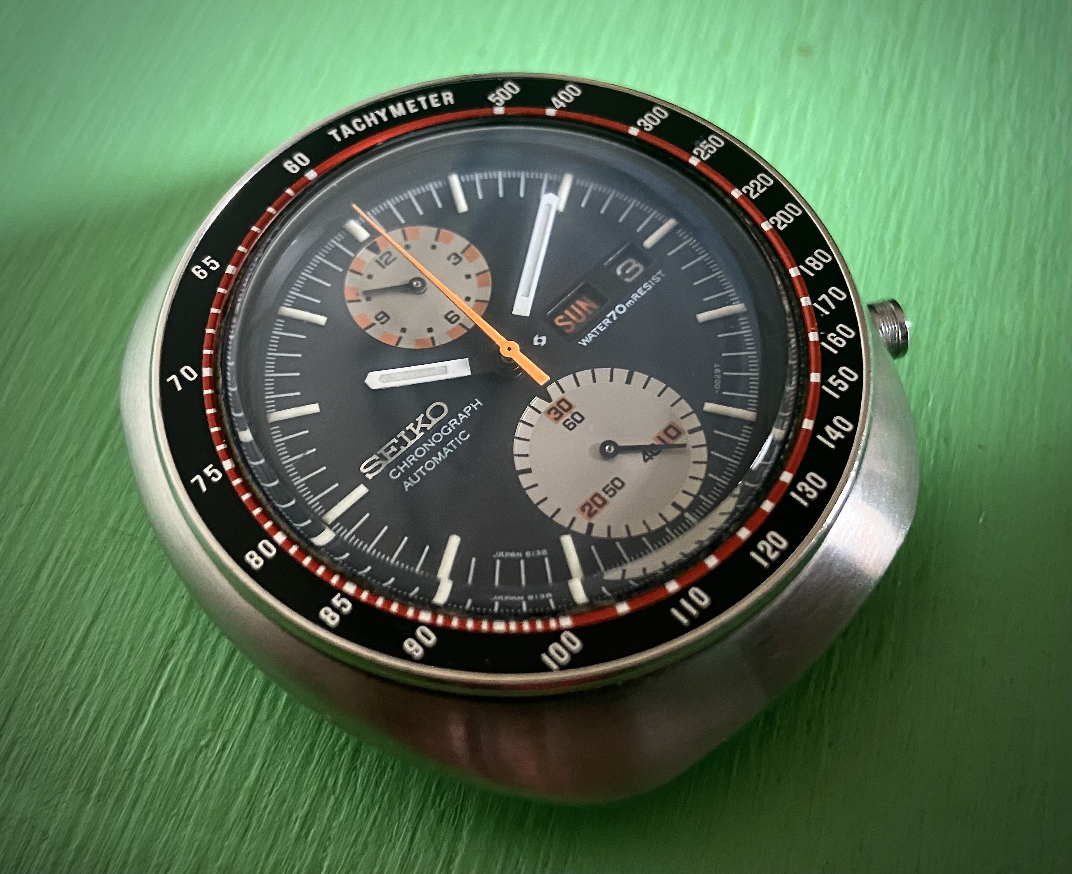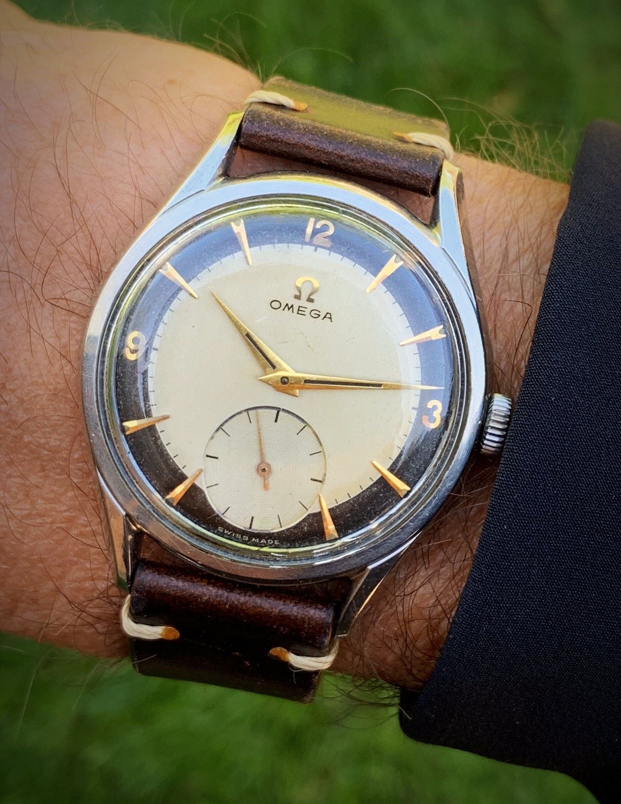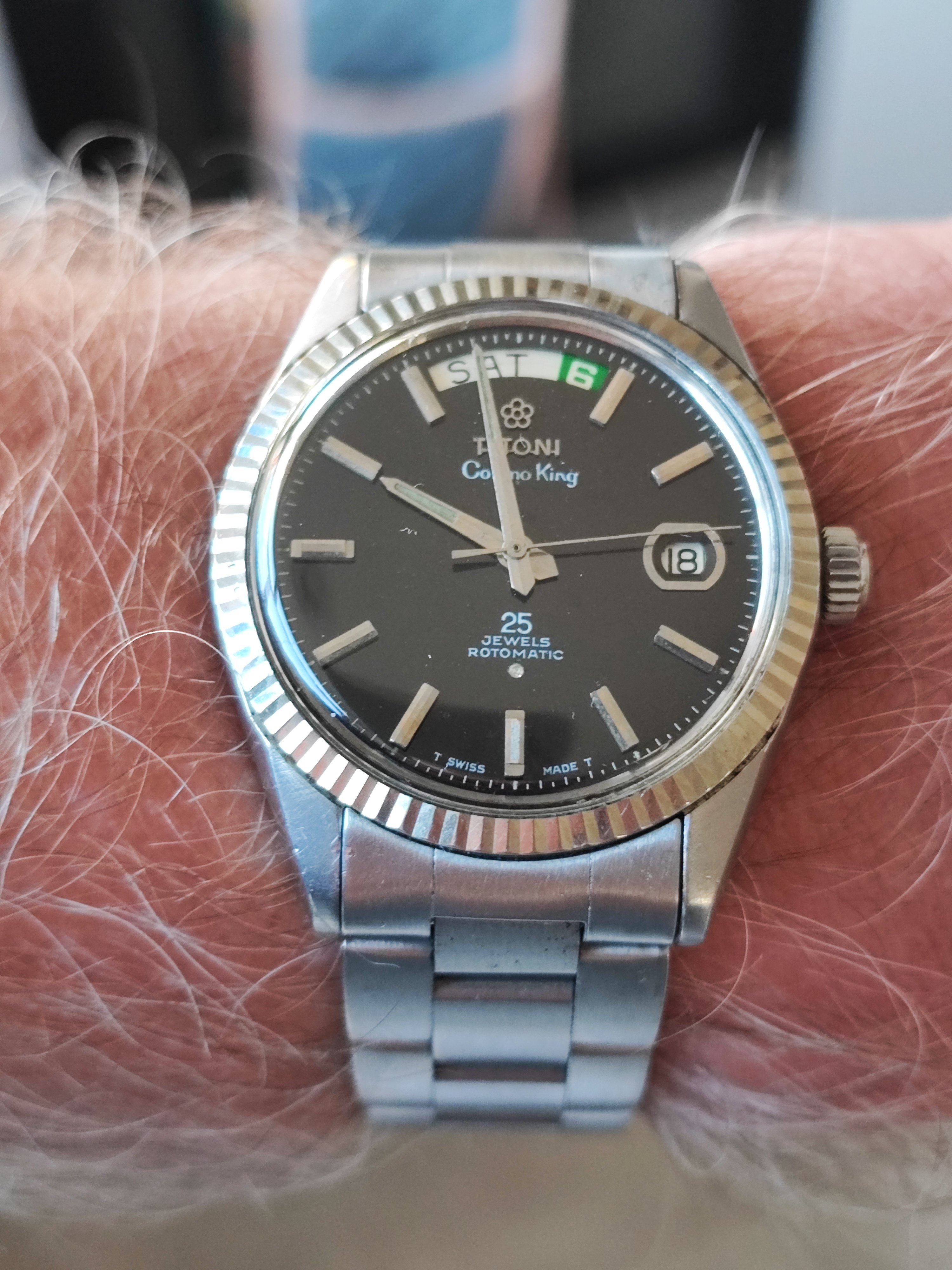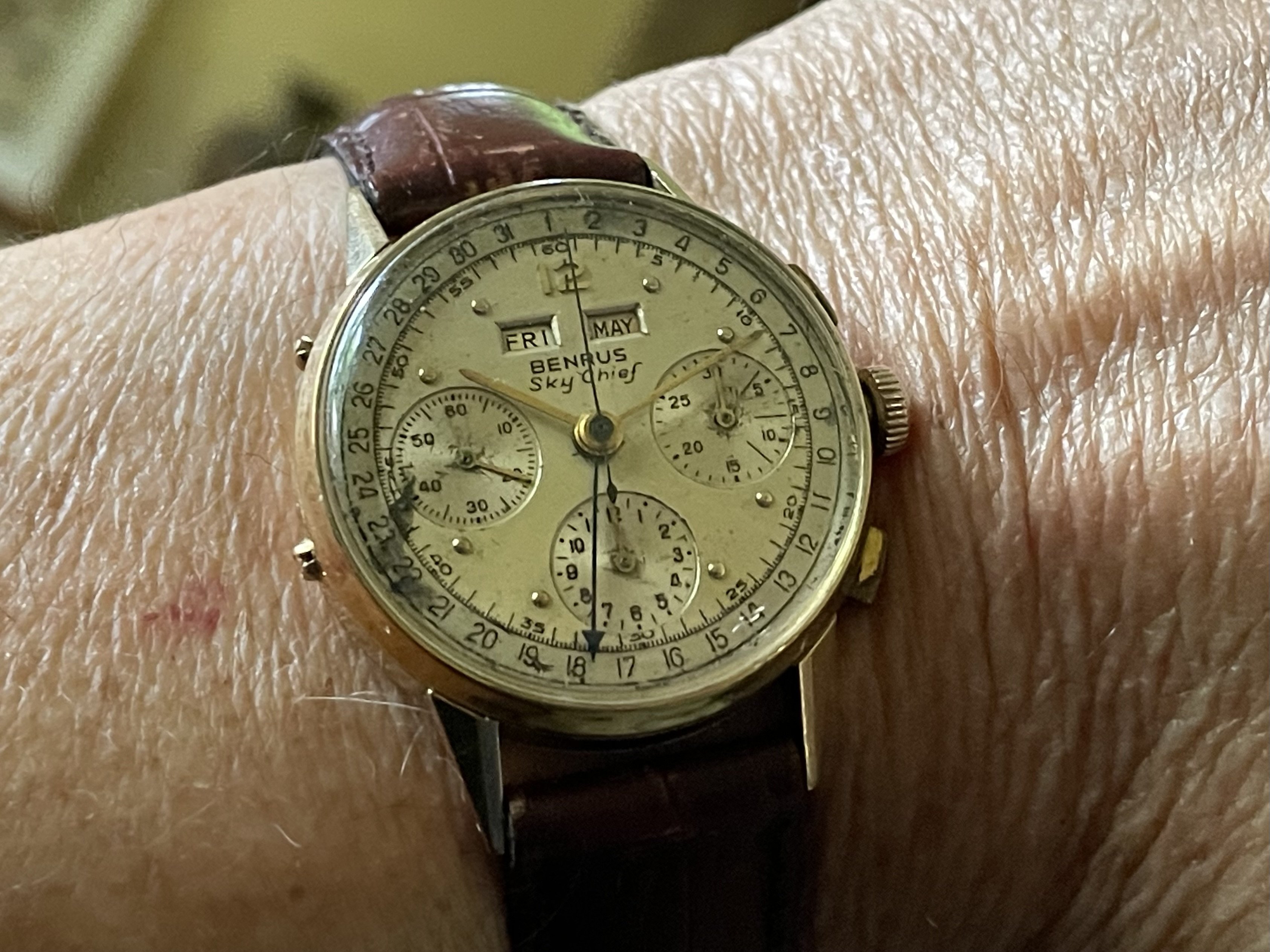 Not wearing this one today. It’s not mine. I serviced it for a friend. A bit different. The only example I have ever seen. If you depress the button at the 6:00 position, voila, it pops open to reveal a picture of your choice. In this instance, the picture is of the watch owner’s children. Date coded for 1951. In excellent condition except for a small chip in the glass crystal.
