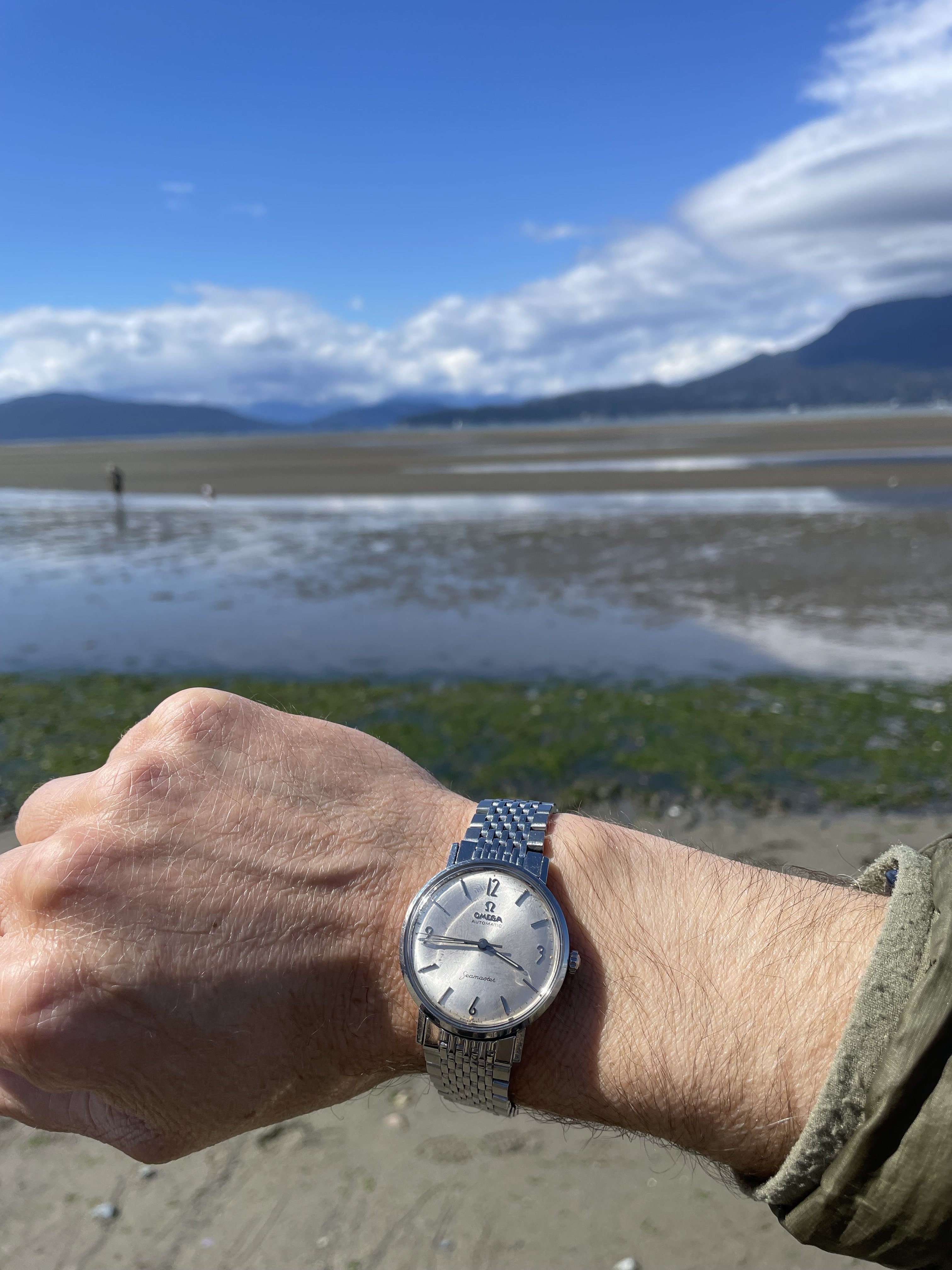 Posts 5,082 Likes 15,696 DaveK ·May 25, 2024 Sea-based day with my ‘61 Seamaster at low tide Passed on getting some ice cream Time to watch the tugs
