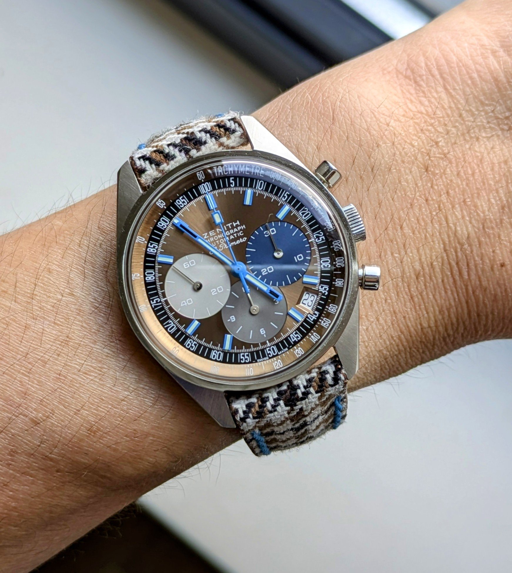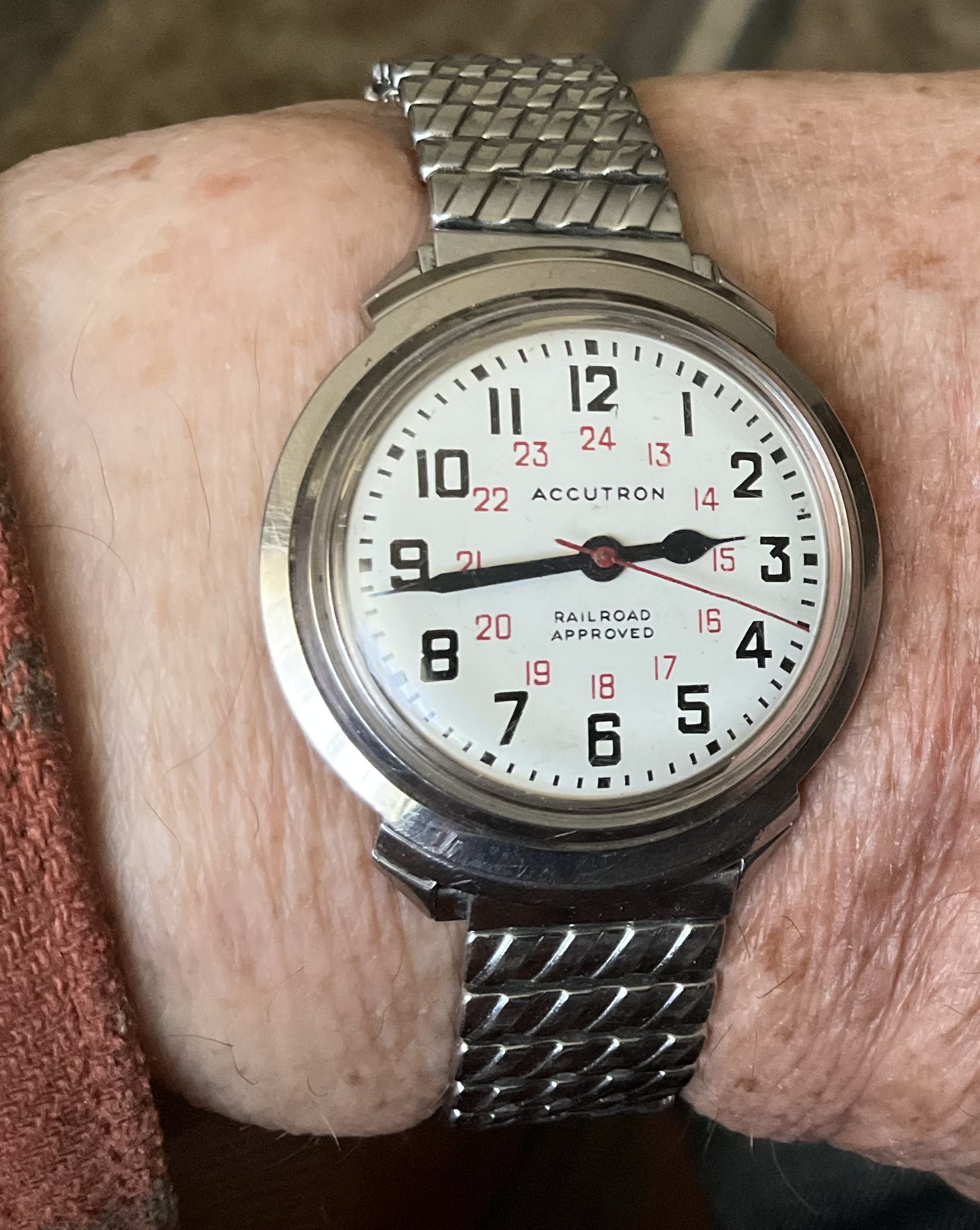 An example of one of what was considered by many to be the most successful early railroad standard wrist watches. An Accutron 214 Railroader from 1965. Almost 60 years old! “Canadian” 24-hour dial. I have no recollection of where I acquired this one. So many of these have fallen into my lap over decades. I had a devil of a time trying to find out why this one would run well OUT of the case, but it wouldn’t run IN the case. I changed the hatch cover over the cell, and voila, it runs. Obviously a cell contact problem.