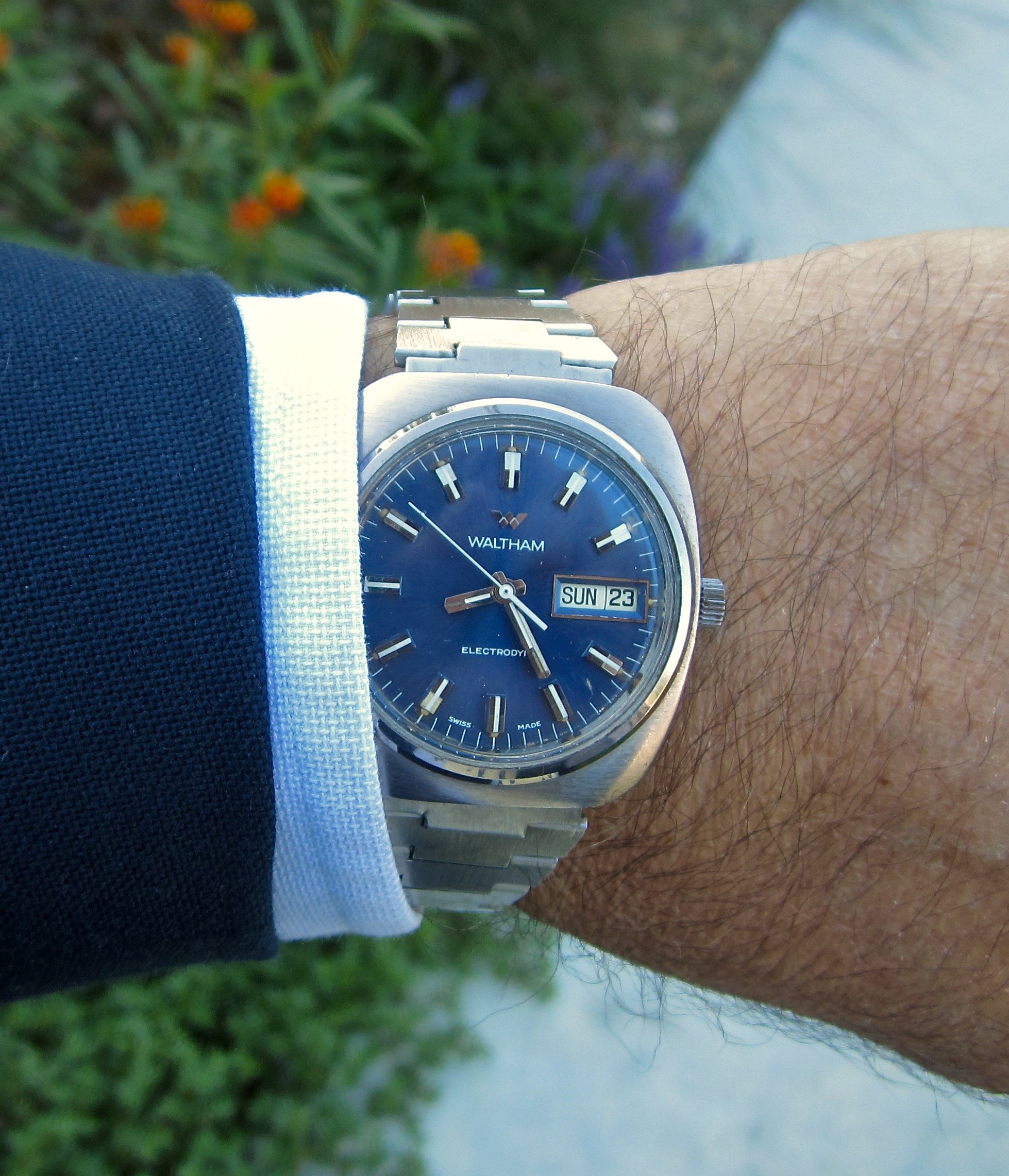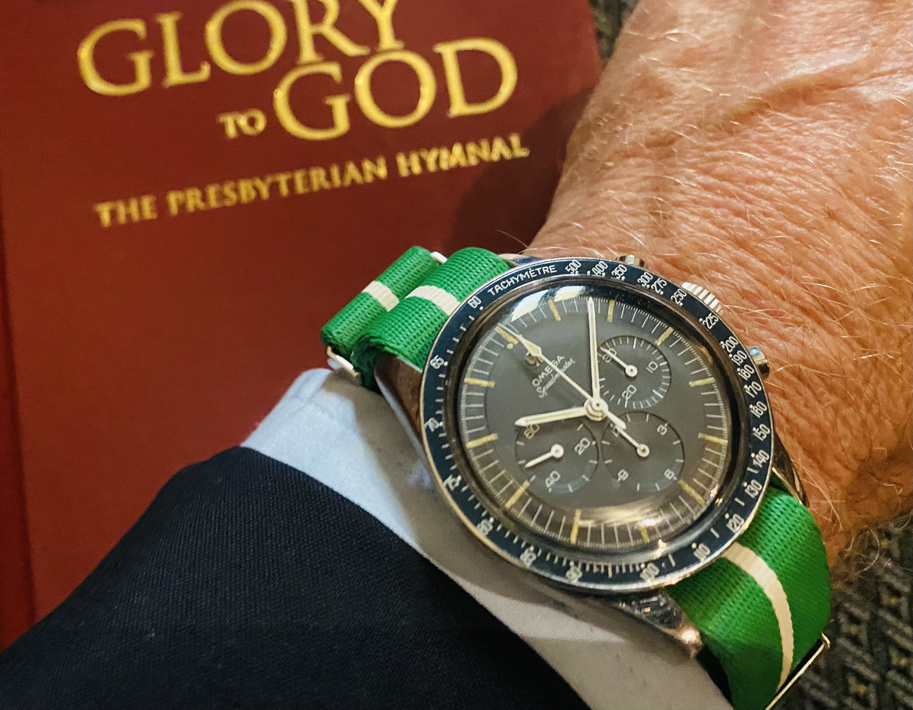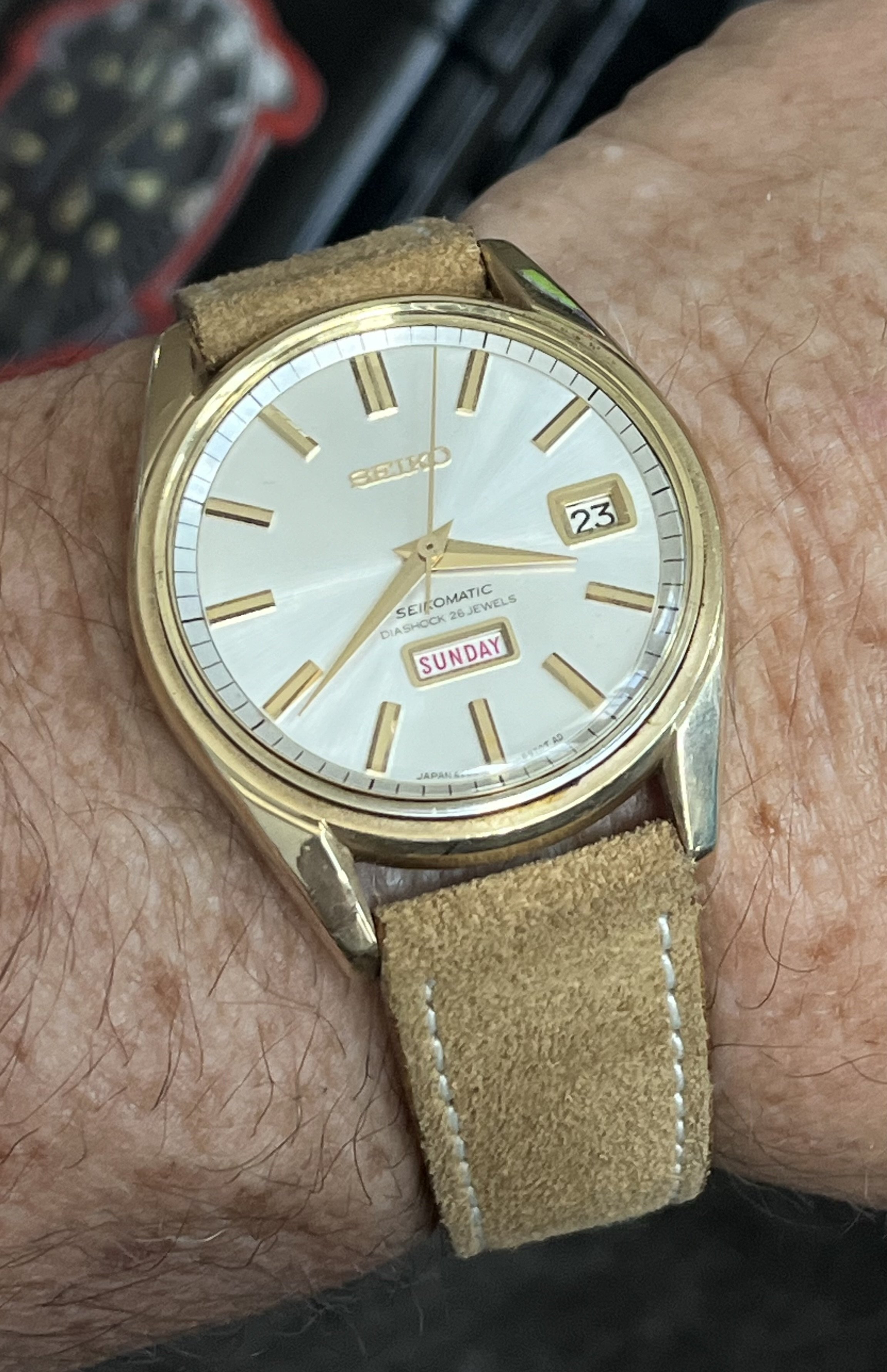 An old watch my father-in-law wore years ago which came to us recently. It was in my dresser drawer and running so was a hurried choice before church this morning.