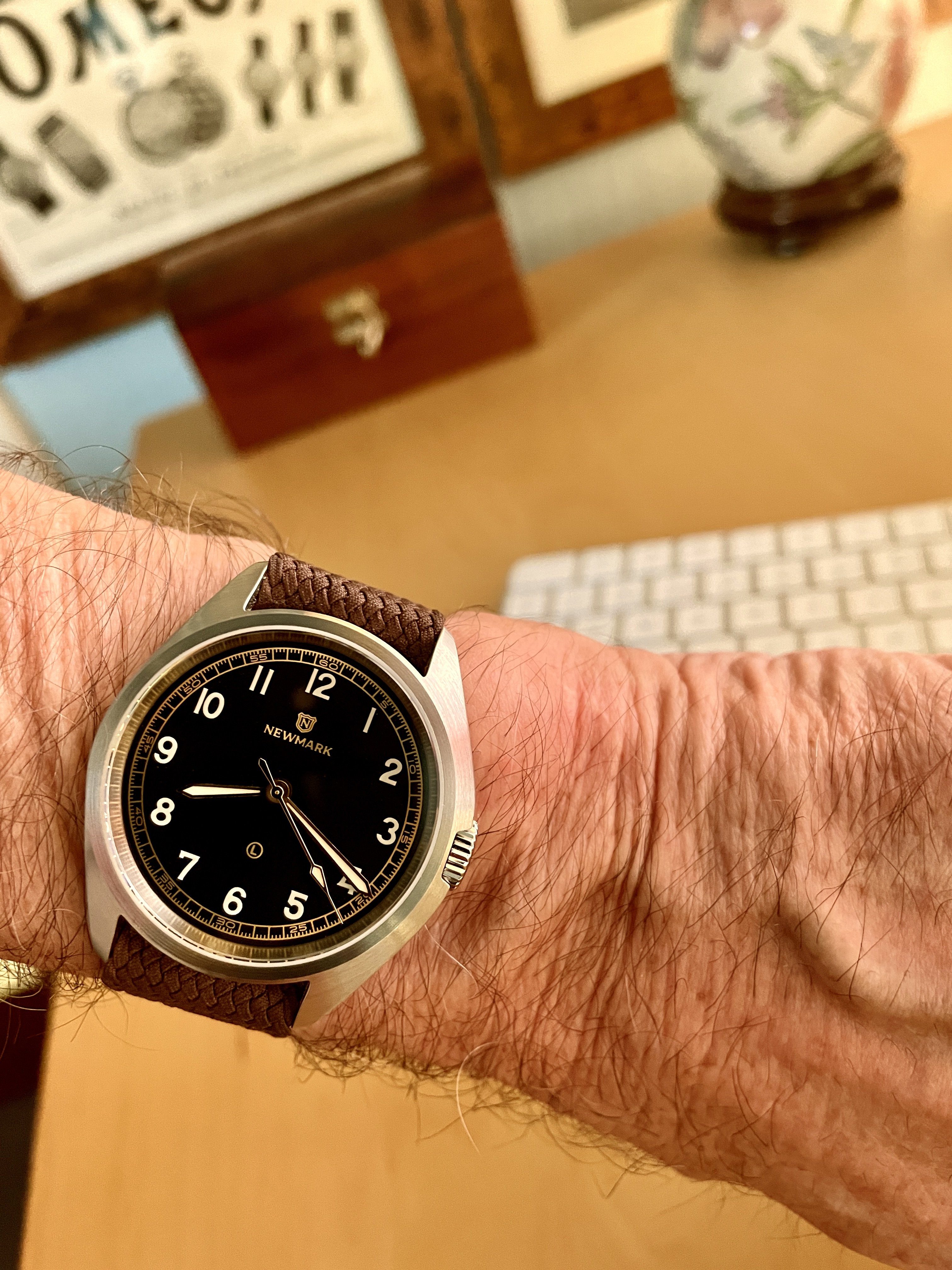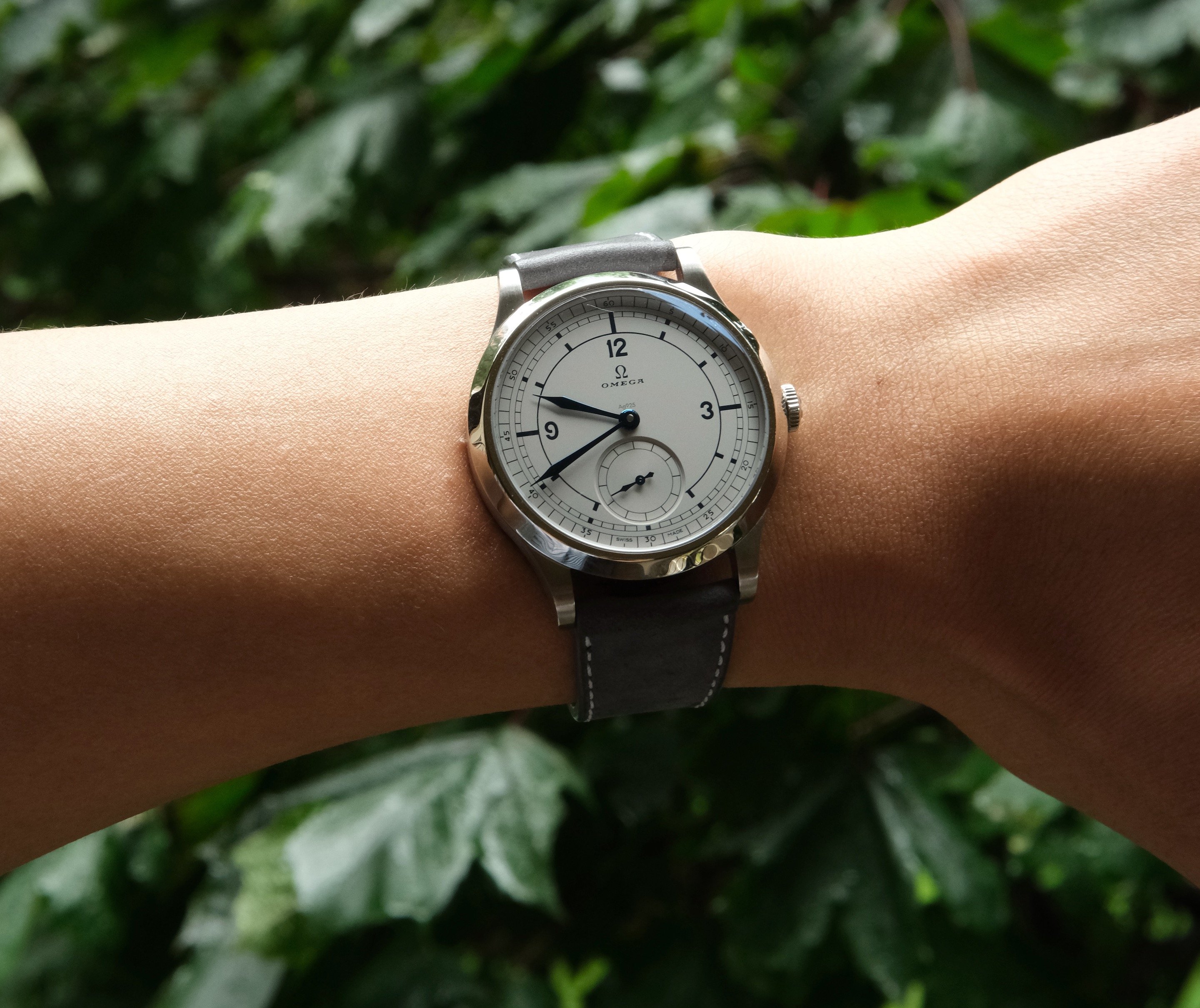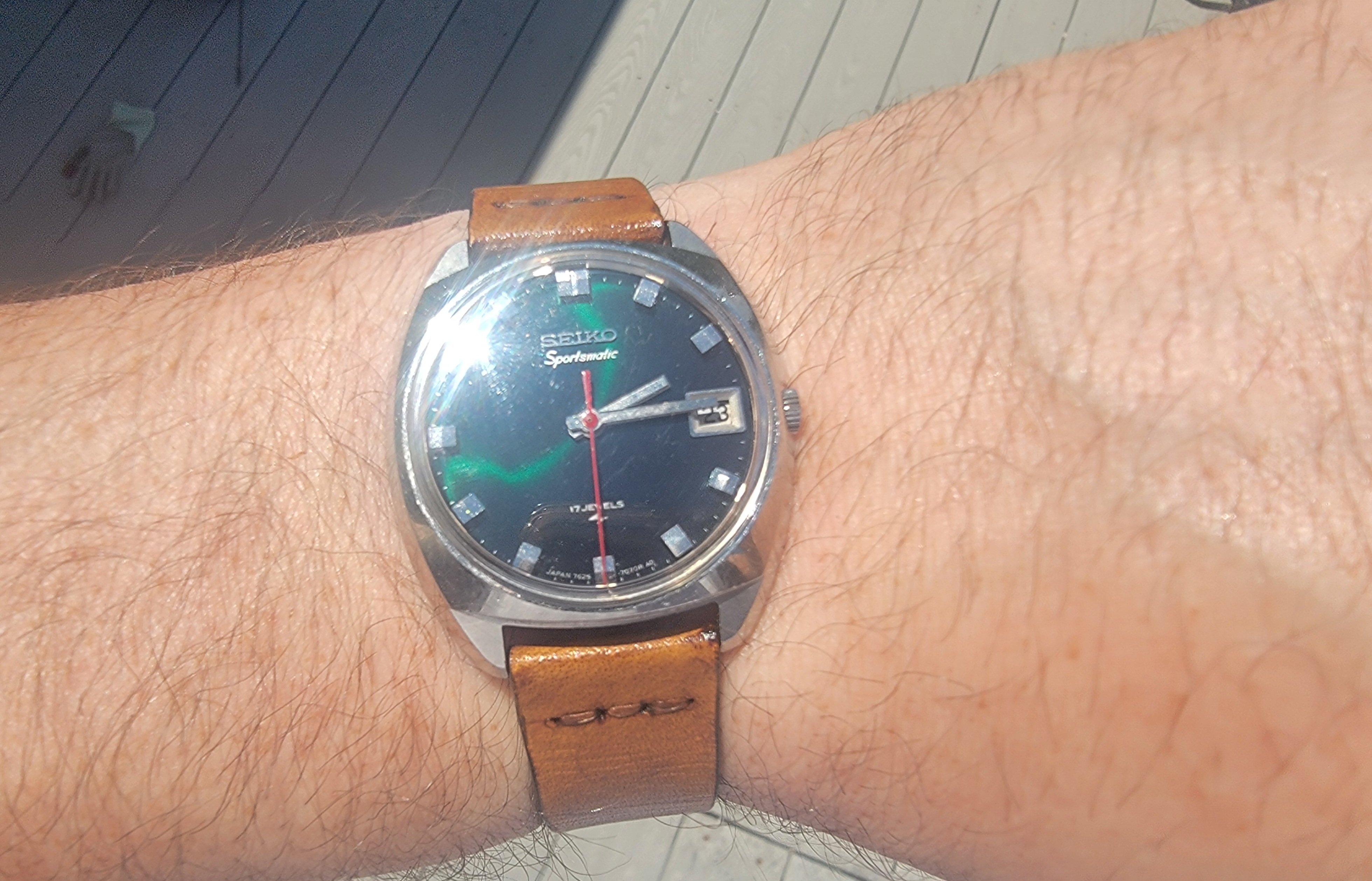 An old watch my father-in-law wore years ago which came to us recently. It was in my dresser drawer and running so was a hurried choice before church this morning.