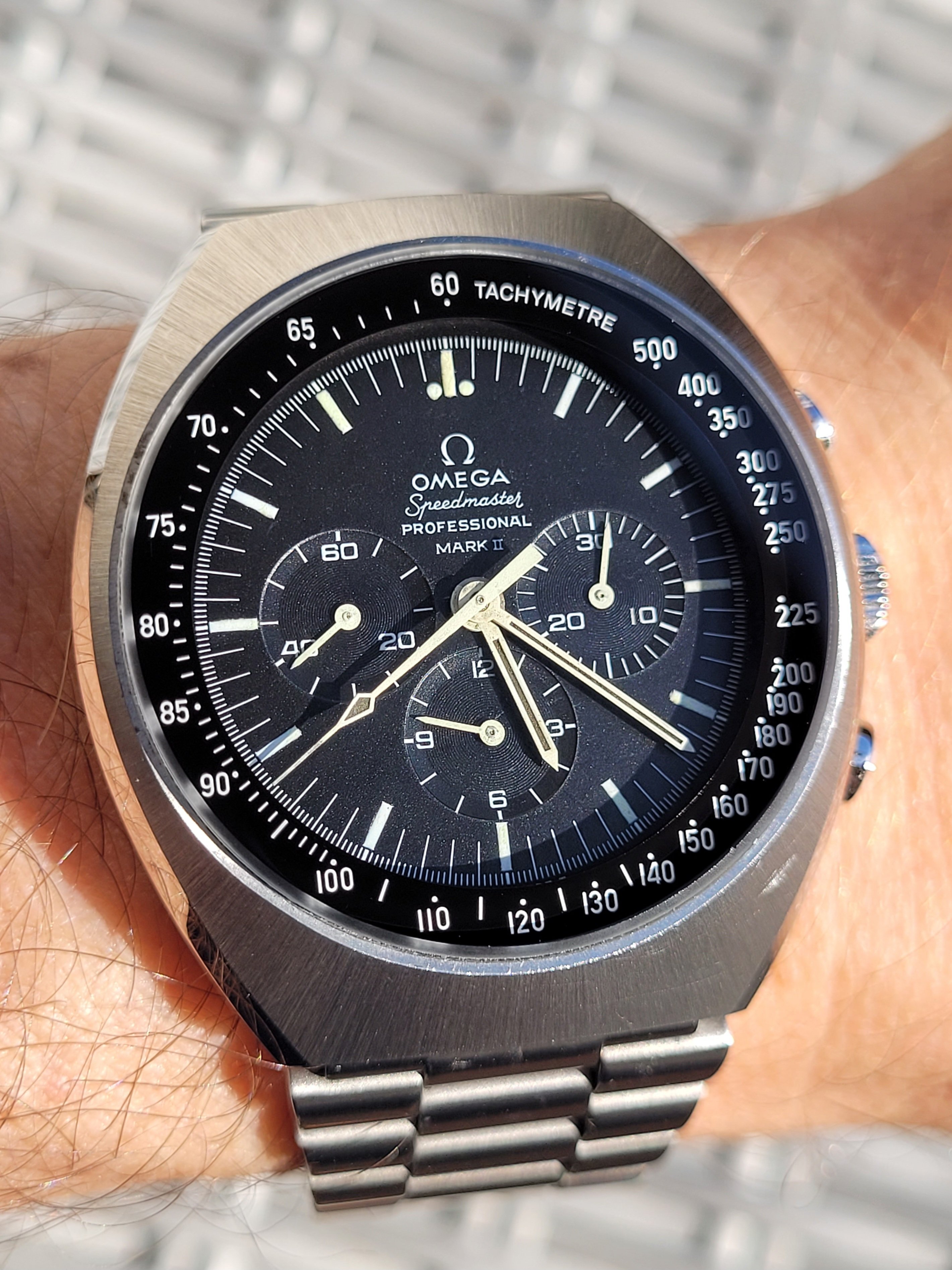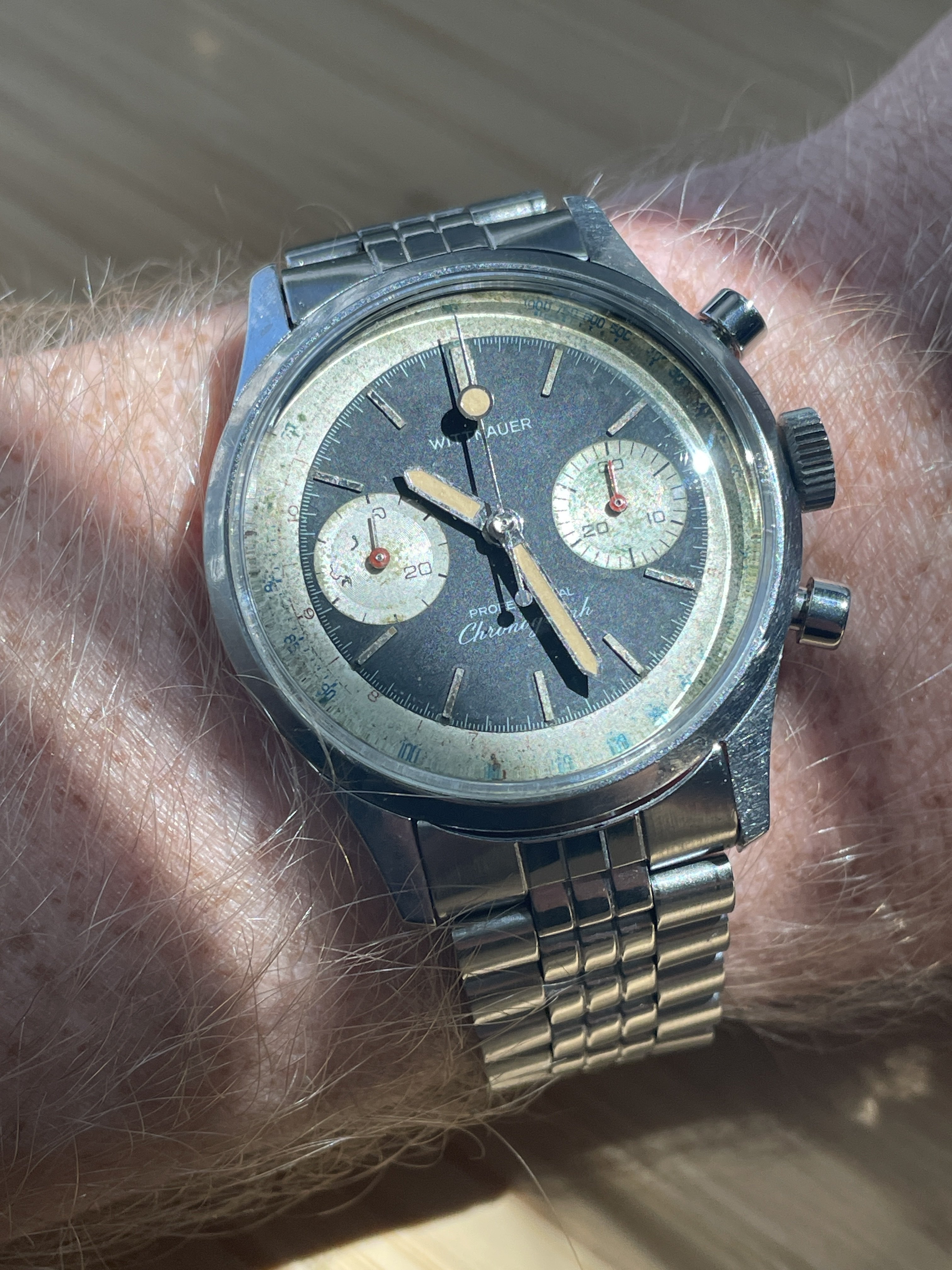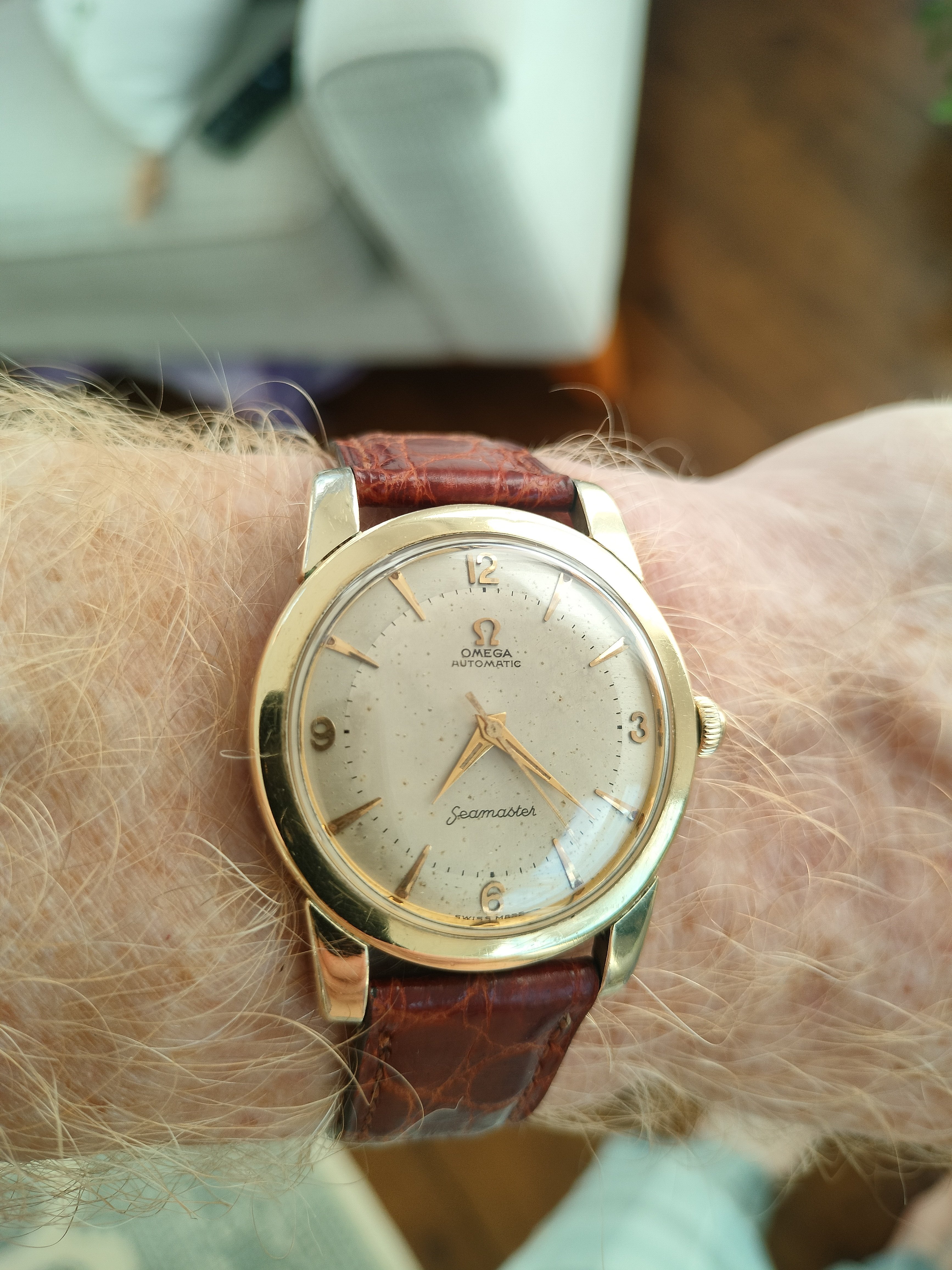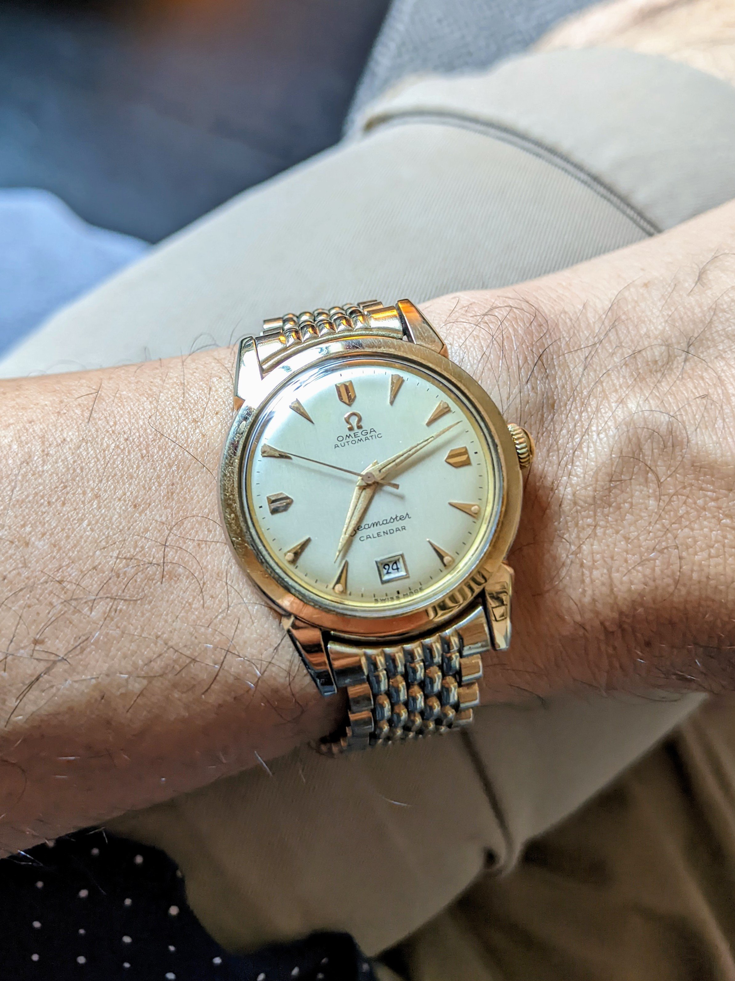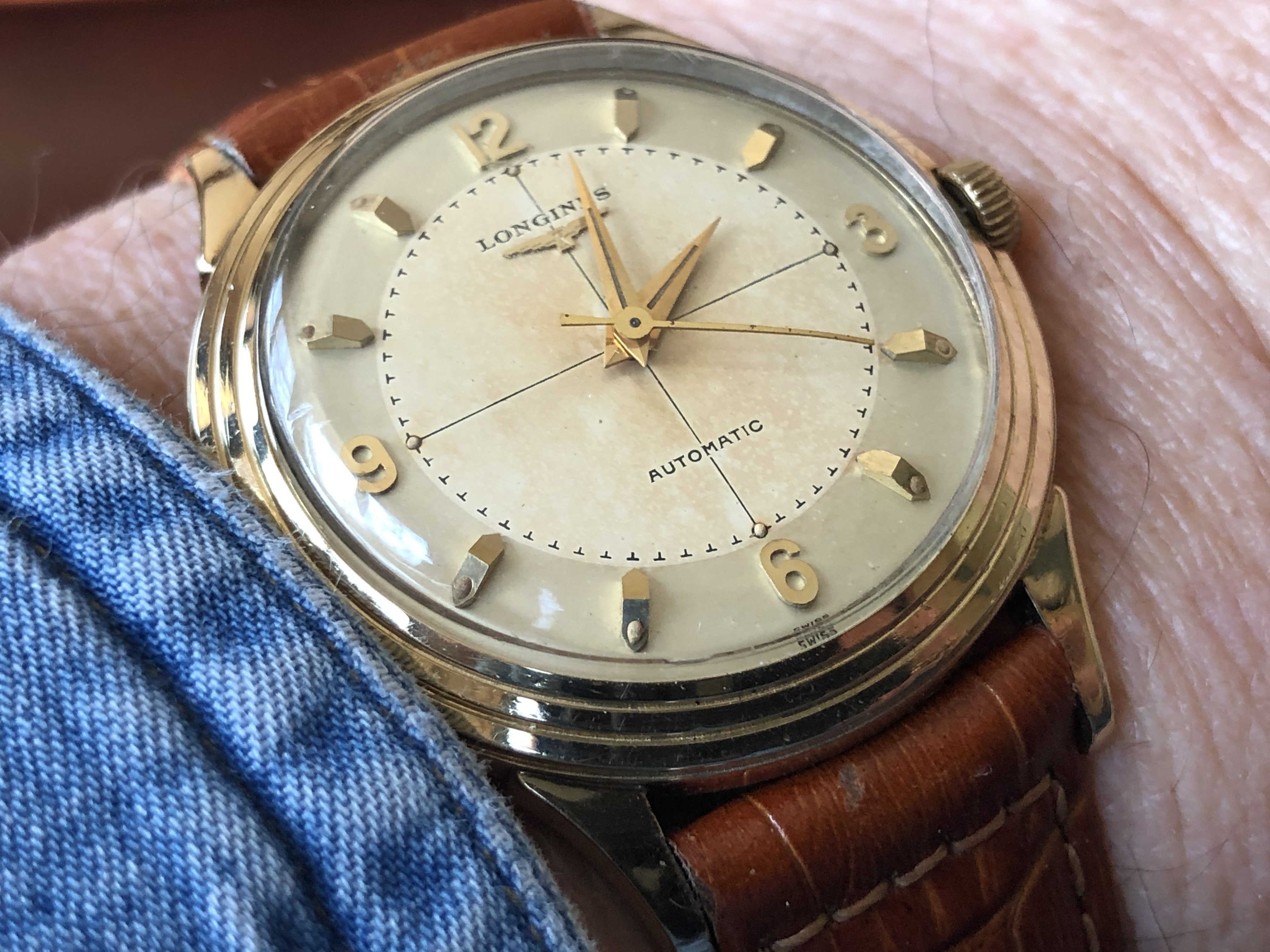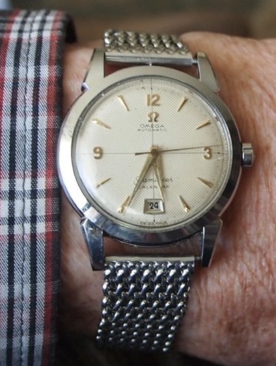 My early 1950s calibre 355 bumper automatic sends salutations. This one had reposed in pieces in a lozenge tin containing numerous other calibre 3XX Omega automatics. The first component to attract my attention was the dial. Further examination of the contents of the lozenge tin showed me that the entire movement was there! In pieces! Sadly, there was no case for it. I conditioned the watch and re-assembled it. An OMB member @Tritium who lives in Madrid (Spain) had an extra NOS case. A deal was made, and Bob’s your uncle! Waffle dial with crosshairs is original.