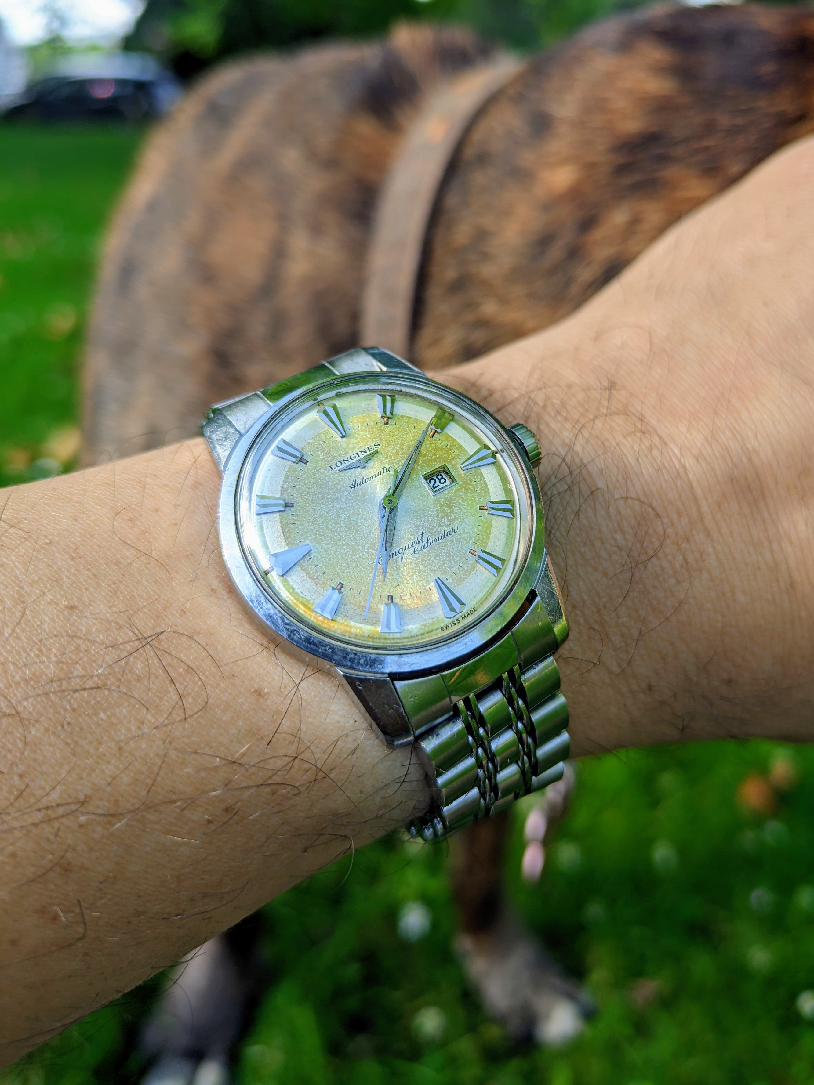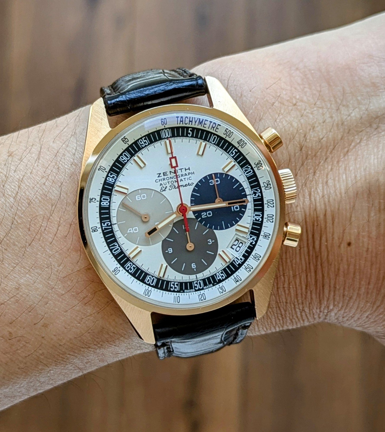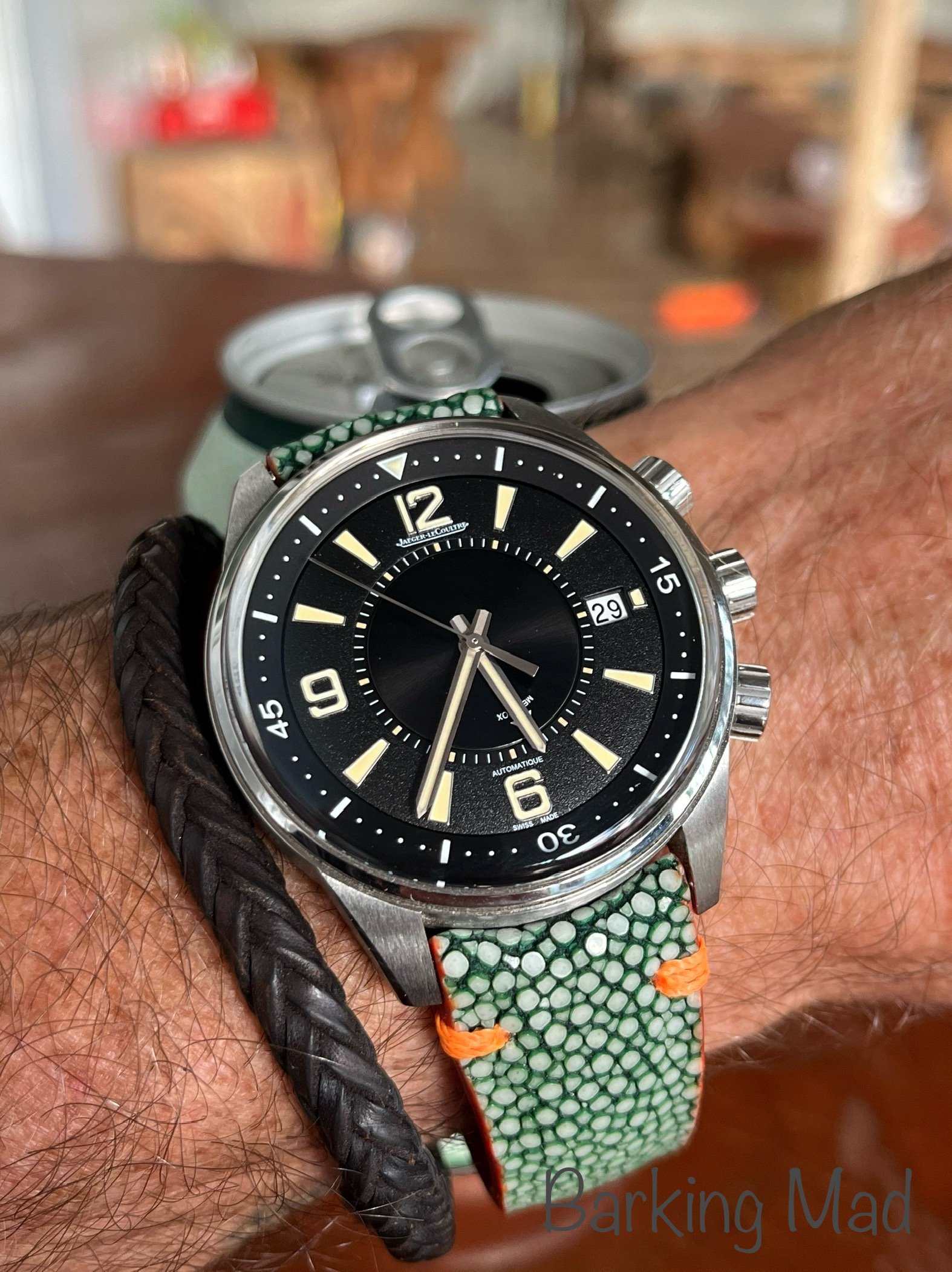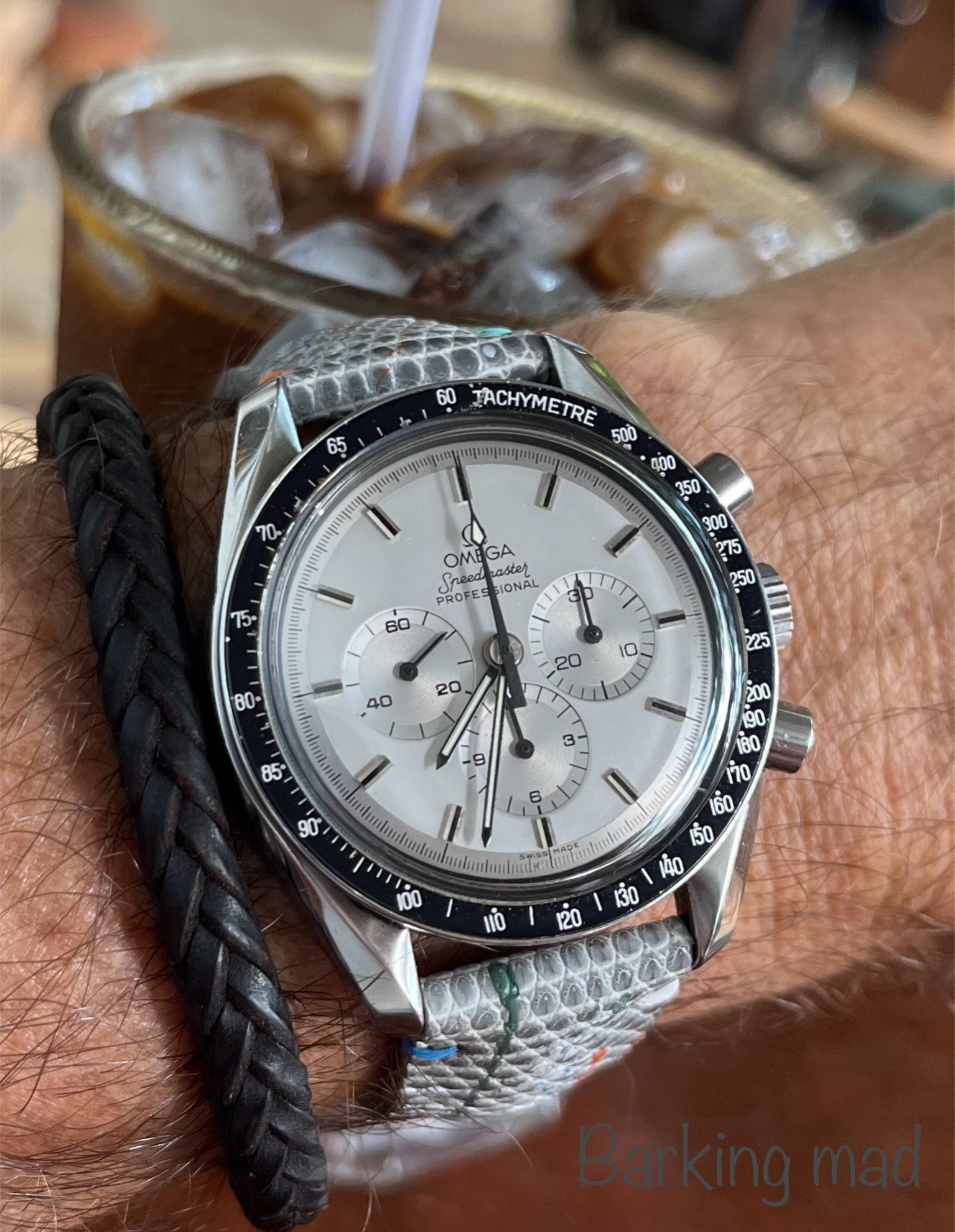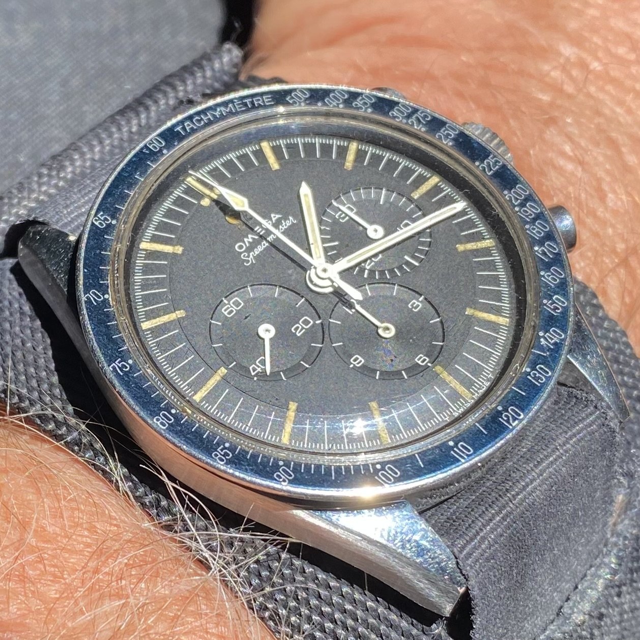 Tokyo 2020 Speedmaster with Sedna gold bezel, pushers and crown, a really different look for this watch with the grey dial, green bezel with gold numbers/letters. I put it on a Genteel Handmade green calfskin strap with light green stitching. Nothing wrong with a bit of color.