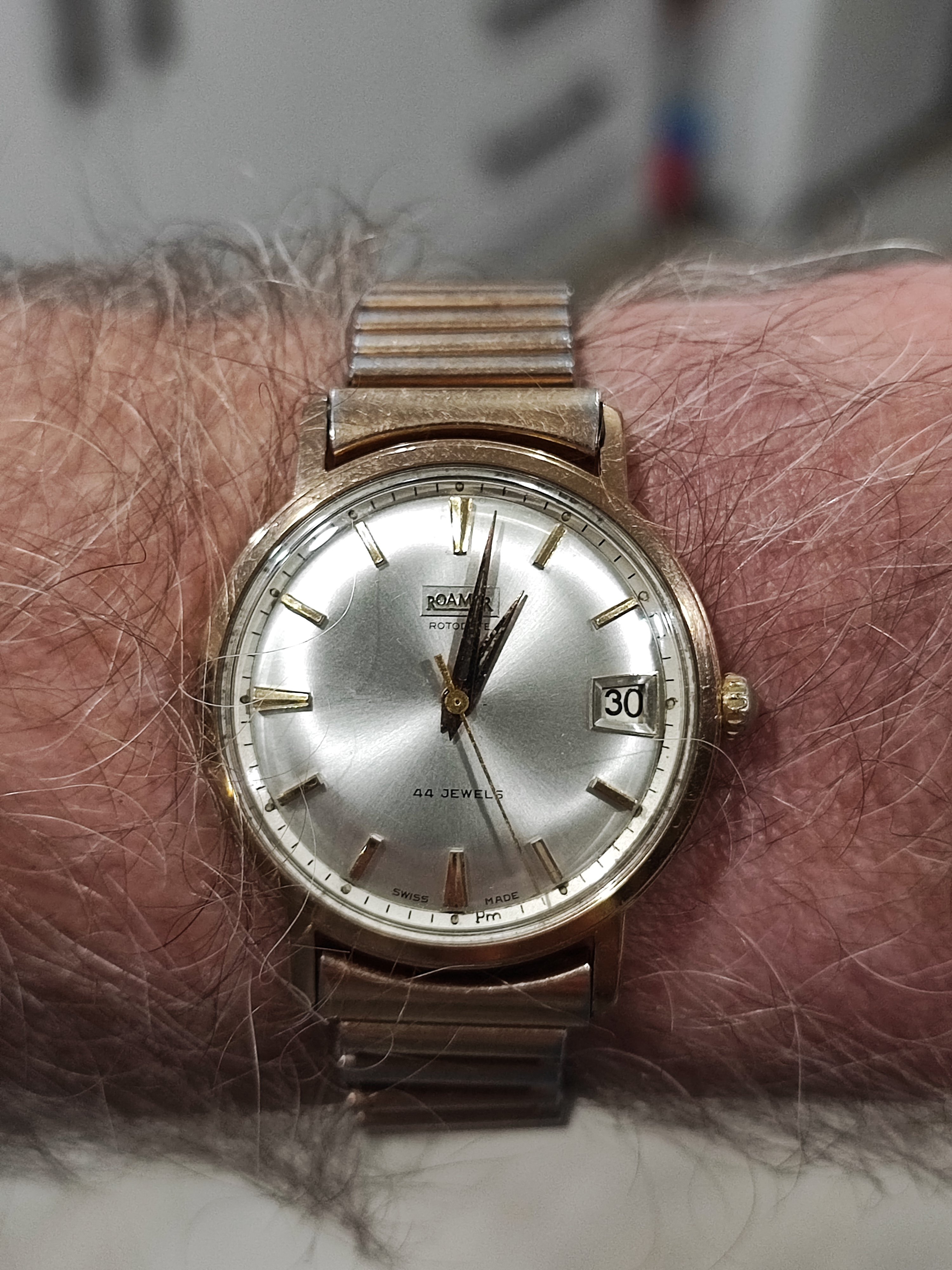 ·A very recent acquisition, has a gloriously minty dial and raised applied Roamer logo which is very rare on these early 44 Jewel watches.