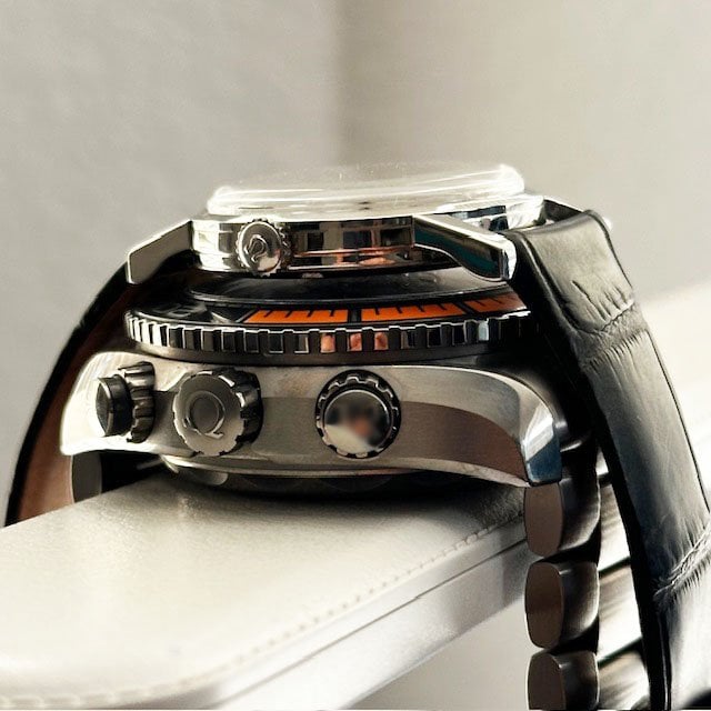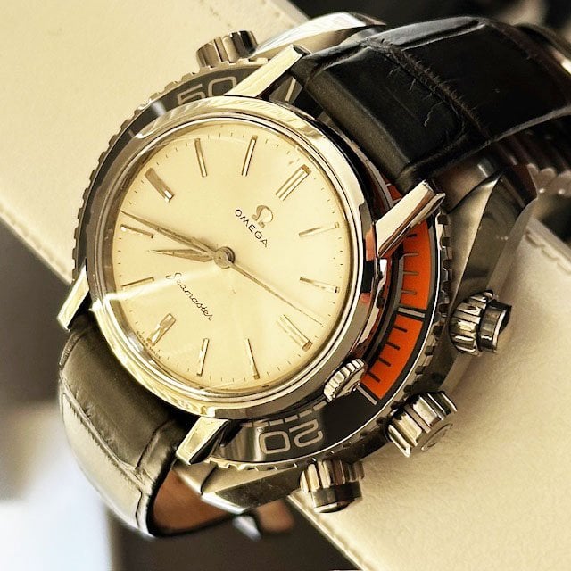 - Ca. 1971 Mathey-Tissot “Mergulhador” Skin Diver - Ref. 1635 - powered by a “Ultra High Frequency” (UHF) Mathey-Tissot signed ETA 2784 automatic movement. (f ~ 28,800 A/h vs. 21,600 A/h) - At 38mm, reference 1635 came with various iridescent dials including turquoise, red and orange. Mergulhador means “scuba diver” in Portuguese.