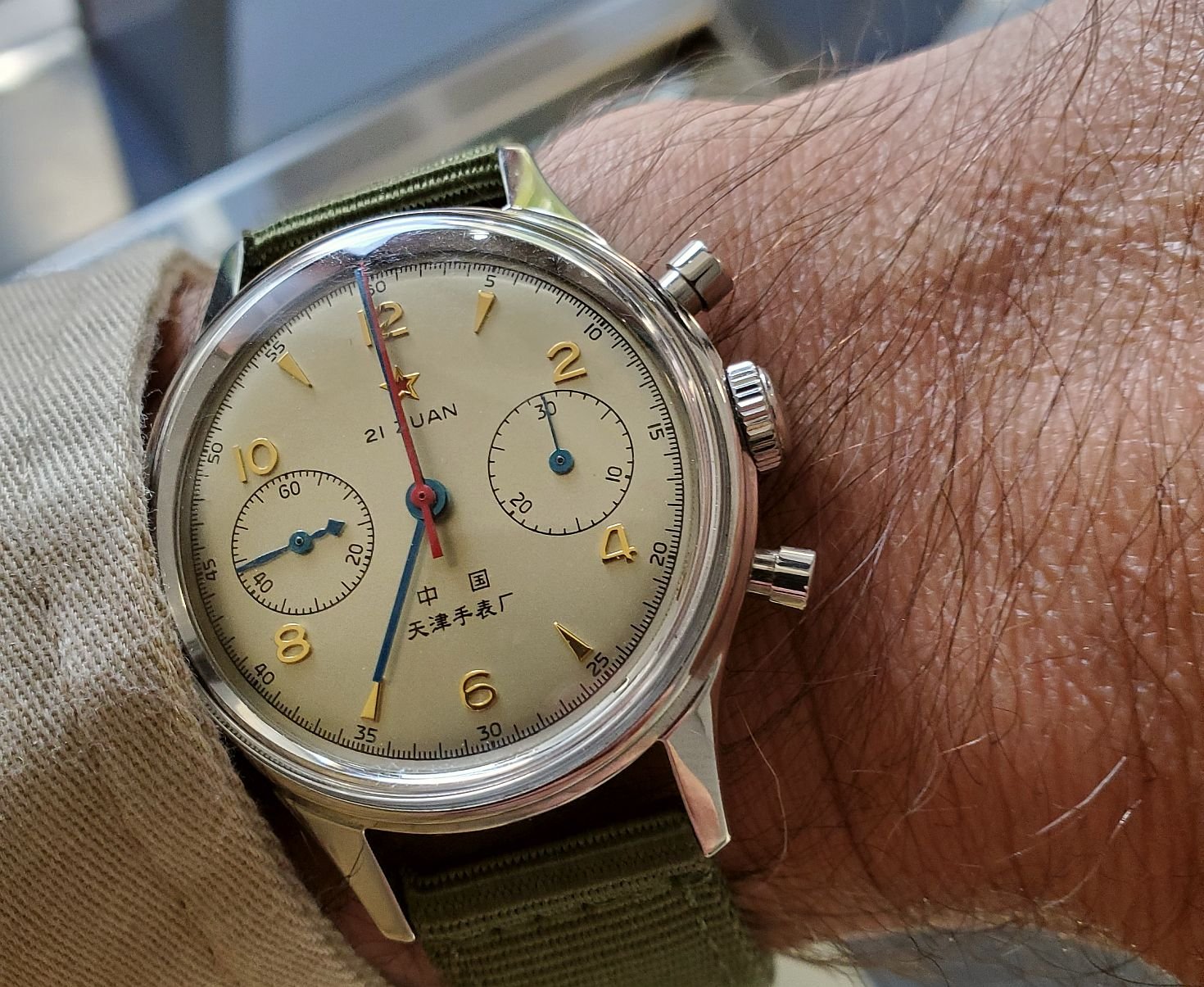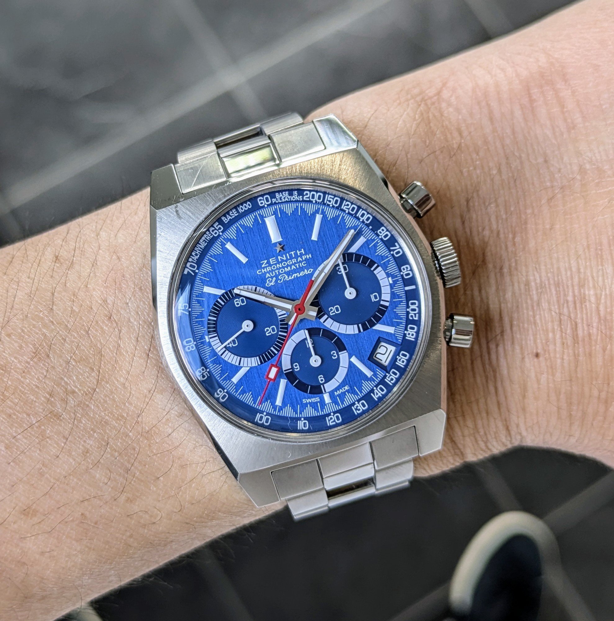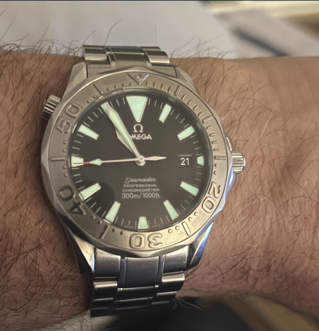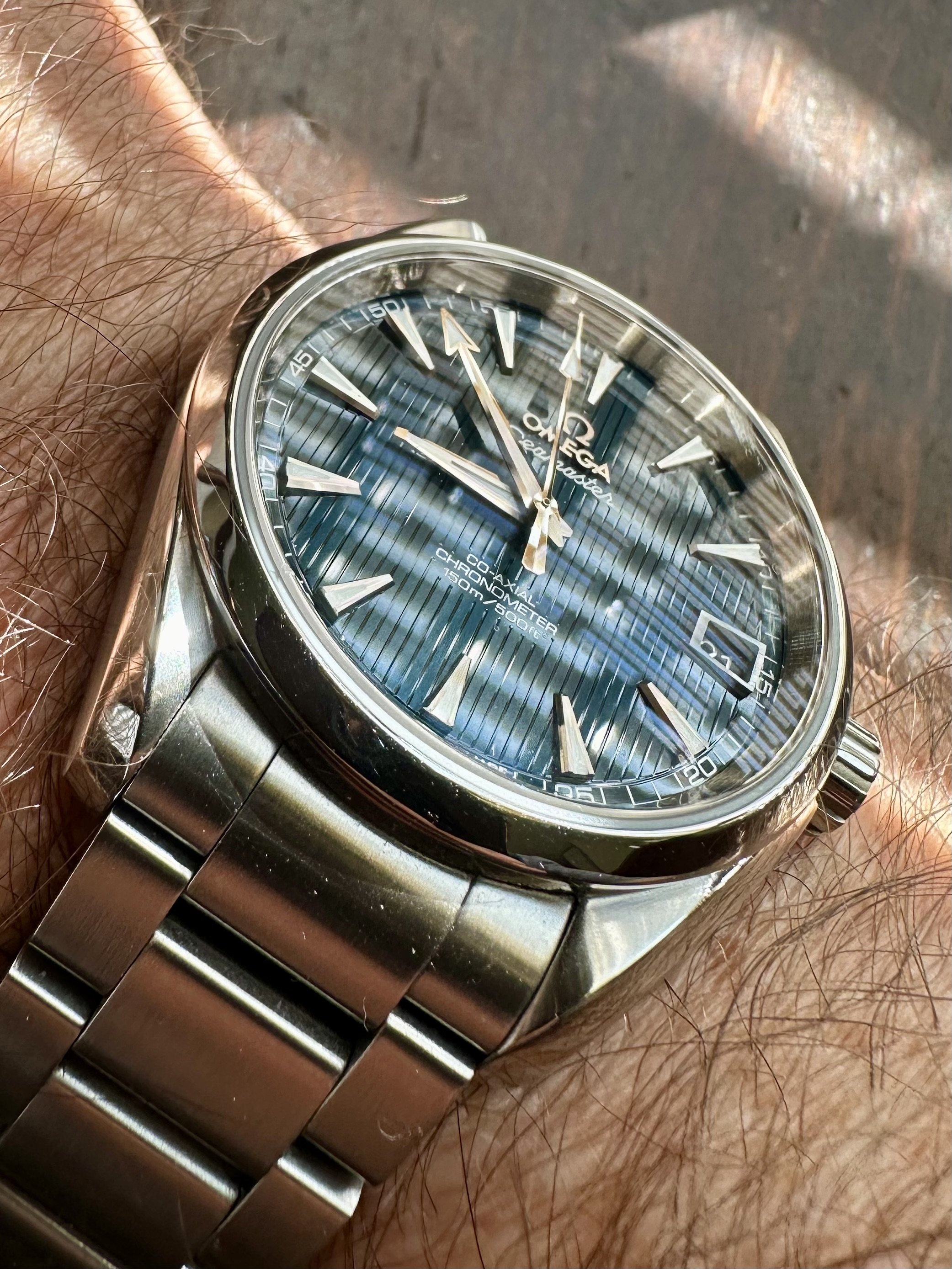 Good day all. The original 38.5 mm Aqua Terra Skyfall with blue vertical teak dial and white gold accents. Not an official Bond franchise/Omega promotional tie in watch, but this model was worn by Craig in some of the scenes in the film. Reportedly the watch worn in the film came from his personal collection and is one of his favorites.