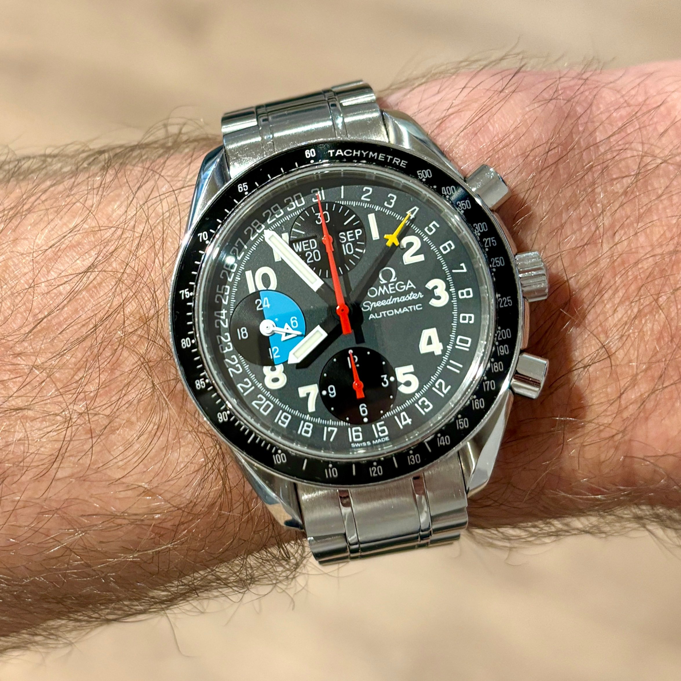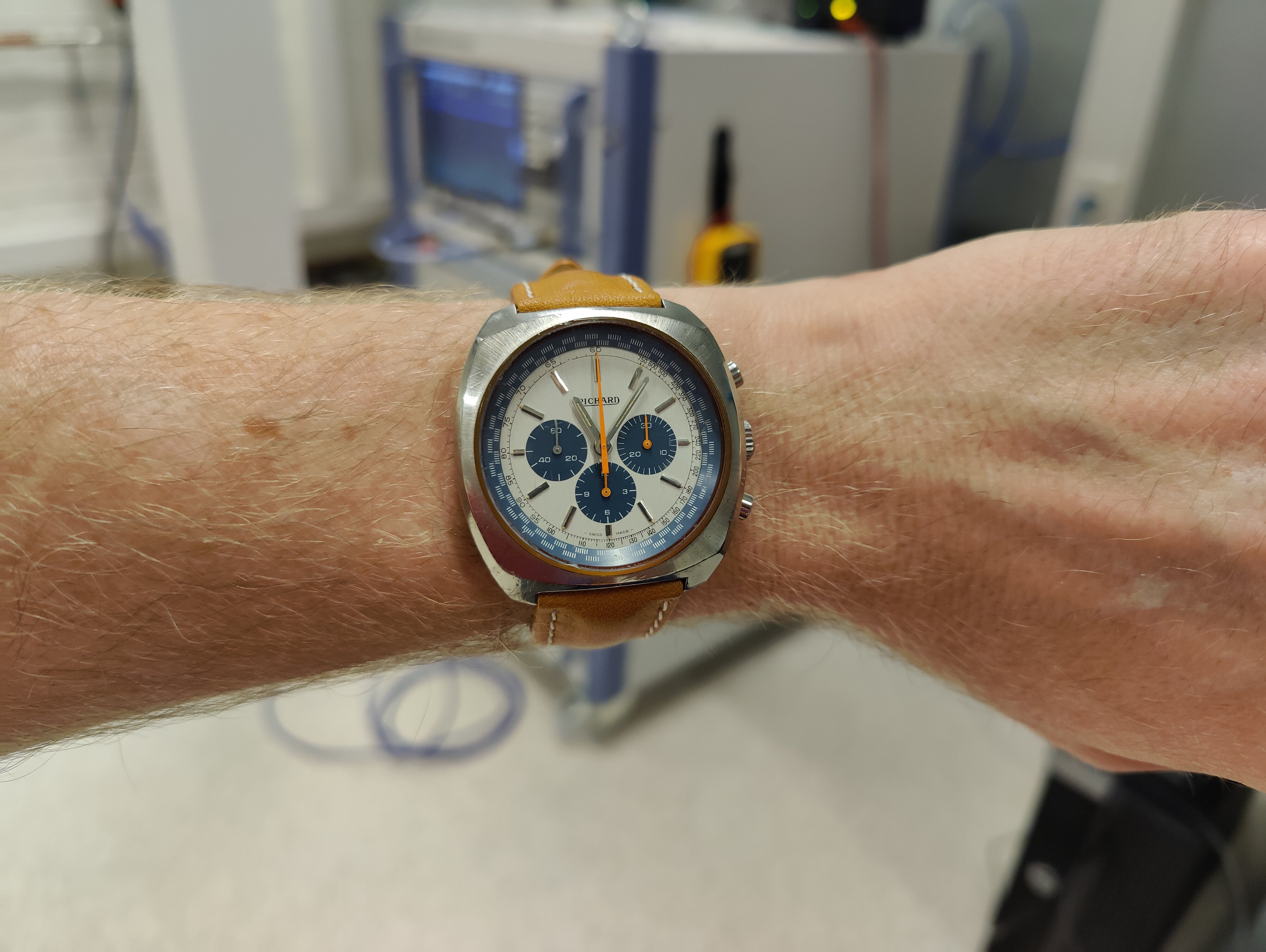 ·Just got this one, had to get one after @Barking mad posted a picture of his some time ago and I was lucky enough to find one myself! Really happy with this, looks great and adds a splash of color. Maybe a bit on the large side at 43 mm but I can live with that 😊 Lemania 1873, Speemaster quality for a lot less.