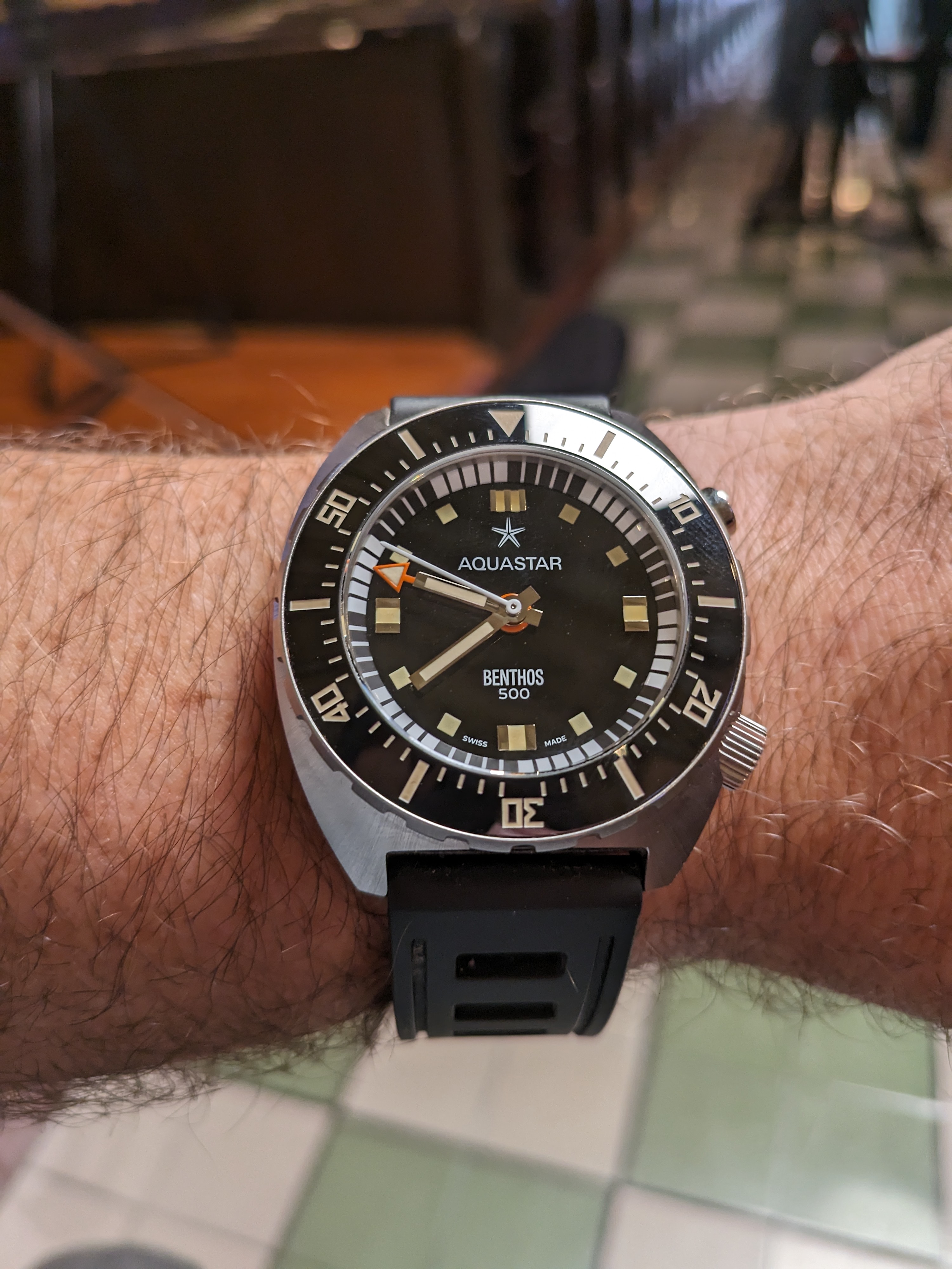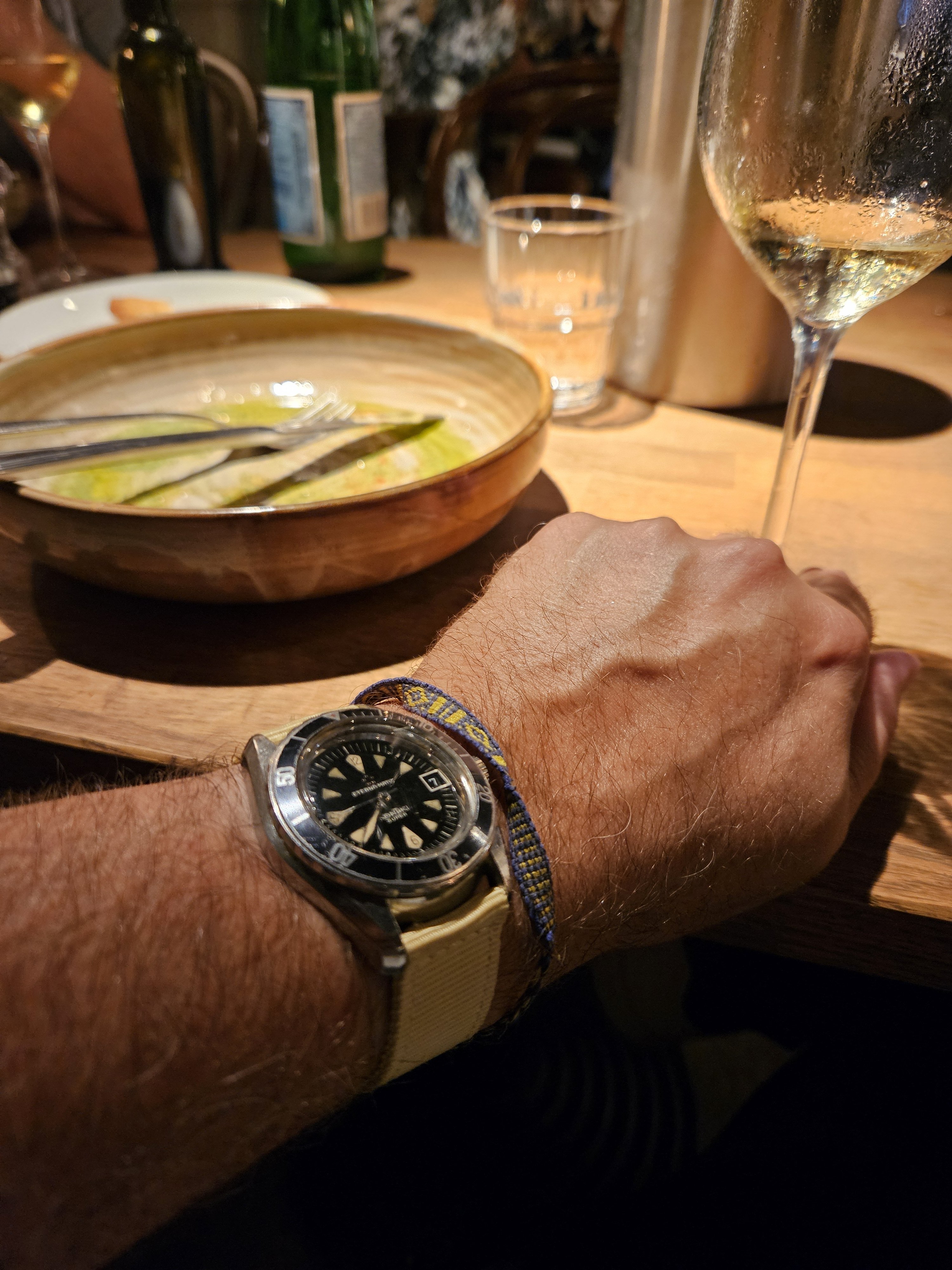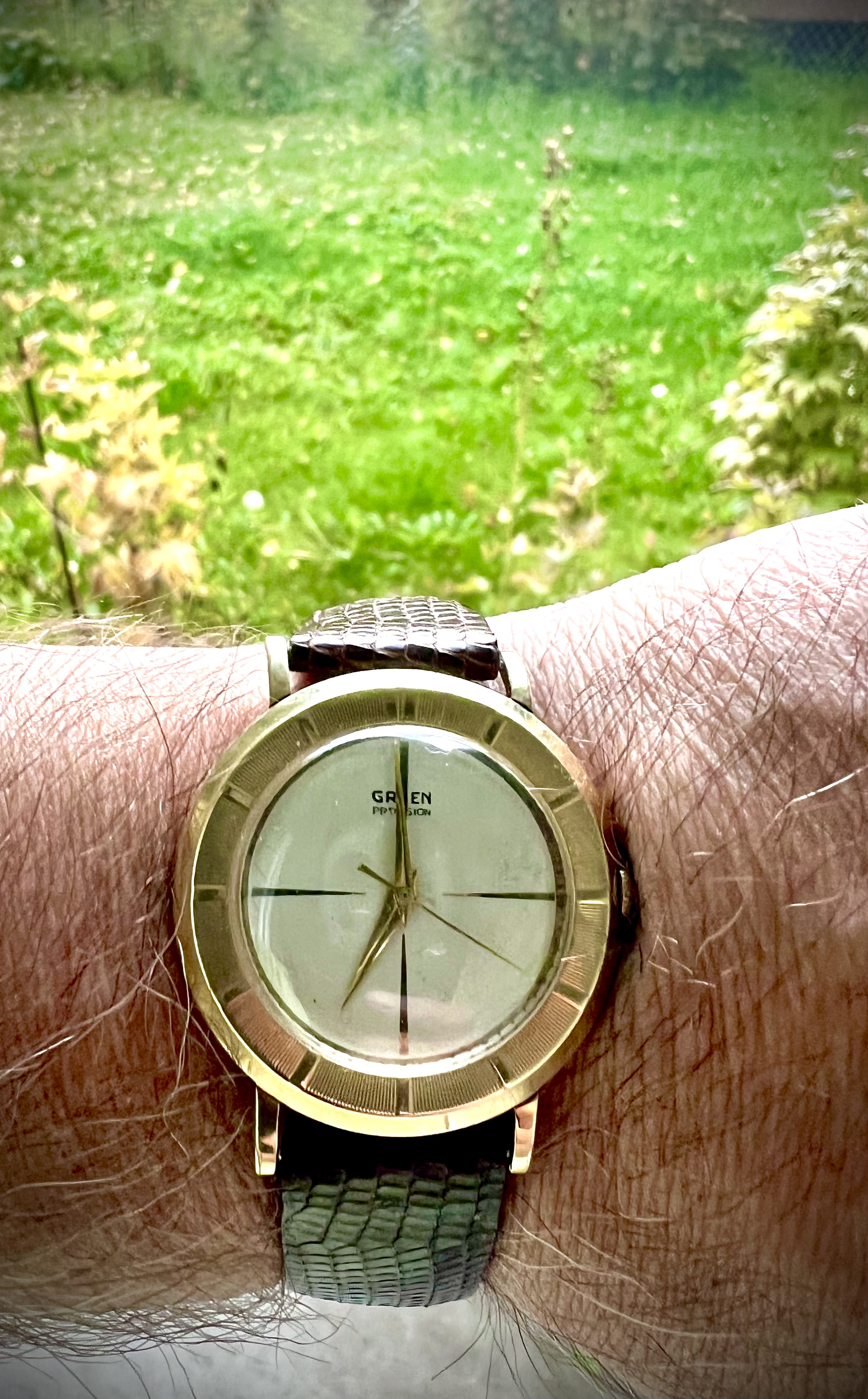 This is my first solid gold mechanical watch after I graduated from the Bulova Academy. It was a non-running eBay find caked in grime. This is the last remnant of the original collection. The Gruen Precision was one of the early bond watches and a mate to my 2581. I treasure it. It rests on an original period correct Gruen strap. I bought two when I sourced it and have a backup.