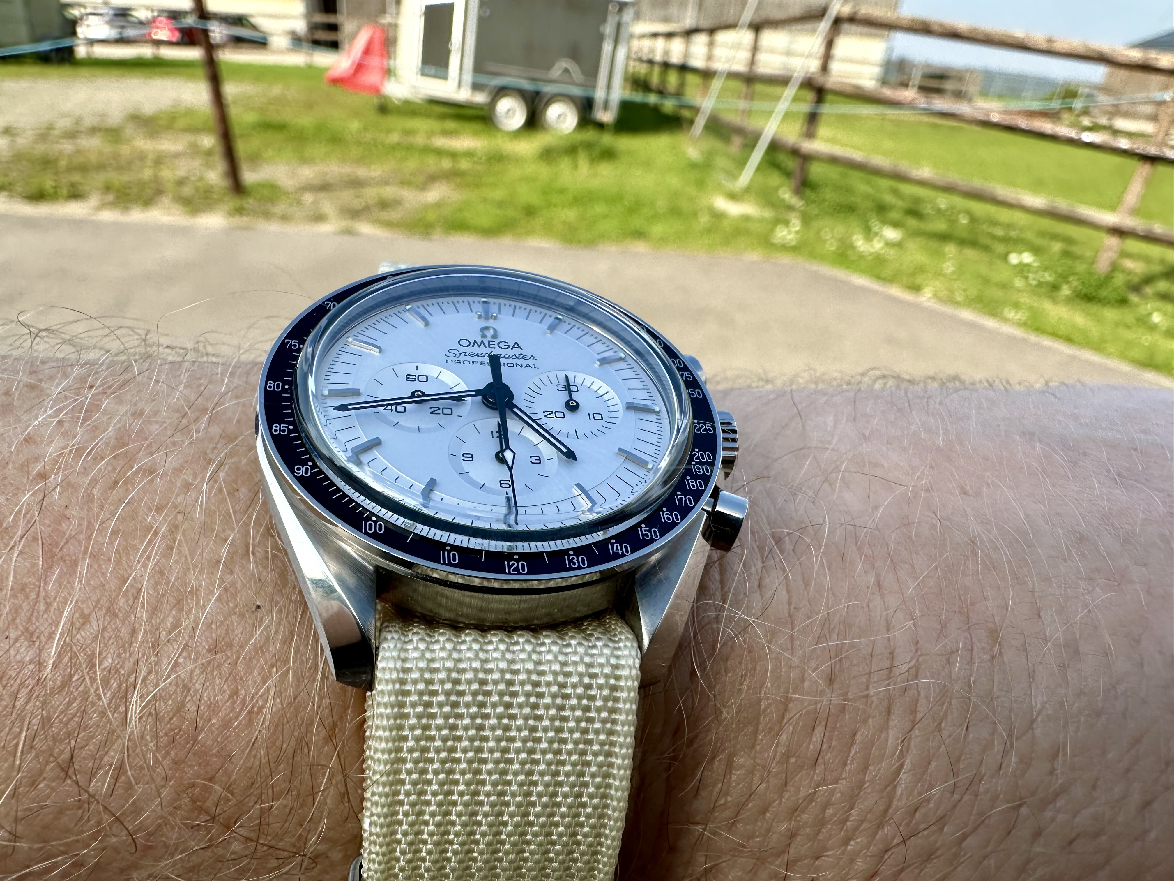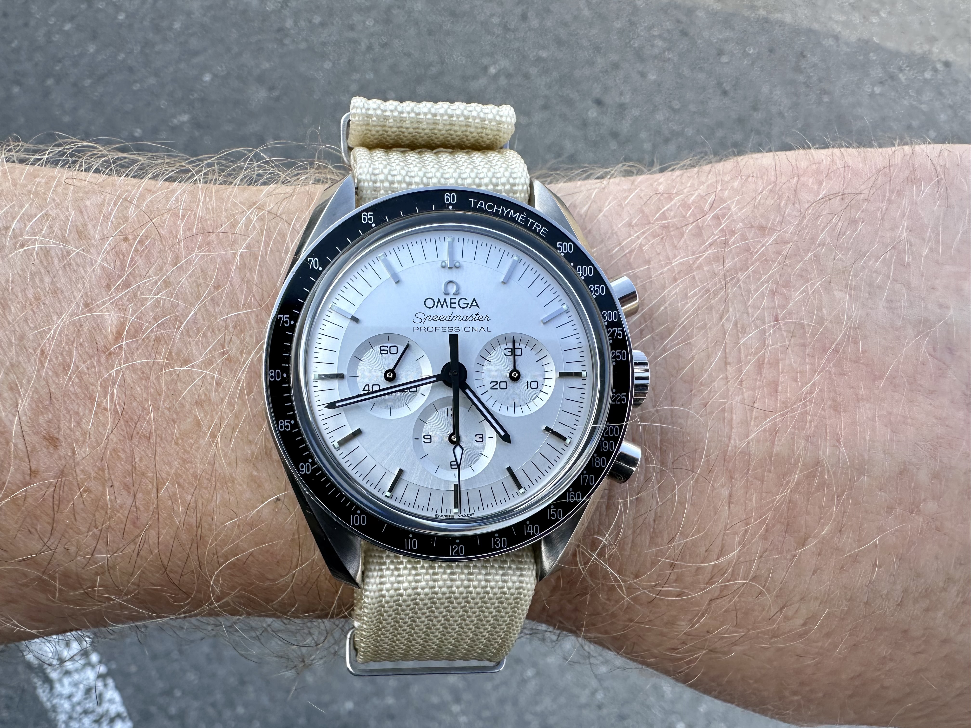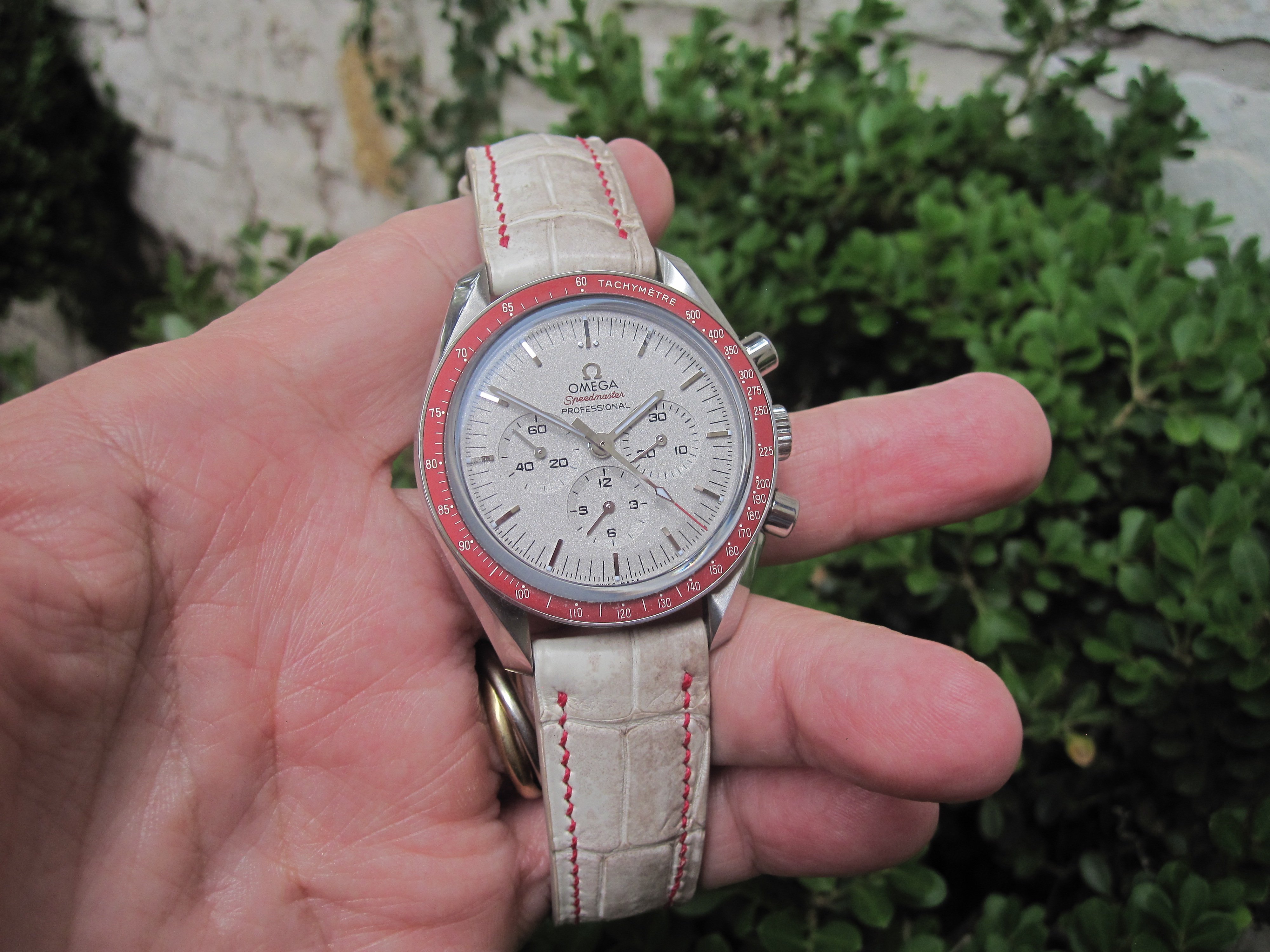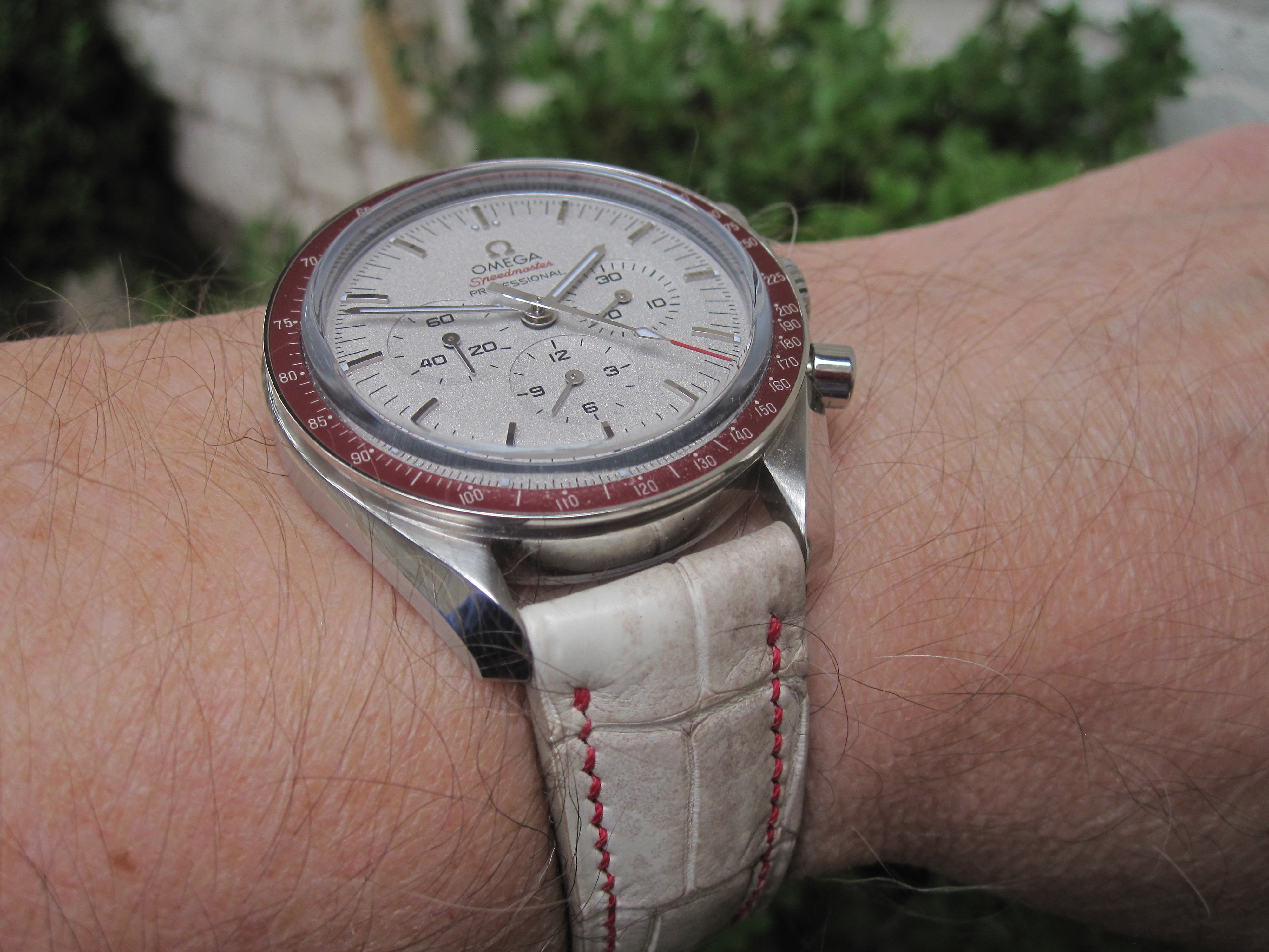 I think the 'Rising Sun' Speedmaster from 2018 is one of the sharpest versions out there, but I never cared for it on a bracelet. I once saw it on a Himalayan croc strap but that material is very hard to find. Finally got word from George at Genteel-Handmade that they had it back in stock. I think this is the most expensive strap I've ever owned, but it's a beautiful material. I use an Artem deployant buckle which I like better than the standard Omega DP.