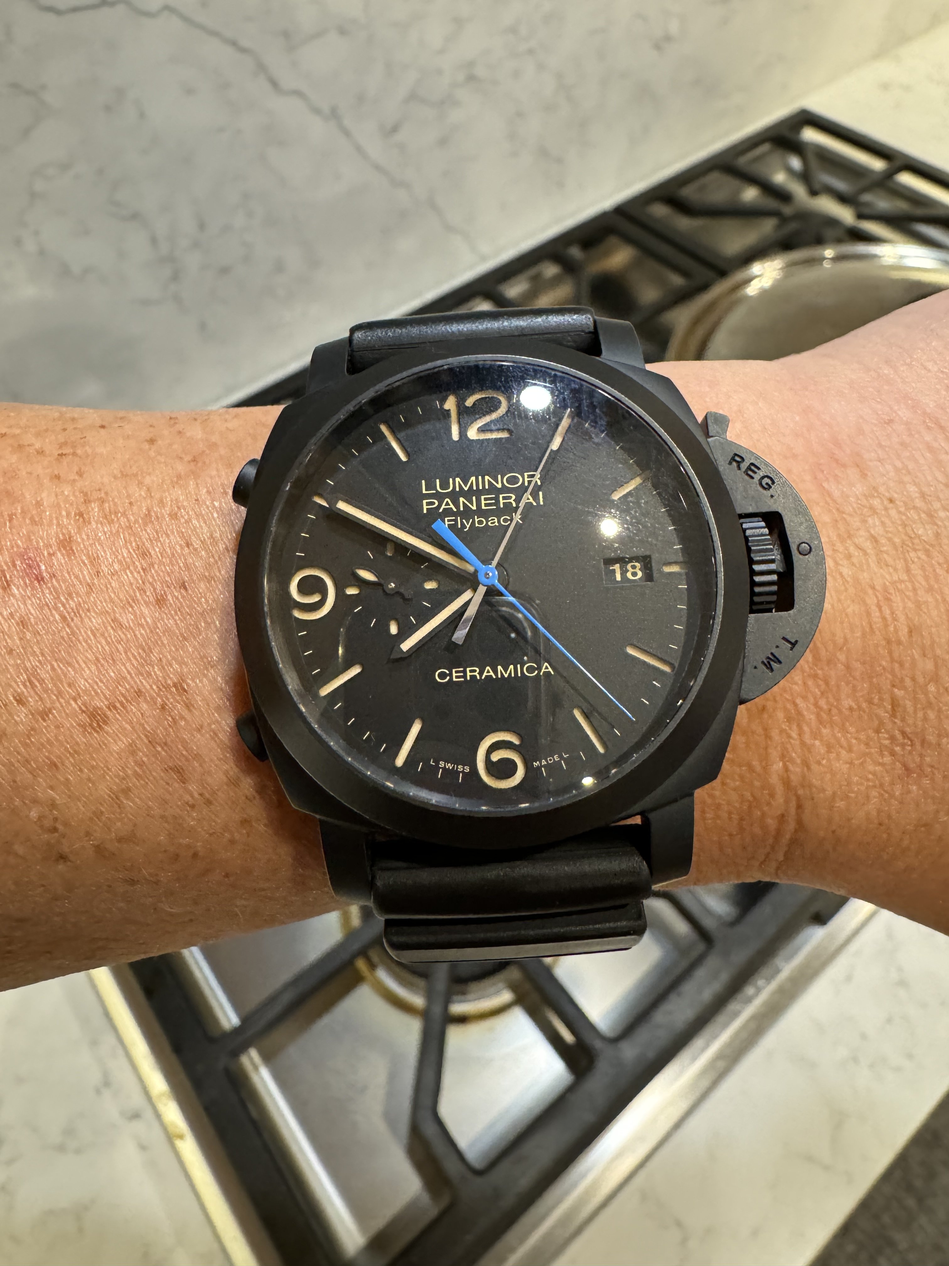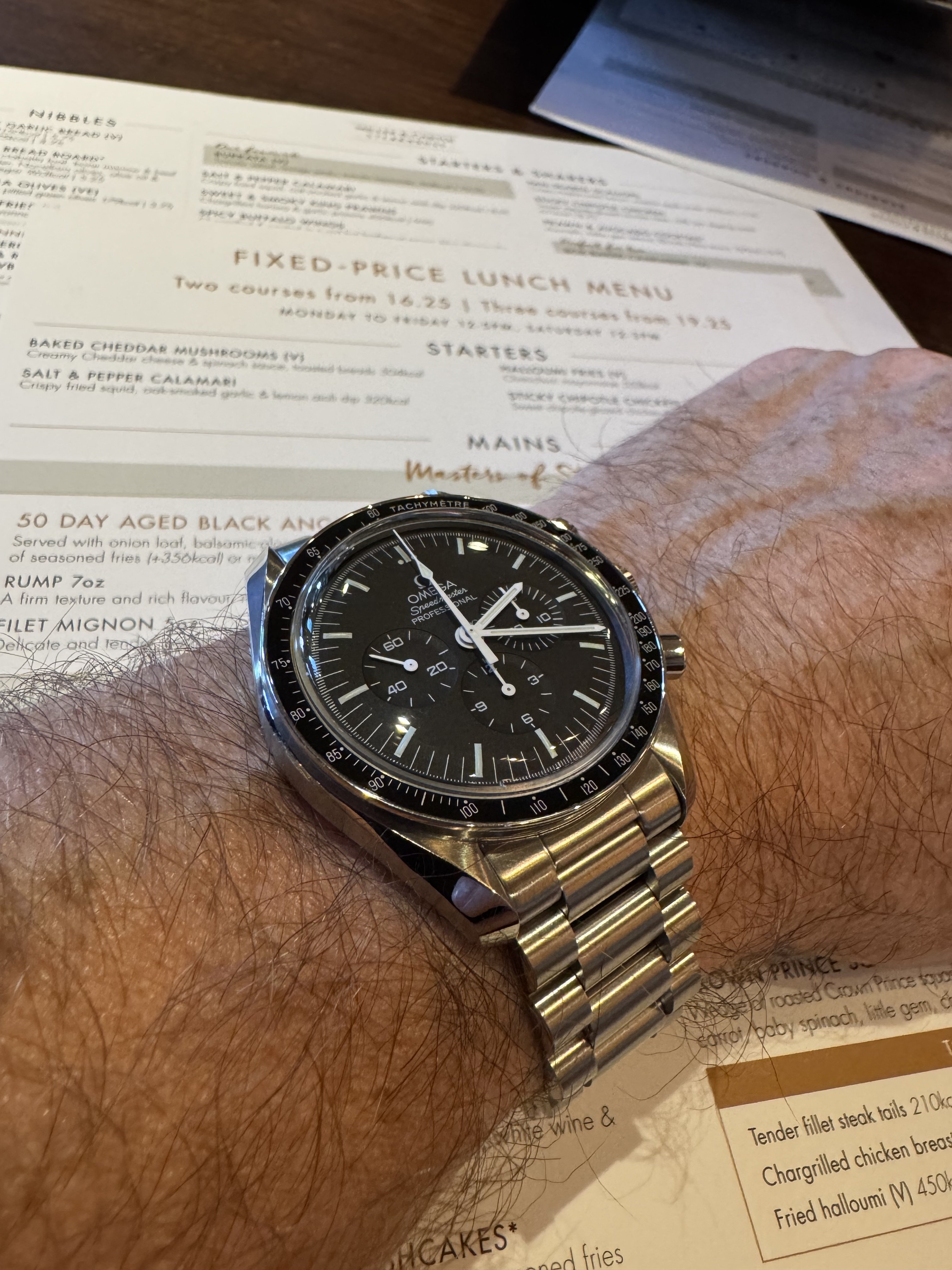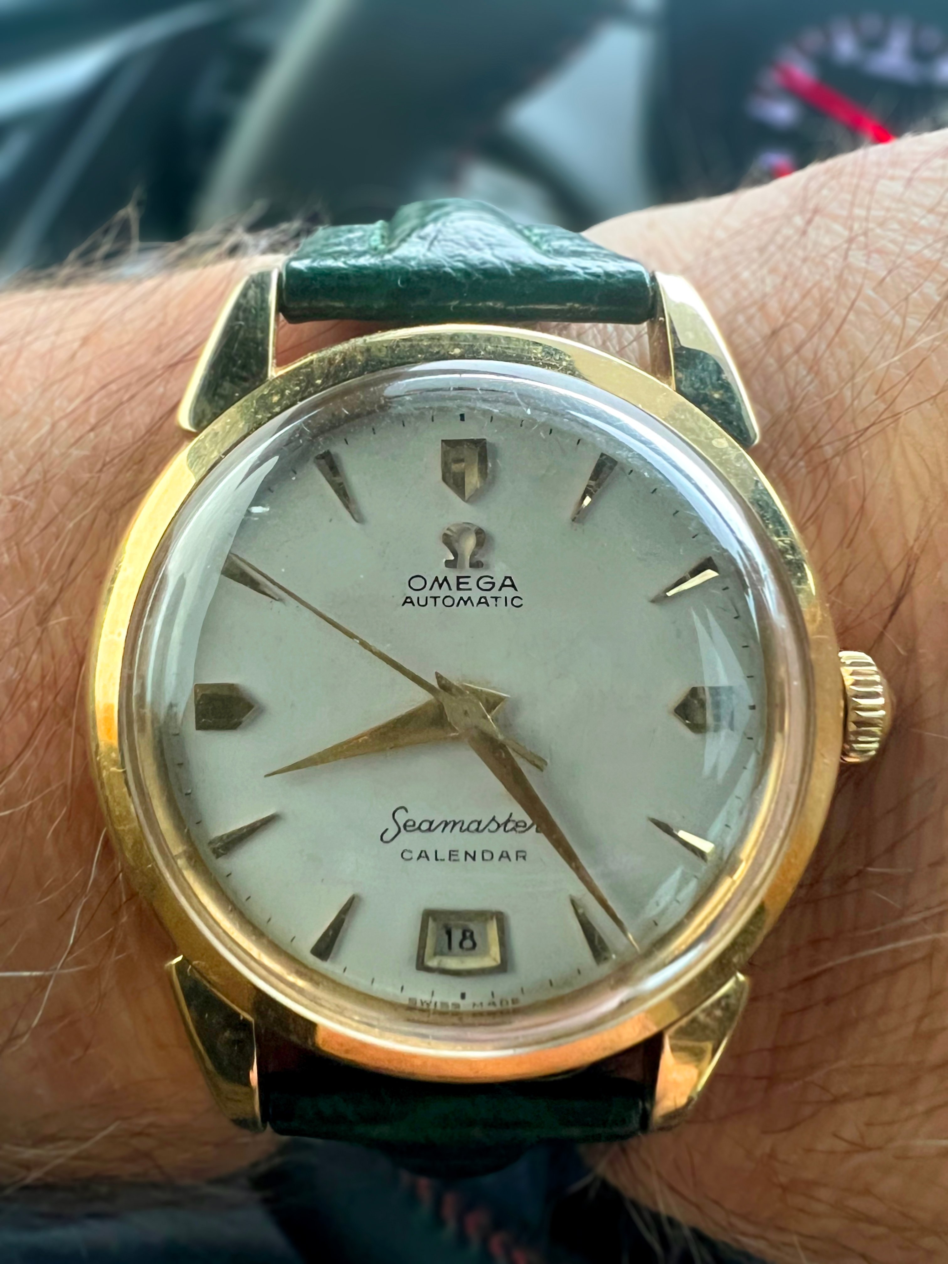 I think the 'Rising Sun' Speedmaster from 2018 is one of the sharpest versions out there, but I never cared for it on a bracelet. I once saw it on a Himalayan croc strap but that material is very hard to find. Finally got word from George at Genteel-Handmade that they had it back in stock. I think this is the most expensive strap I've ever owned, but it's a beautiful material. I use an Artem deployant buckle which I like better than the standard Omega DP.