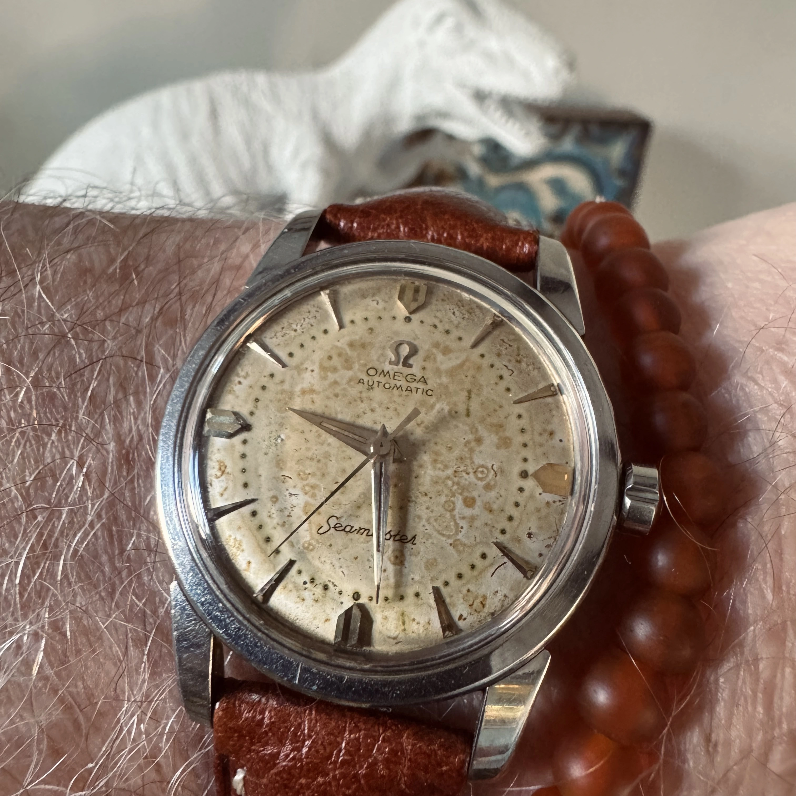 Posts 671 Likes 7,388 Boojumhunter ·Oct 13, 2024 1958 Seamaster. Snakeskin patina less obvious on the wrist, but I love it.