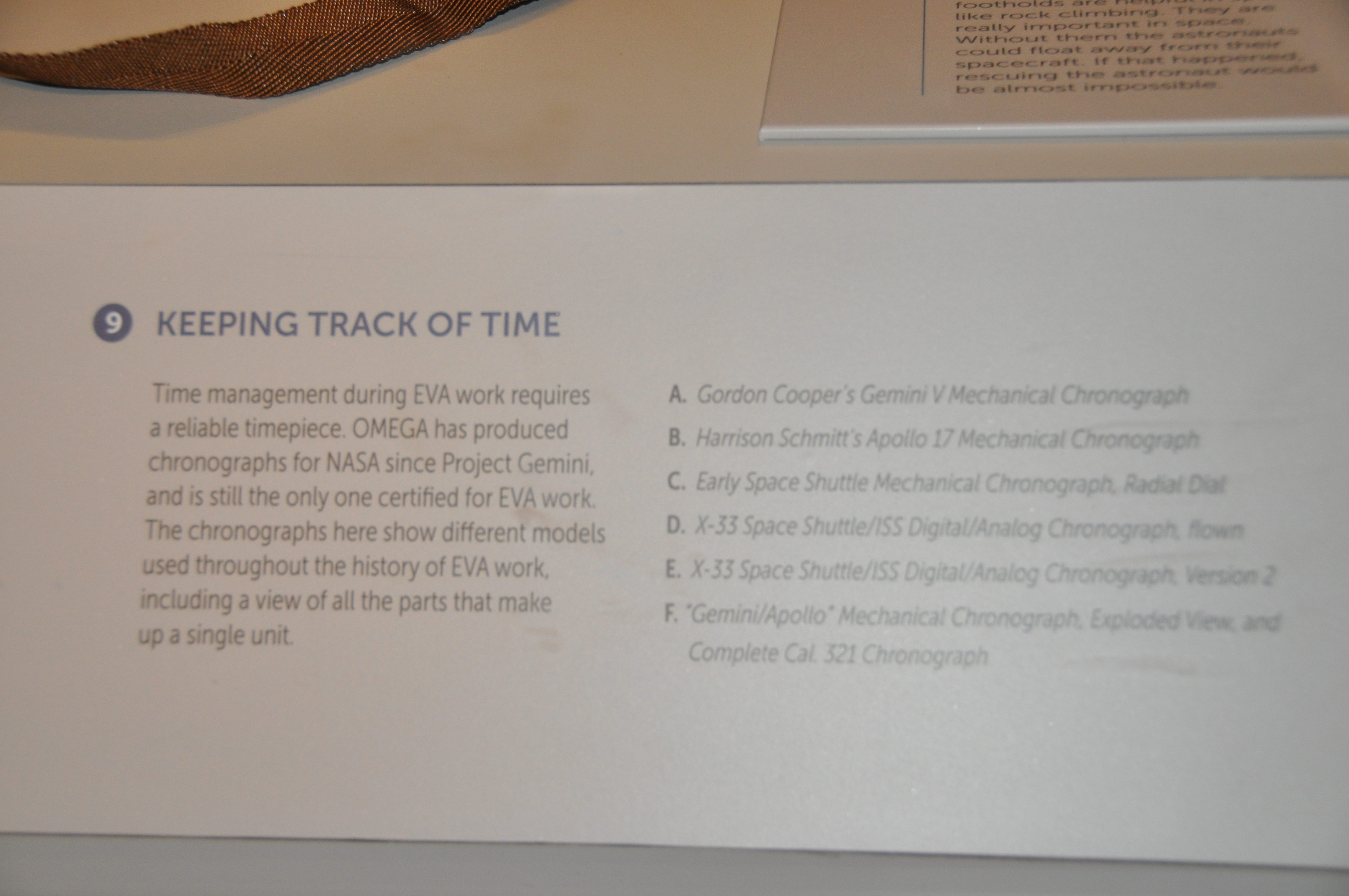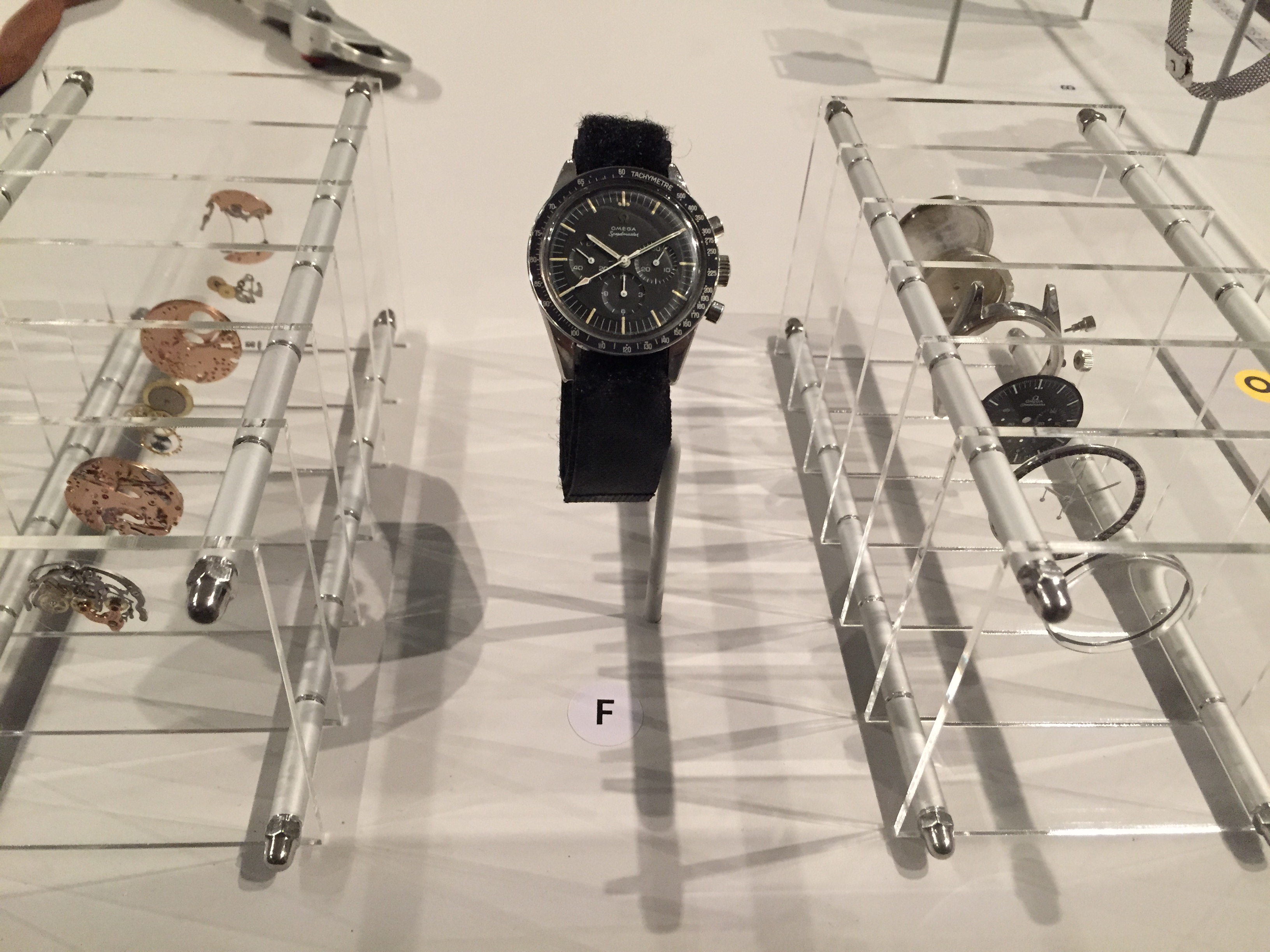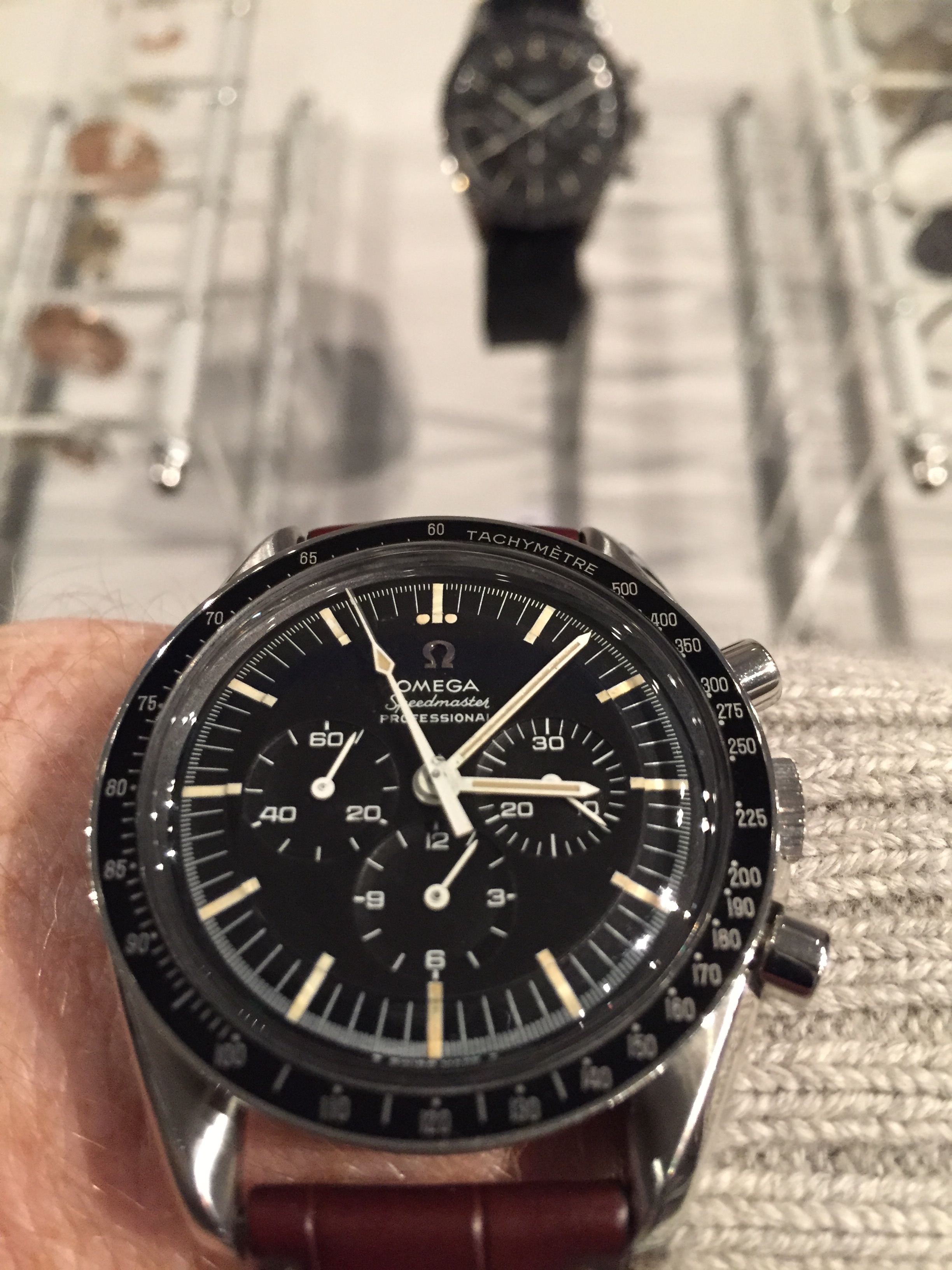 During my recent visit to Washington DC. Had an opportunity to visit the Smithsonian National Air & Space Museum and see some of the Speedies that they had on display. A bit disappointing that they didn't have any of the original Apollo 11 watches on display. They seem to have them on loan somewhere else. Currently on display was Harrison Schmitt's Apollo 17 moon watch. Here is a shot of my '68 pre-moon transitional being introduced to his older cousins.