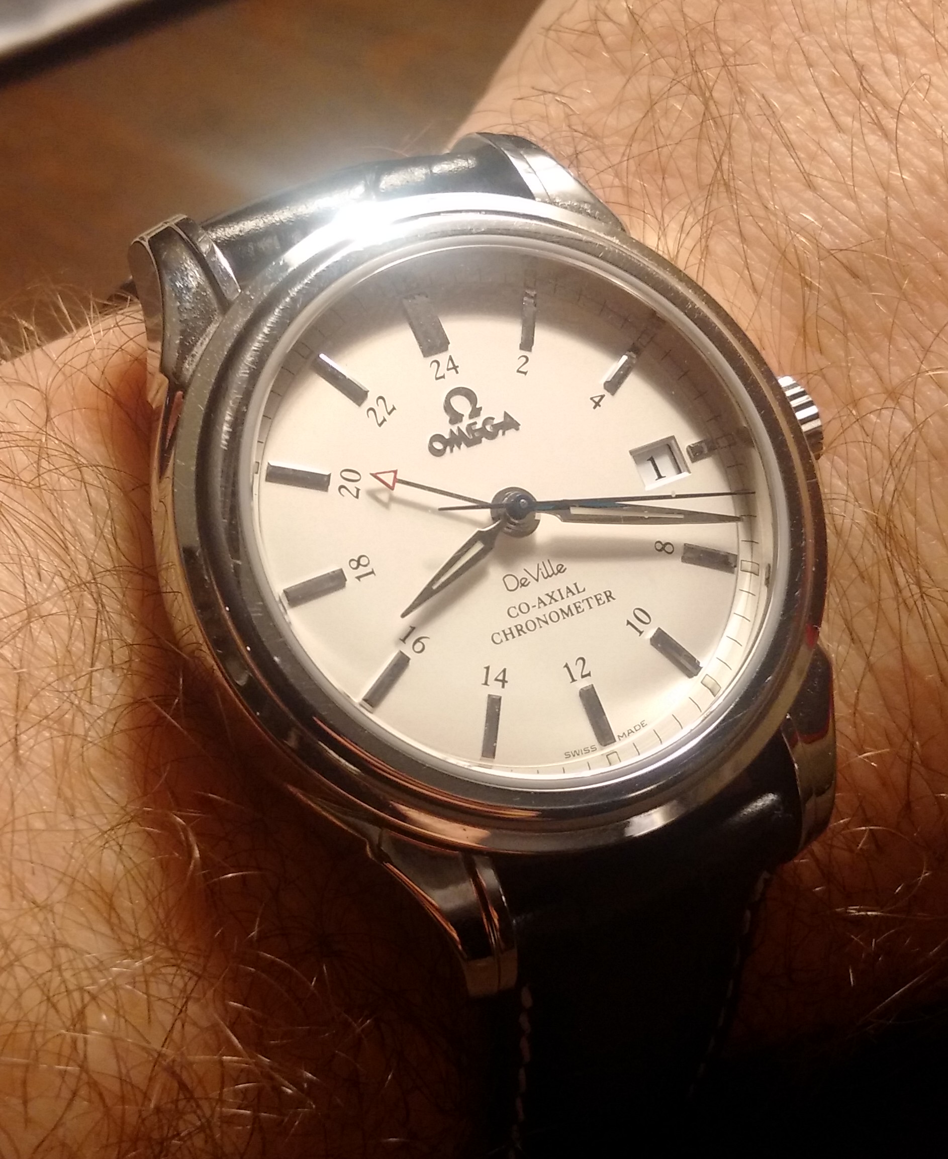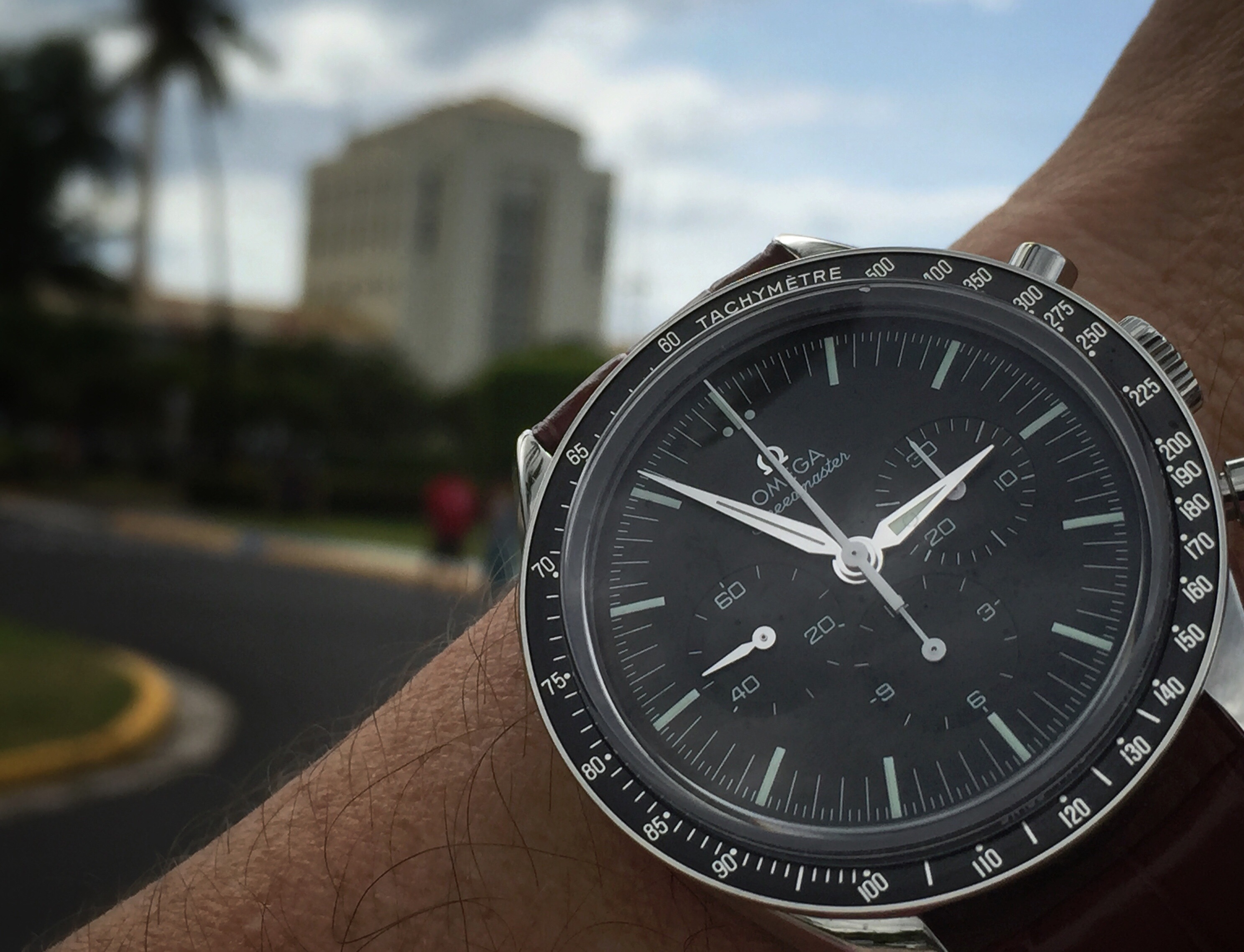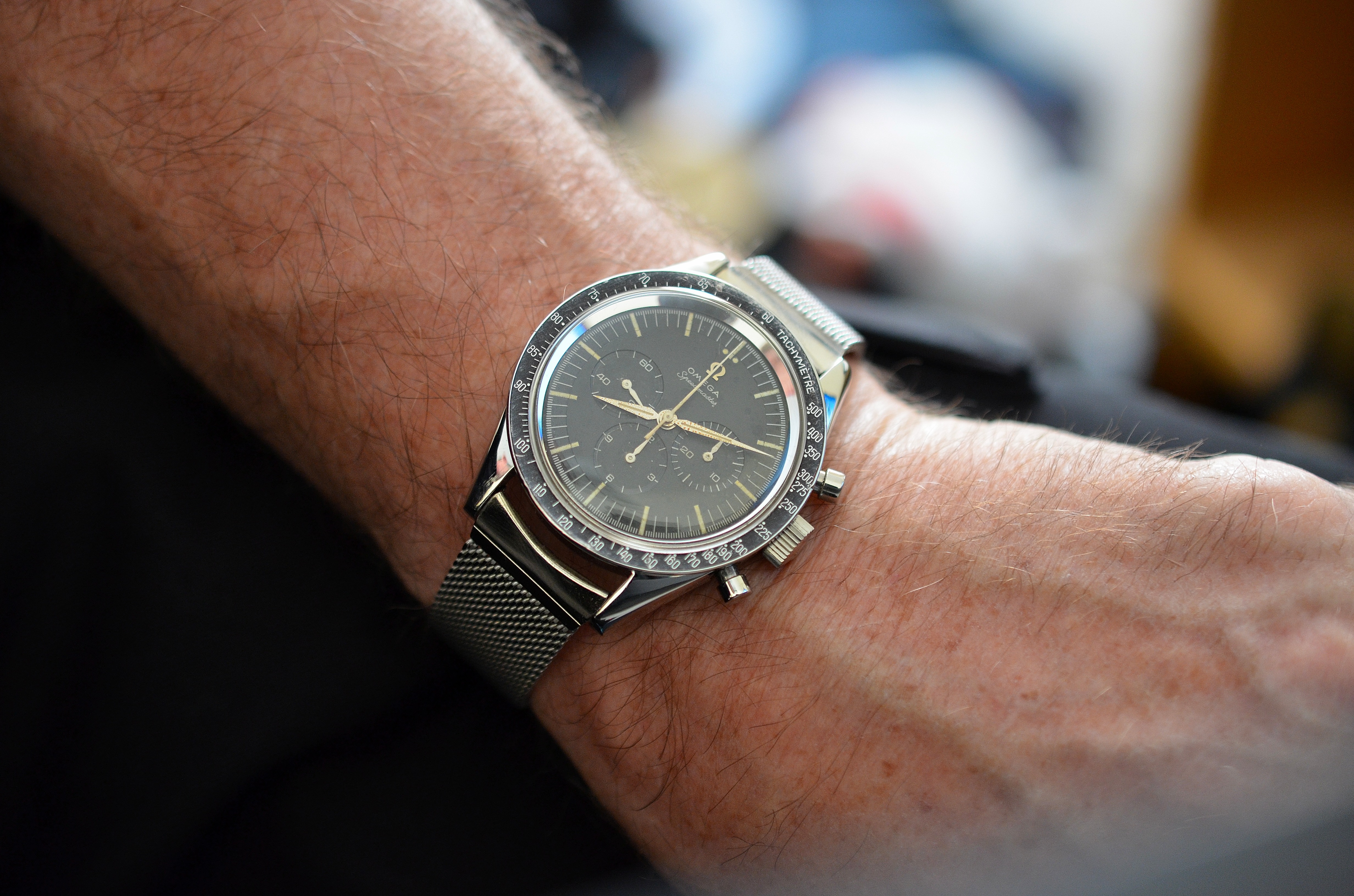 During my recent visit to Washington DC. Had an opportunity to visit the Smithsonian National Air & Space Museum and see some of the Speedies that they had on display. A bit disappointing that they didn't have any of the original Apollo 11 watches on display. They seem to have them on loan somewhere else. Currently on display was Harrison Schmitt's Apollo 17 moon watch. Here is a shot of my '68 pre-moon transitional being introduced to his older cousins.