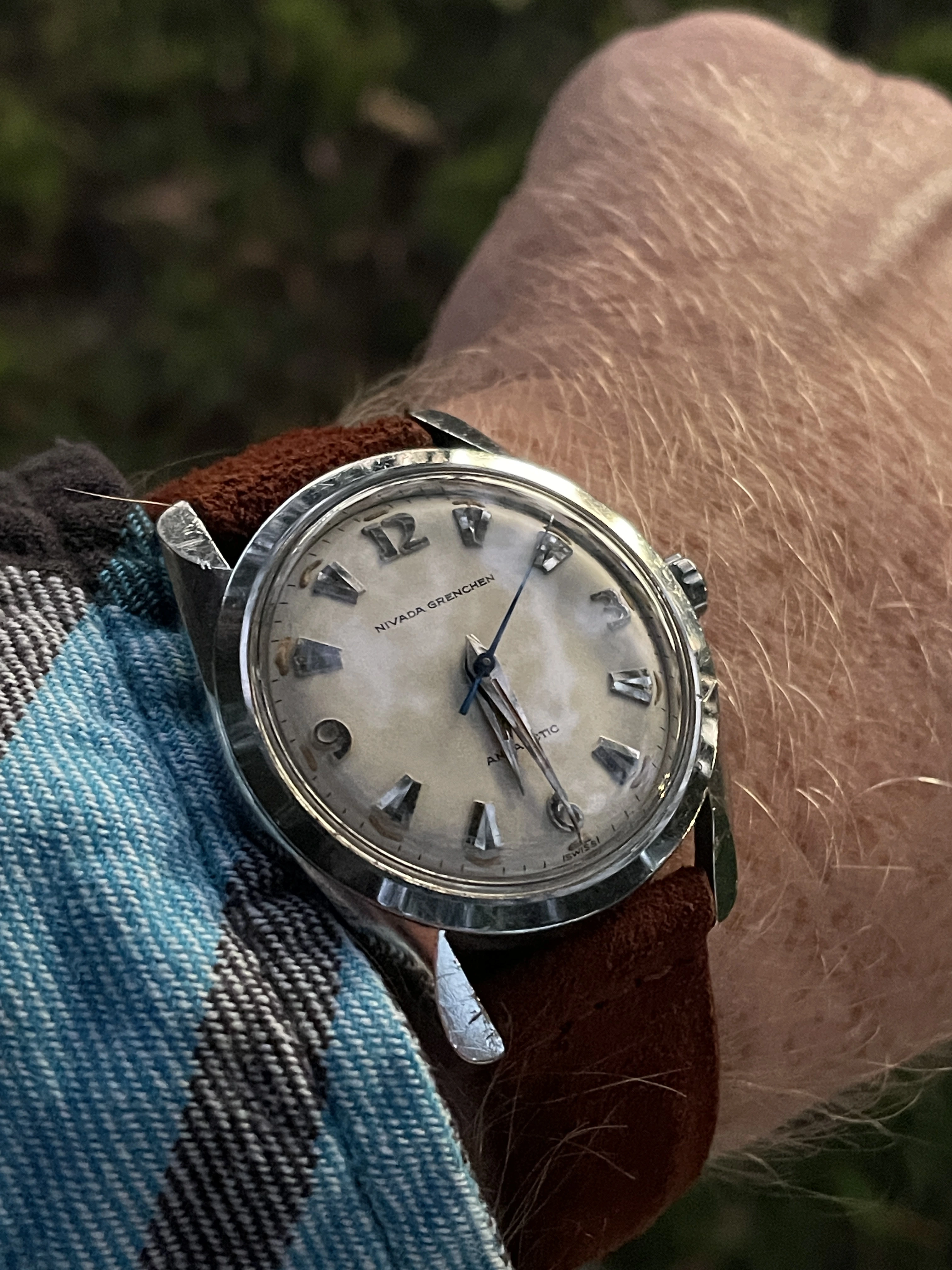 New to me ol’ Nivada Grenchen Antarctic, out in the wrist to walk the dog this afternoon. From what I understand but the movement caliber, dial texture, and font style, it’s an early iteration of the reference.