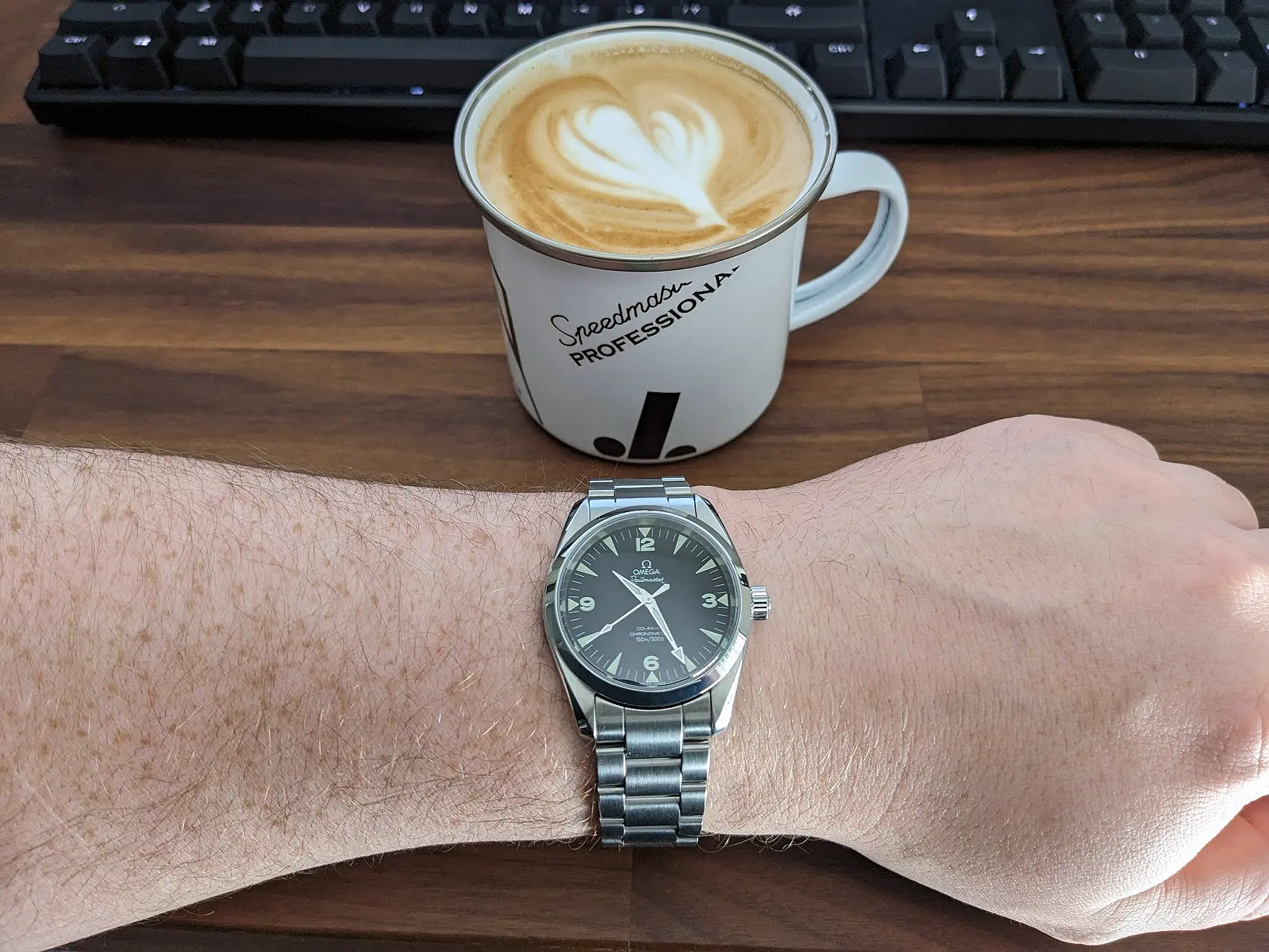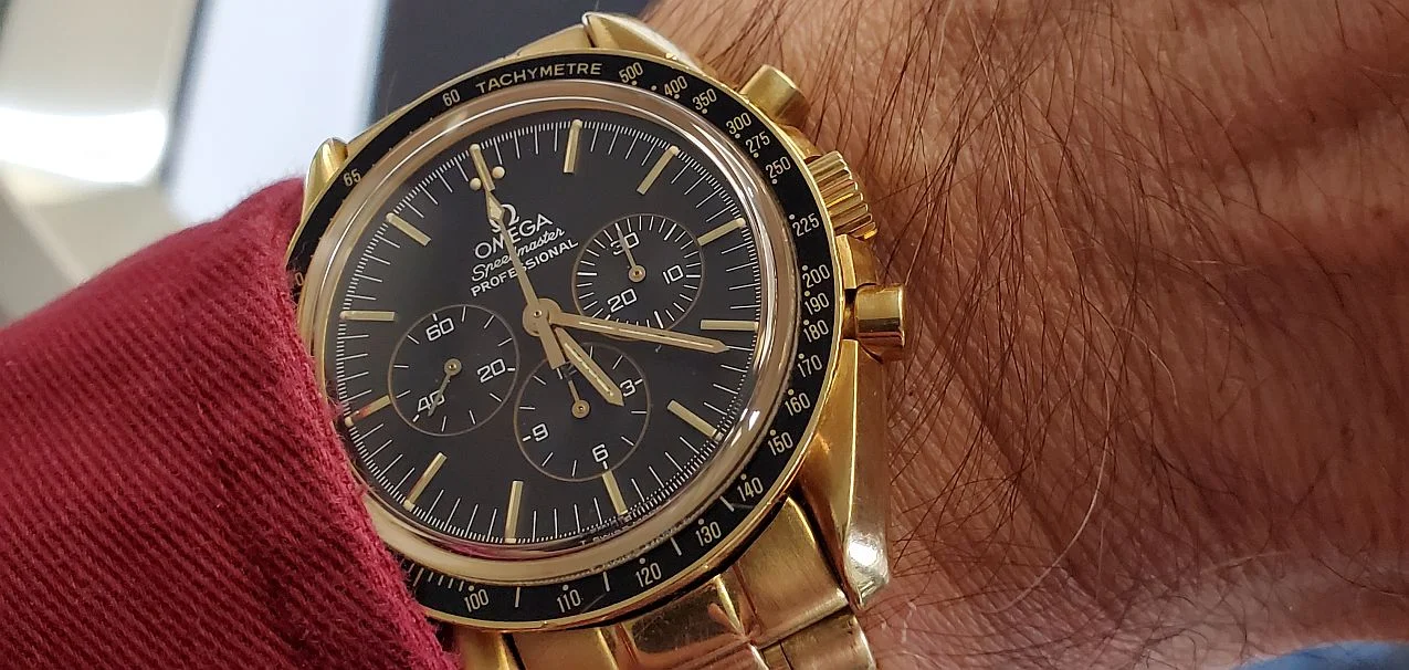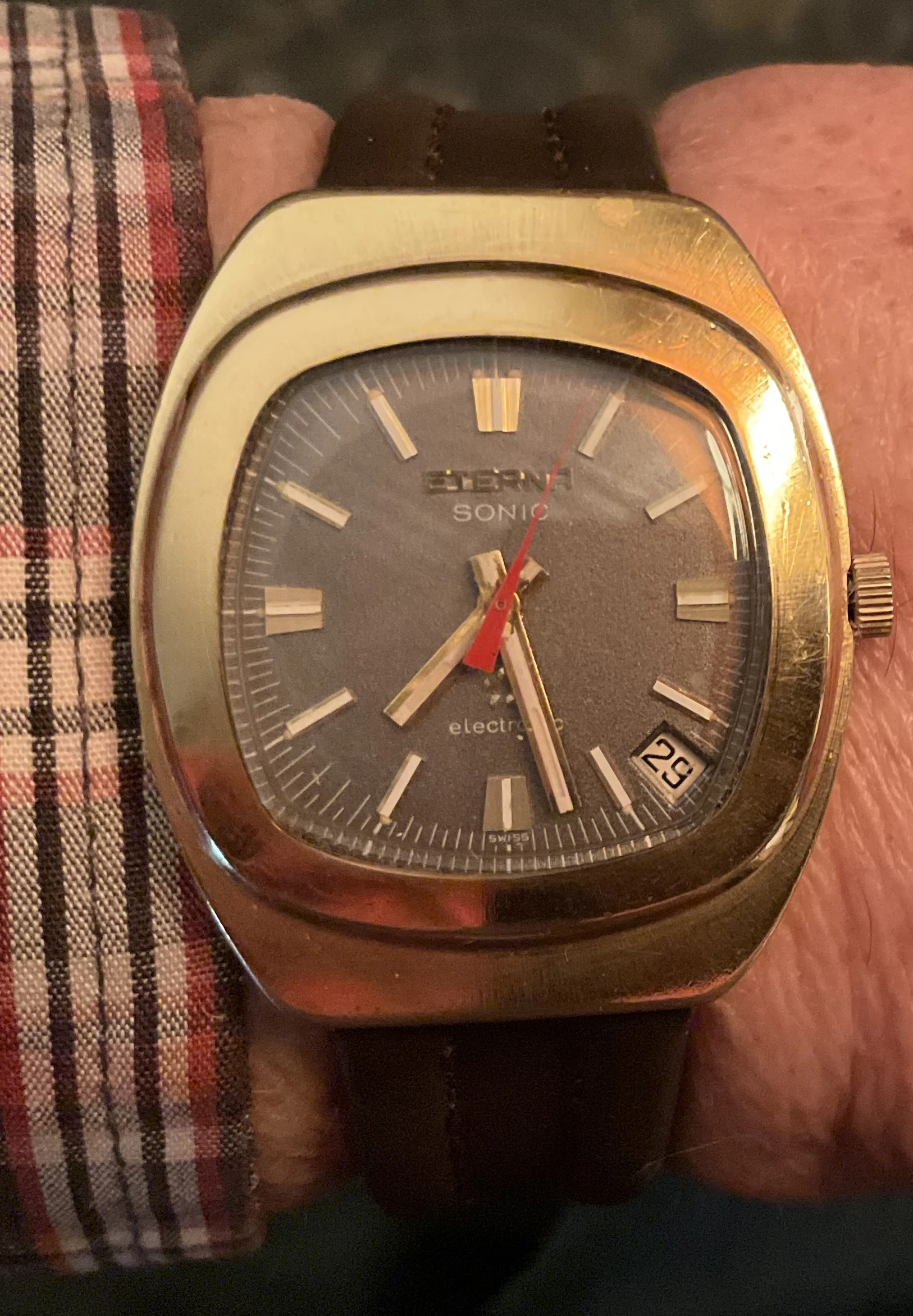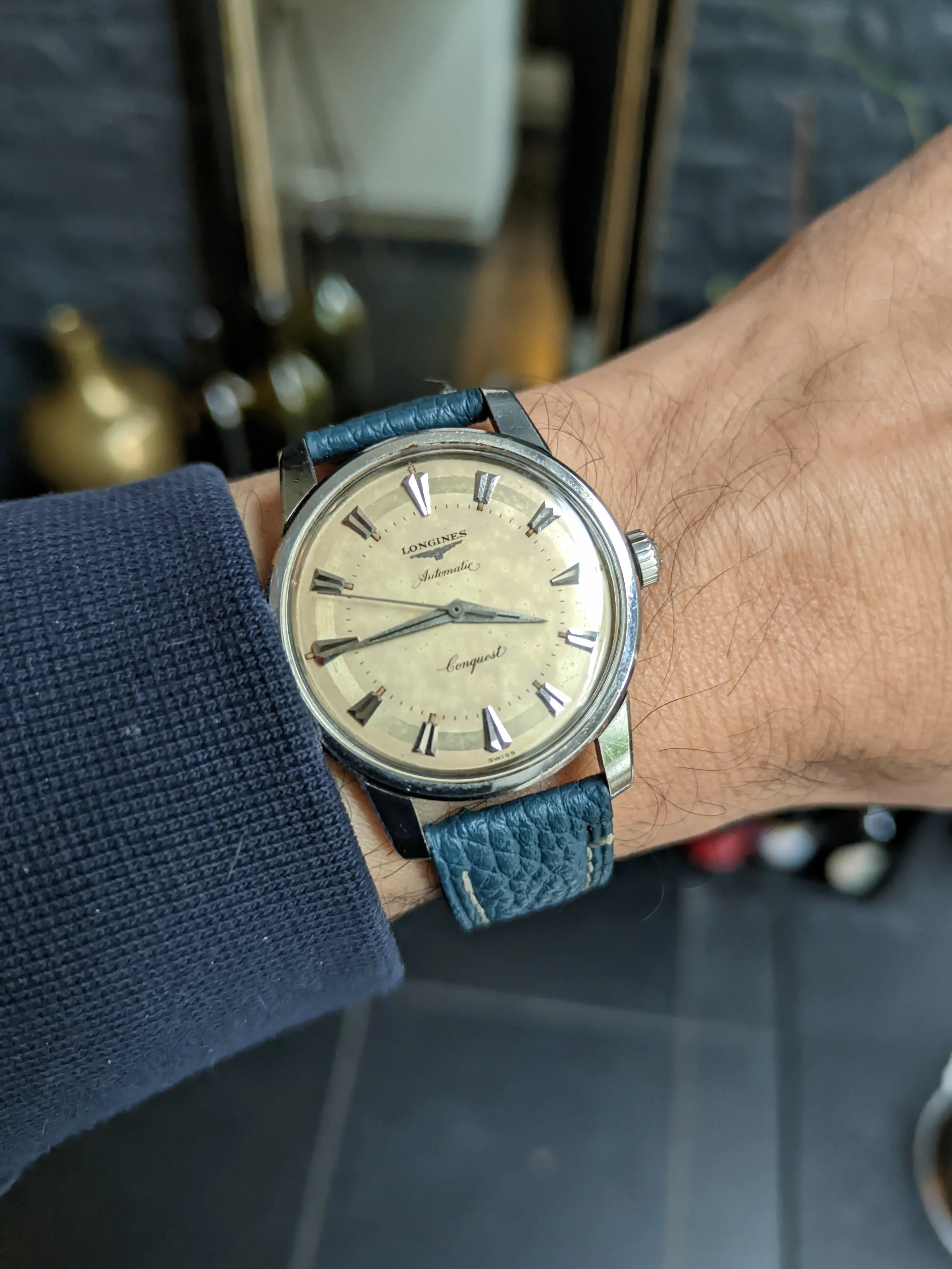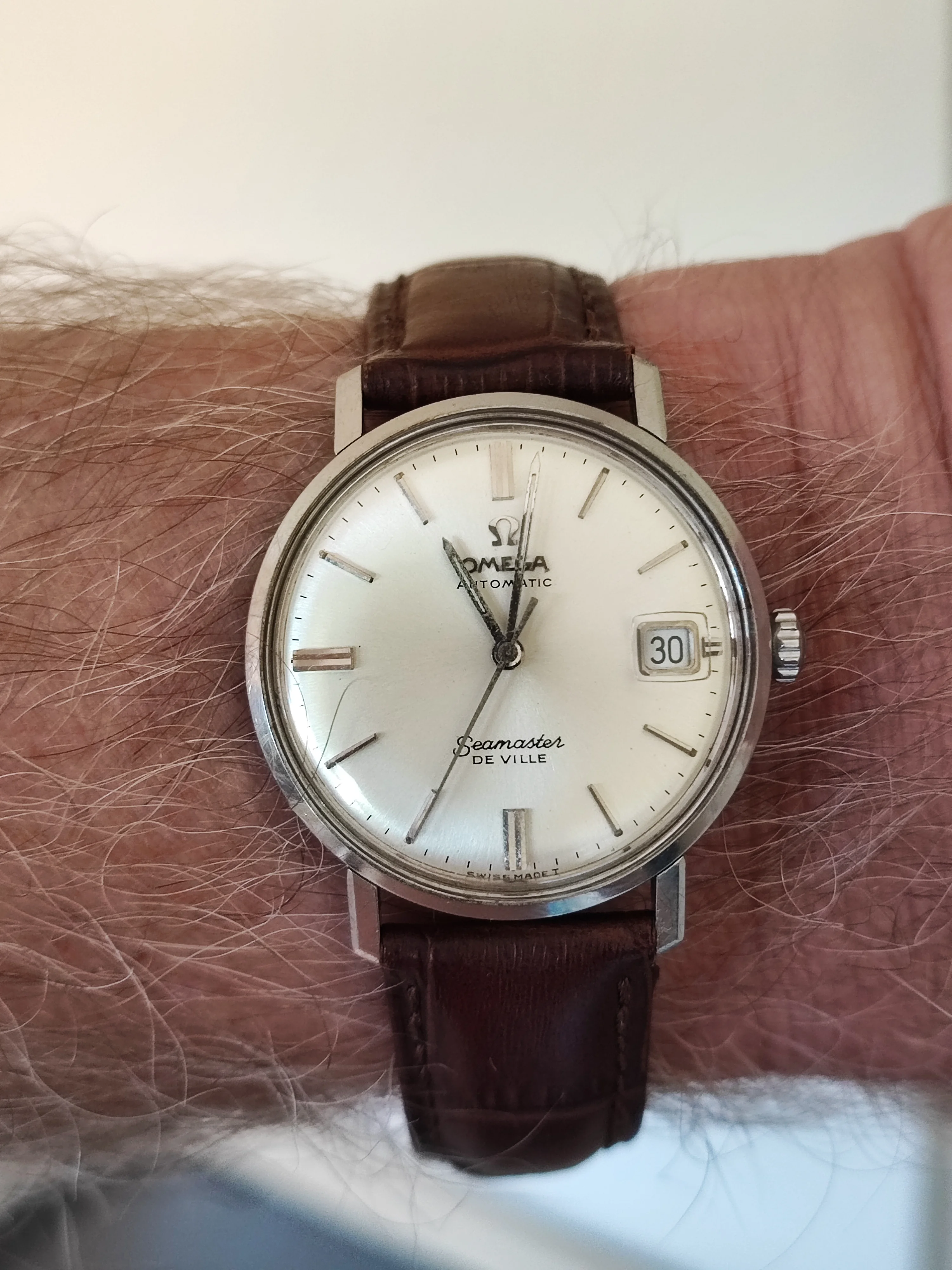 I had coffee with a member of the O B today. He’s local, and upon retirement, he has discovered watches. His collection at the moment comprises several Omegas, several Seikos, a vintage Tudor, and the watch he was wearing is the modern Tudor chronometer with the in-house movement. I took my Rolexes, Omegas, Accutrons, my private label 1883, 18-size Waltham pocket watch. I wore two wrist watches. My Accutron 214 with the double hour hand I posted recently, and my F300 Eterna in an unusual style, sporting a taupe dial. Dam I love this watch!